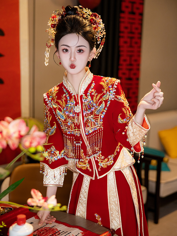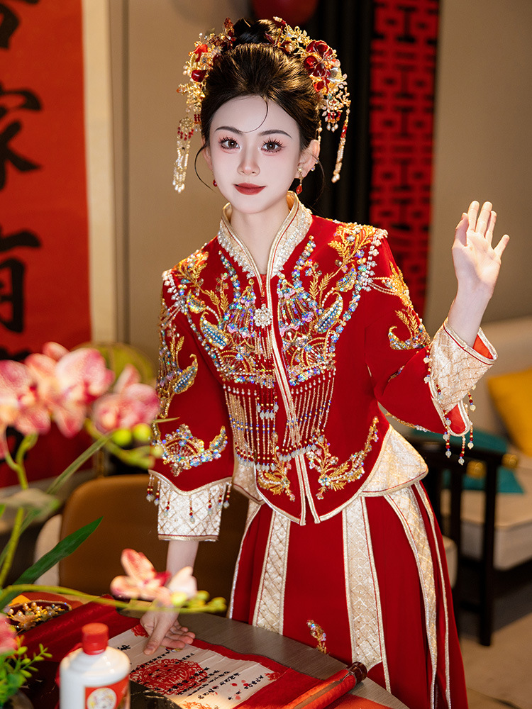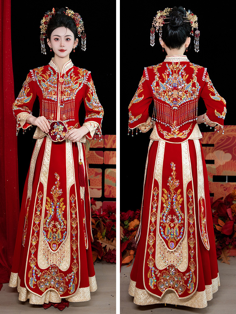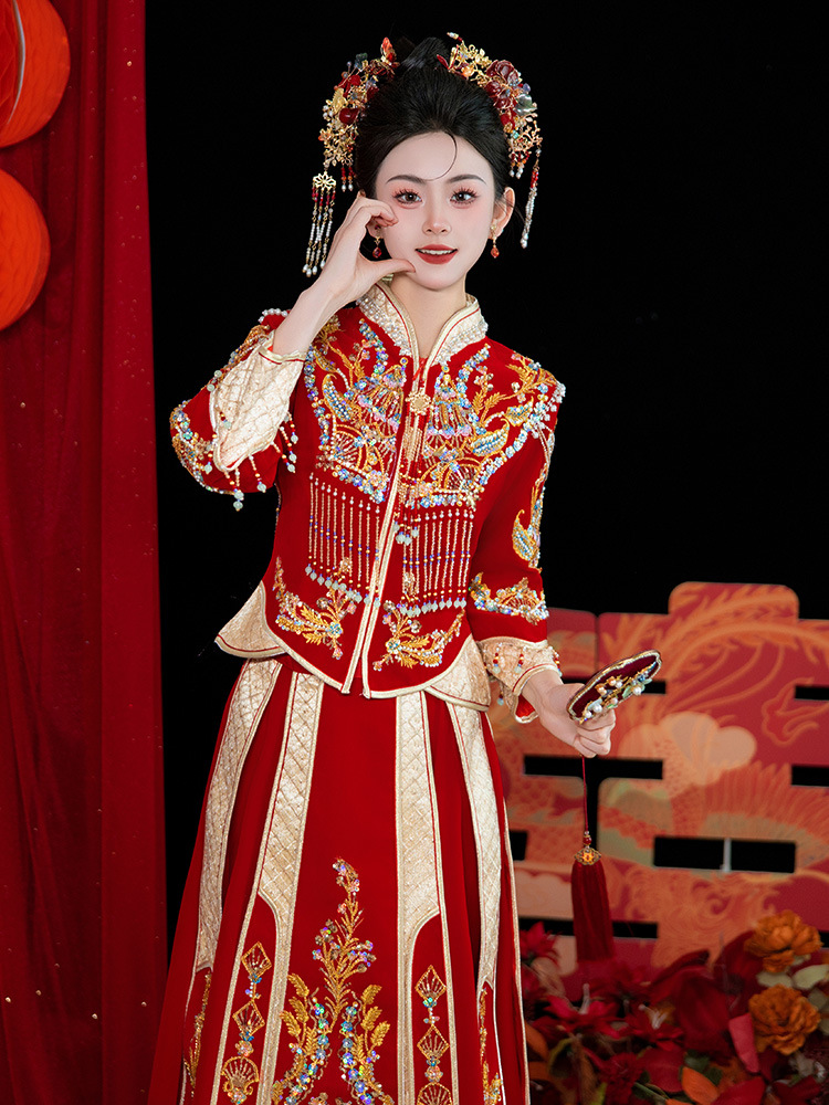 Свадебное платье Xiuhe 2024, новое, из плотной ткани, красное, в китайском стиле, весенняя модель, женское, с узором дракон и феникс