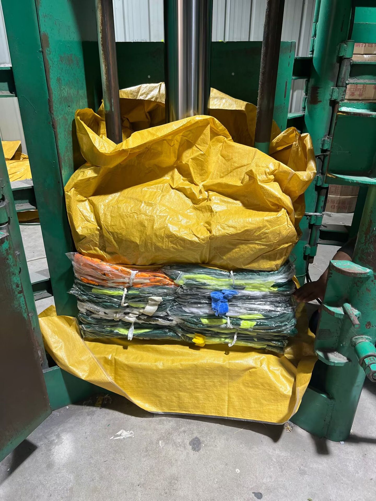 下面是外贸发货的几种方式。第一种,拉链封口袋,独立包装以后,5件一捆,绳子捆起来,然后放液压机器进行排除空气,就是常用的压缩包发货,压缩包的话,80厘米是机器凹槽的长度,60厘米是机器宽度,这个是不变的,根据衣服数量的多少,高度会有变化,衣服压的多,高度会增加。我们一般是压成人的100-120件一个包,体积大约80*60*50厘米左右,大约0.22个方,小孩的衣服可以压100-150件之间,体积大约80*60*40厘米左右,0.2个方左右,,我们平时散单,小单,客户下单只要达到60件往上,我们就可以打压缩包发货,这样可以减少客户发国外的国际物流费用。订单数量多的,一个包压多少件衣服,这数量可以协商,80-180件之间都没问题,,小孩的最多可以压280件左右,不同国家的客户不同要求,一般发欧美独立真空+装箱,出柜的居多,,发临近的国家,压缩包的占多