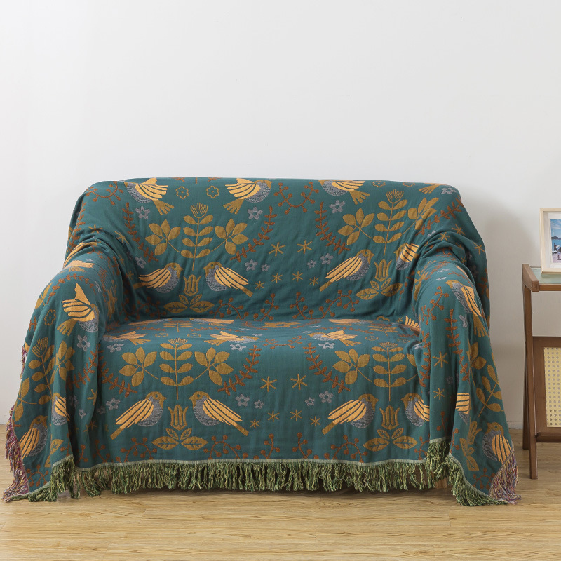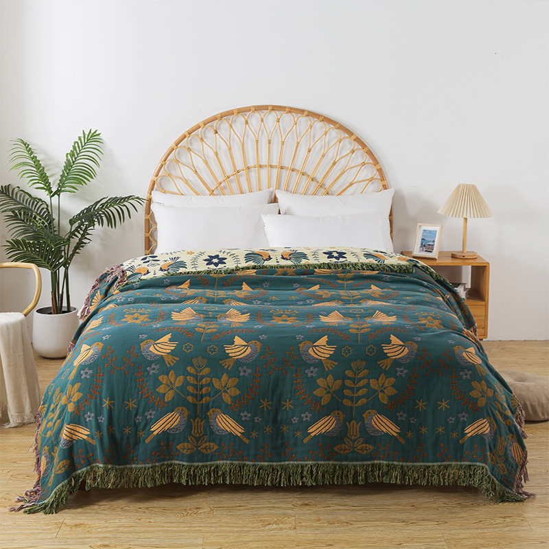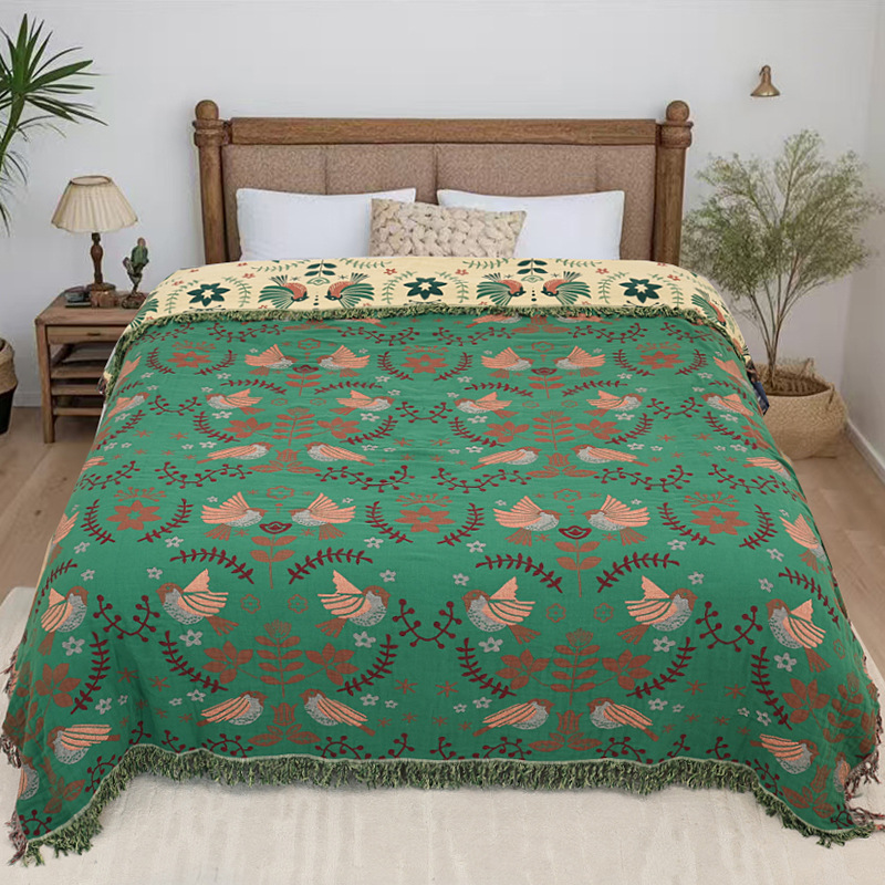 Покрывало-полотенце с кисточками в стиле зеленого цветка и птицы [сзади бежевый]; Темно-зеленое одеяло-полотенце с кисточками в виде цветов и птиц; Оранжевое великолепное одеяло с кисточками