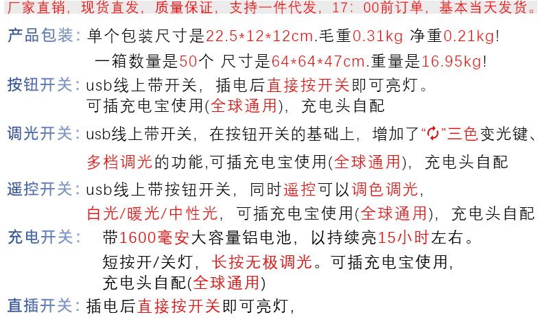 Переключатель USB (теплый свет); USB (трехцветное) многомерное затемнение; USB (трехцветный) пульт дистанционного затемнения; USB (теплый свет) зарядка 1500 мА + сенсорное бесступенчатое затемнение; USB (три цвета) зарядка 1500 мА + сенсорное бесступенчатое затемнение; Переключатель 220V прямой (теплый свет); Американские правила прямого подключения (три цвета); Европейские правила прямая вставка (три цвета); Британский регламент прямой (трехцветный) трехтранс переменной