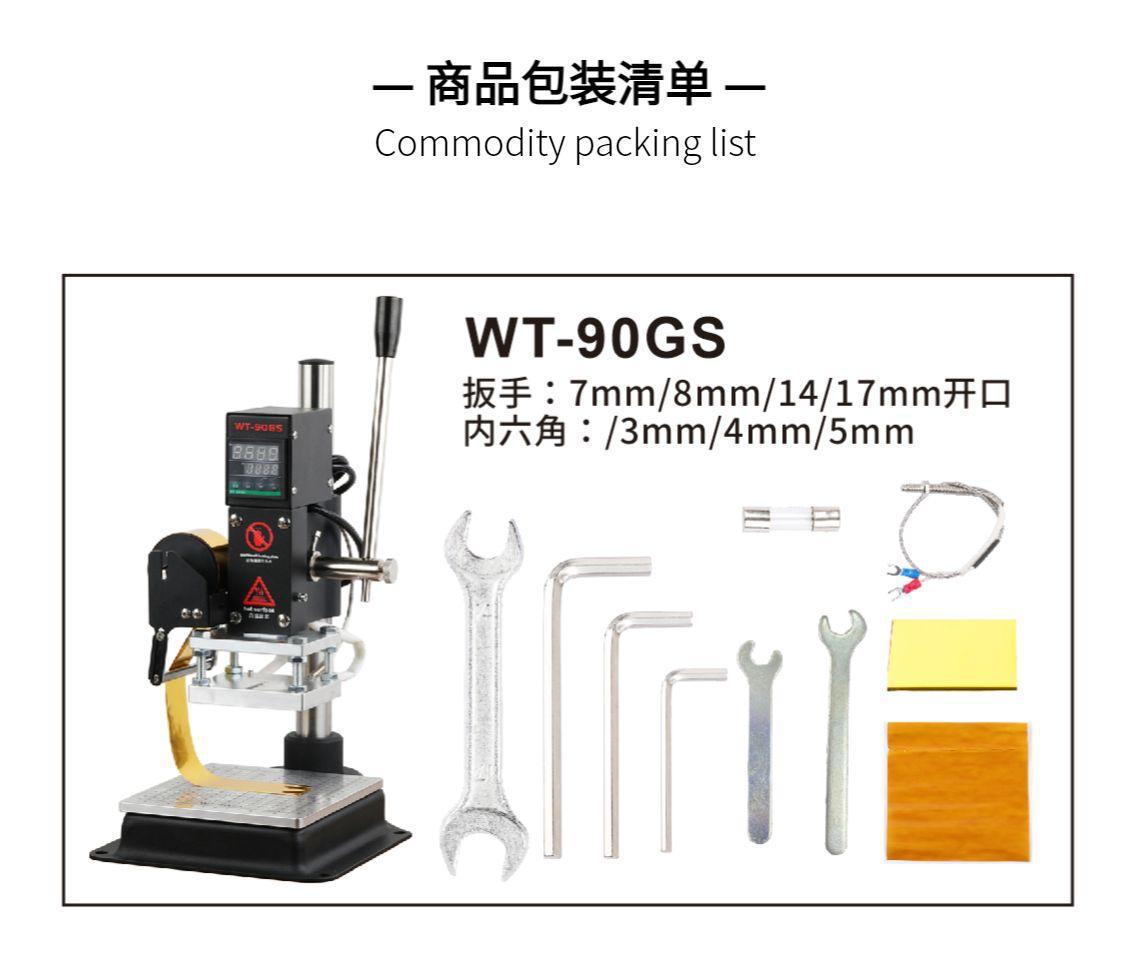 WT-90GS маленький размер 5*7 см (без кронштейна для горячего тиснения); WT-90GS средний размер 8*10 см (без кронштейна для горячего тиснения); WT-90GS большой размер 10*13 см (без кронштейна для горячего тиснения); WT-90GS маленький размер 5*7 см (включая кронштейн для горячего тиснения); WT-90GS средний размер 8*10 см (включая кронштейн для горячего тиснения); WT-90GS большой размер 10*13 см (включая кронштейн для горячего тиснения); WT-90GS большой размер 10*13 (модель двойного назначения с Т-образным слотом); WT-90GS маленький размер 5*7 см (включая кронштейн для горячего тиснения + готовый верстак)