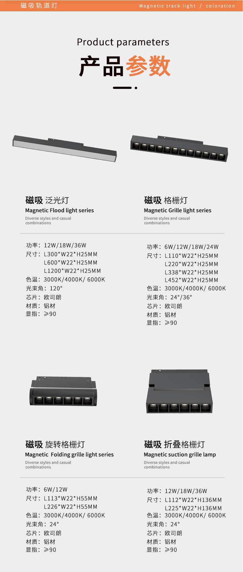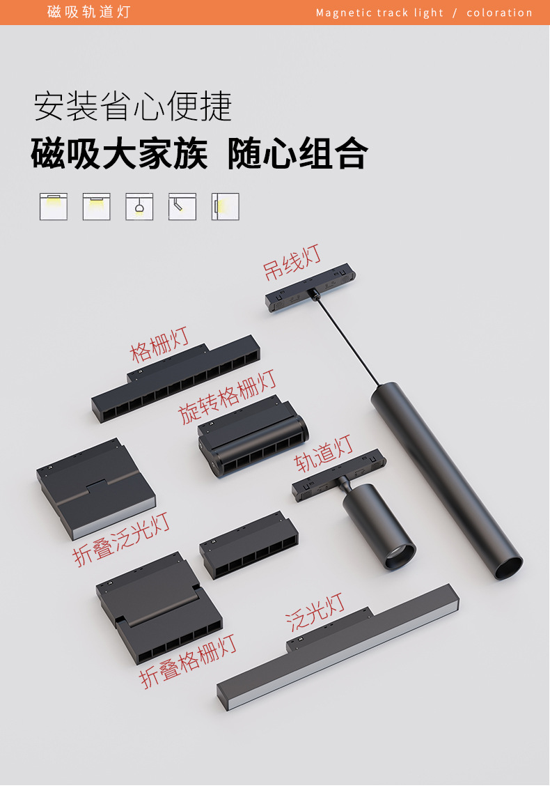 Светильник-решетка 6 Вт [модель премиум-класса для домашнего и коммерческого использования]; Светильник-решетка 12 Вт [модель премиум-класса для домашнего и коммерческого использования]; Светильник-решетка 18 Вт [модель премиум-класса для домашнего и коммерческого использования]; Прожектор-12 Вт [модель высокого класса для домашнего и коммерческого использования]; Прожектор-18 Вт [модель высокого класса для домашнего и коммерческого использования]; Прожектор-36 Вт [модель высокого класса для домашнего и коммерческого использования]; Светильник с вращающейся решеткой — 6 Вт [модель высокого класса для домашнего и коммерческого использования]; Светильник с вращающейся решеткой — 12 Вт [модель высокого класса для домашнего и коммерческого использования]; Трековый светильник 7 Вт [модель высокого класса для домашнего и коммерческого использования]; Трековый светильник 12 Вт [модель высокого класса для домашнего и коммерческого использования]; Трековый светильник 20 Вт [модель высокого класса для домашнего и коммерческого использования]; Складной светильник с решеткой — 6 Вт [модель высокого класса для домашнего и коммерческого использования]; Складная решетка-12 Вт [модель высокого класса для домашнего и коммерческого использования]; Подвесной светильник-7 Вт [модель высокого класса для домашнего и коммерческого использования]; Уплотнительная пластина типа магнитная дорожка [утолщенного типа]; Серая партия моделей — магнитная дорожка [утолщённая модель]; Магнитный трек для поверхностного монтажа [утолщенная версия]; Аксессуары-проходной модуль; Аксессуары-модуль ввода; Аксессуары-Угловой модуль; Аксессуары - Горизонтальный L-угол; Встроенный трансформатор мощностью 100 Вт.; Встроенный трансформатор мощностью 200 Вт.; Накладной монтаж (пакет для установки на стропе)