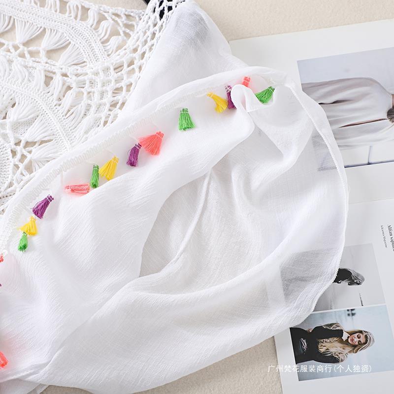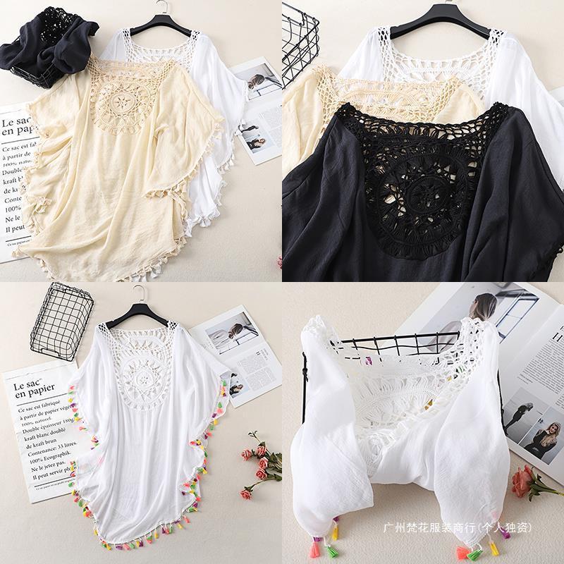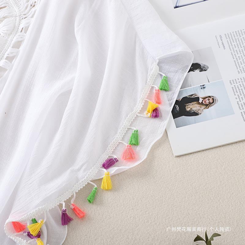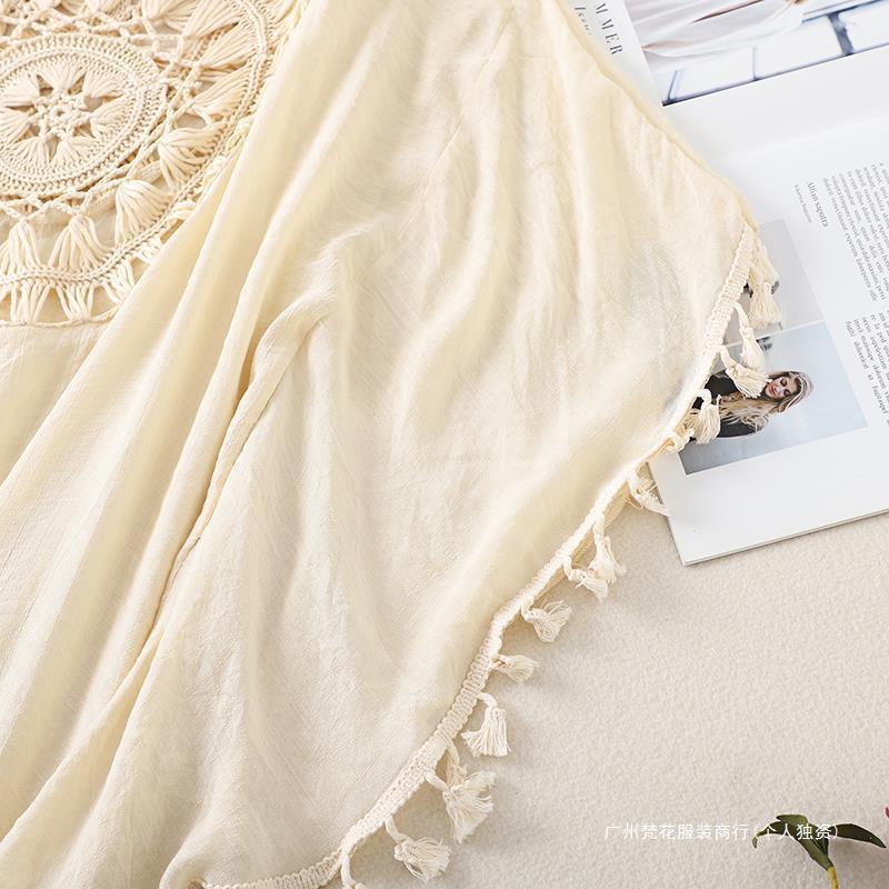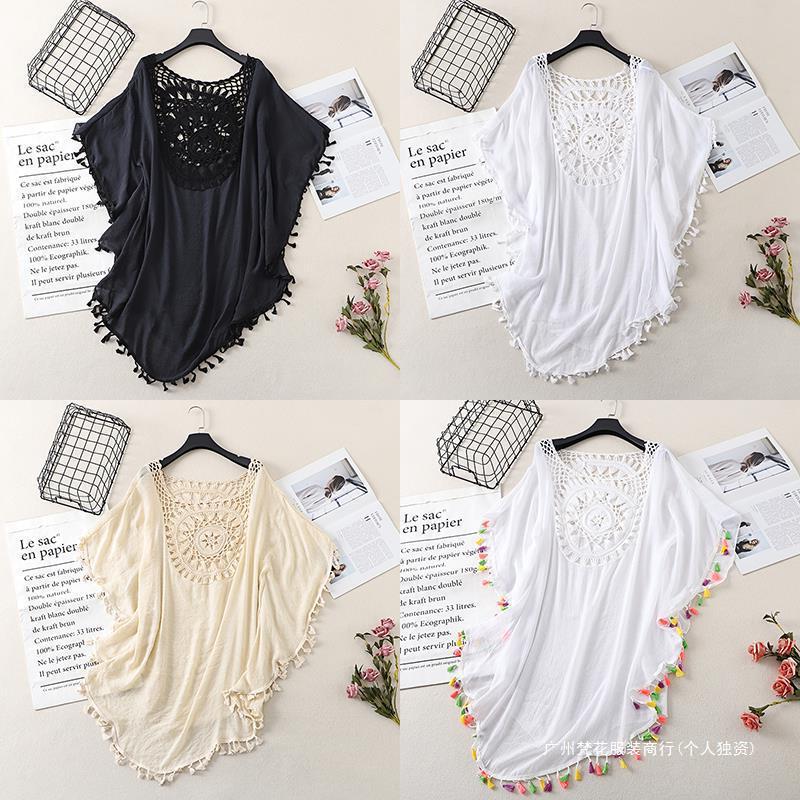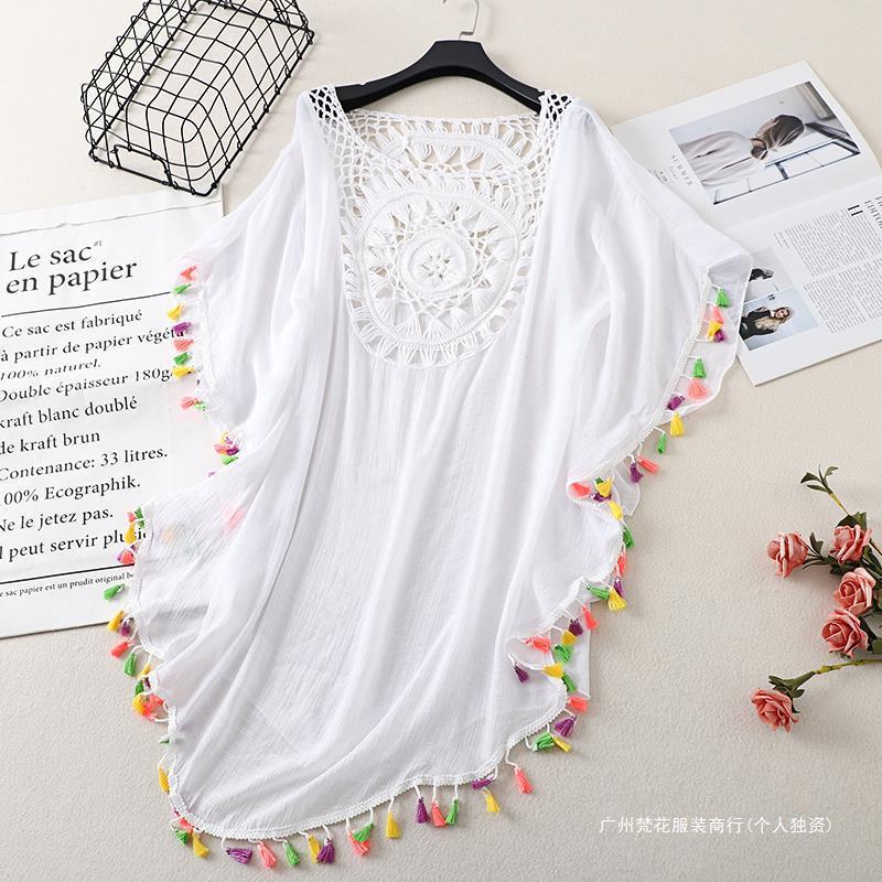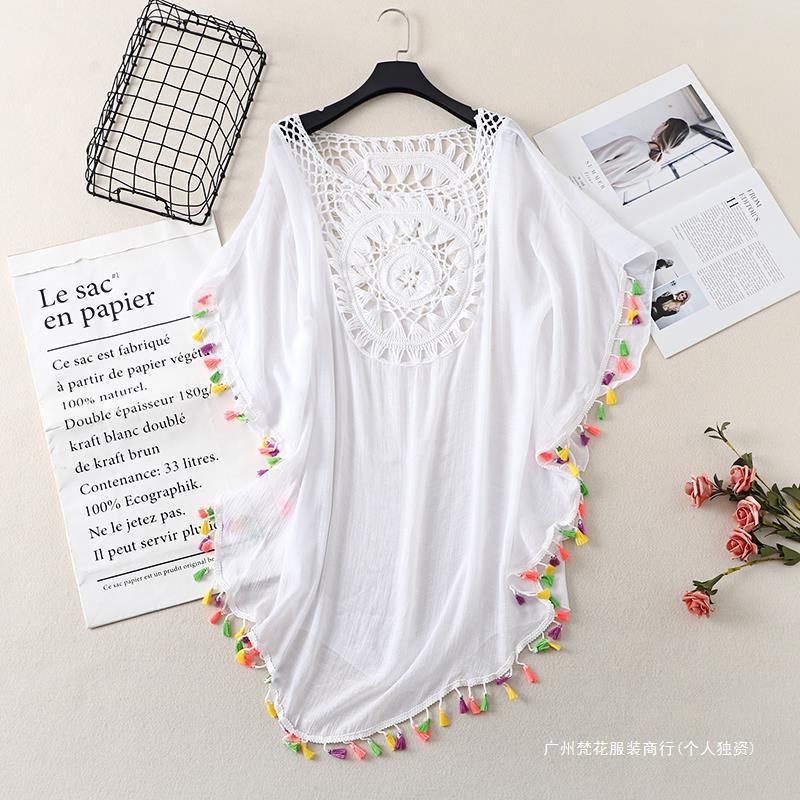 Трансграничный новый праздничный крючок сплошной цвет сшивания европейская и американская пляжная юбка маленькая кисточка солнцезащитный крем короткая сексуальная пляжная блузка