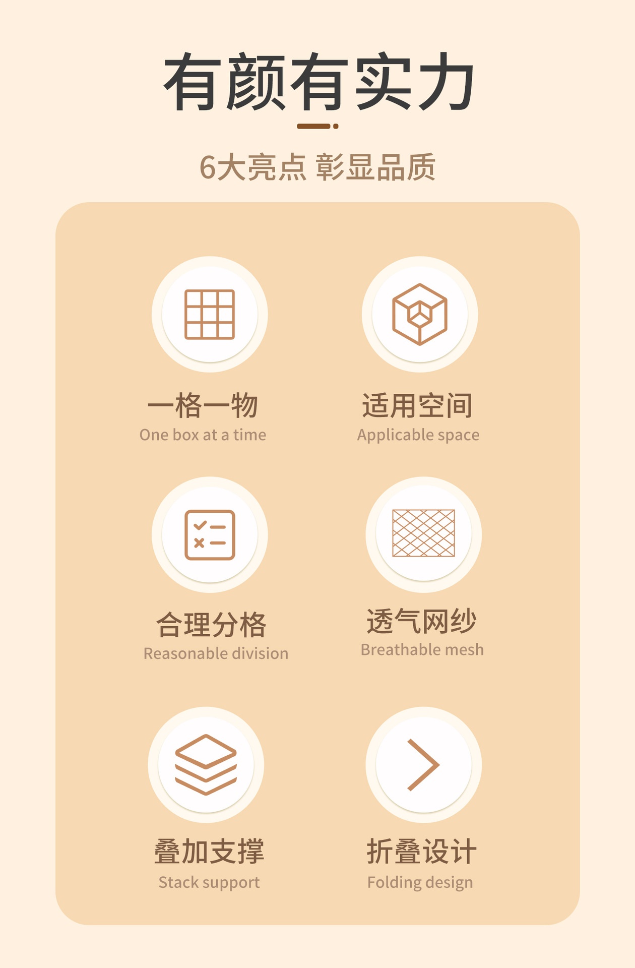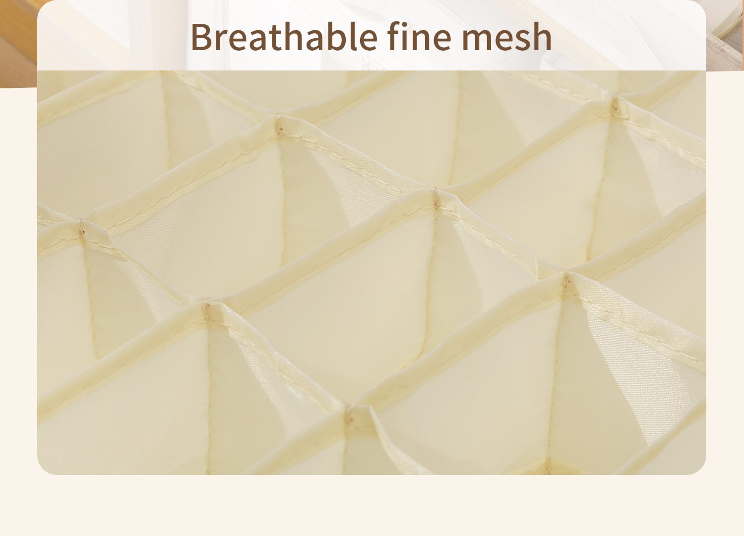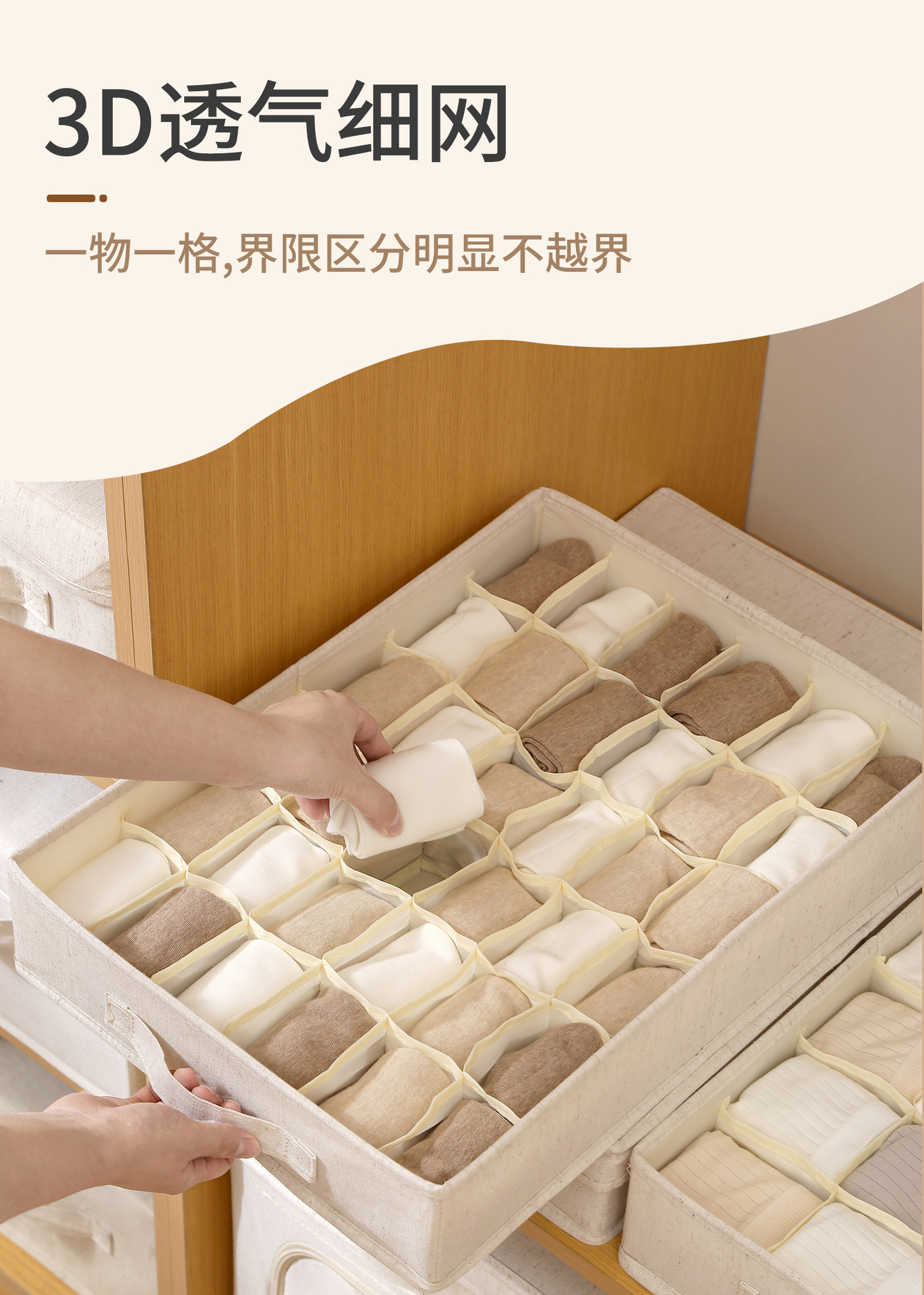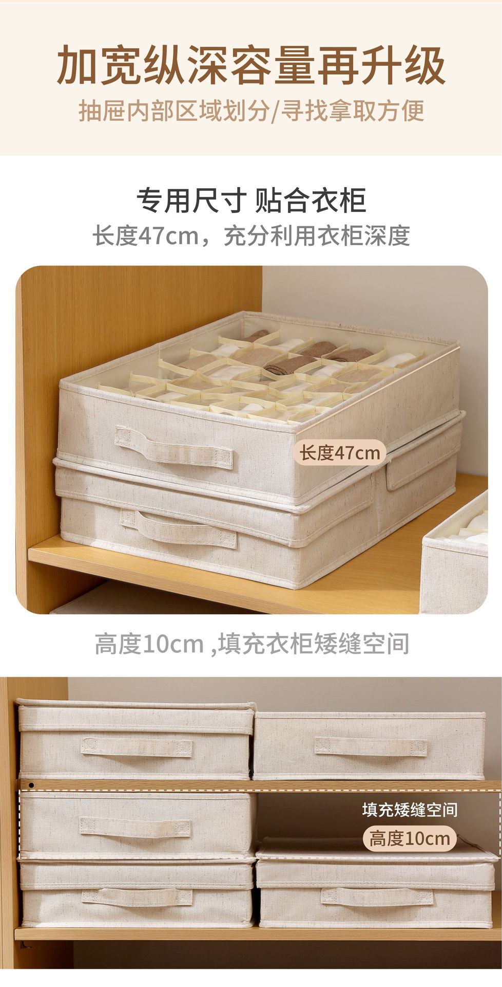 Носки 36 сеток (47*34*10см); Нижнее белье 24 сетки (47*34*10см); Бюстгальтер 10 сеток (47*34*10см); Два в одном 17 сеток (47*34*10 см); Подходящая крышка (49*35*4 см); Подходящая полка (48*36,6*10,7 см)