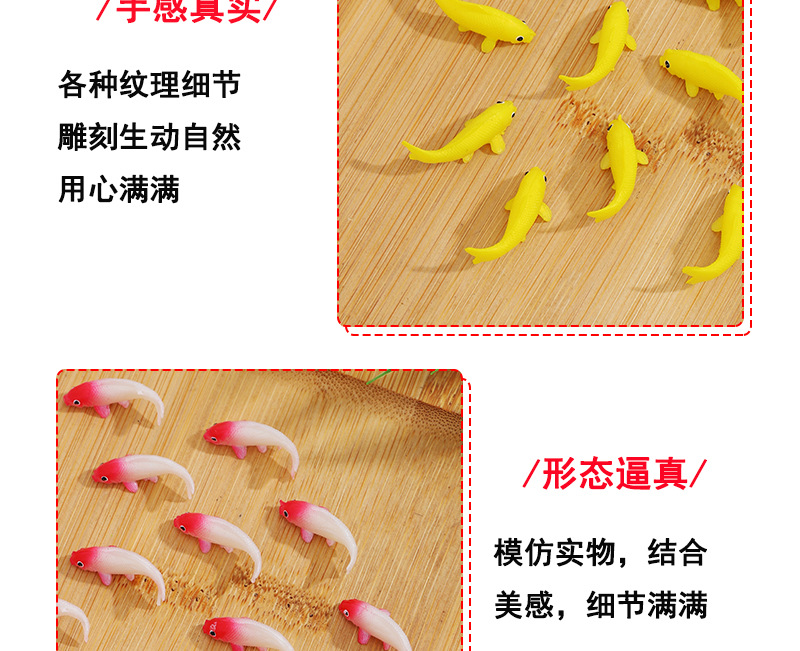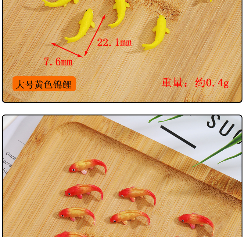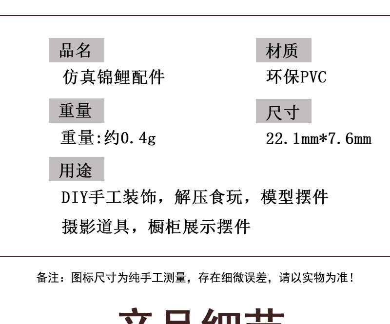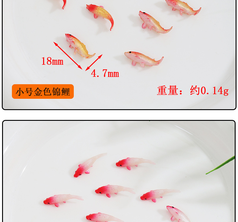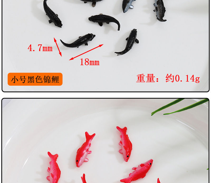 这款仿真锦鲤DIY配件,大号尺寸约22.1mm*7.6mm,克重约0.4g,小号锦鲤尺寸约18mm*4.7mm,克重约0.14g,日常可用做Dⅰy手工装饰使用,解压食玩,儿童益智教学道具,摄影道具,模型摆件,鱼缸造景道具等,产品采用环保PVC材质,看起来色泽饱满,触摸手感真实,形态以假乱真,让人爱不释手,赶快选购吧