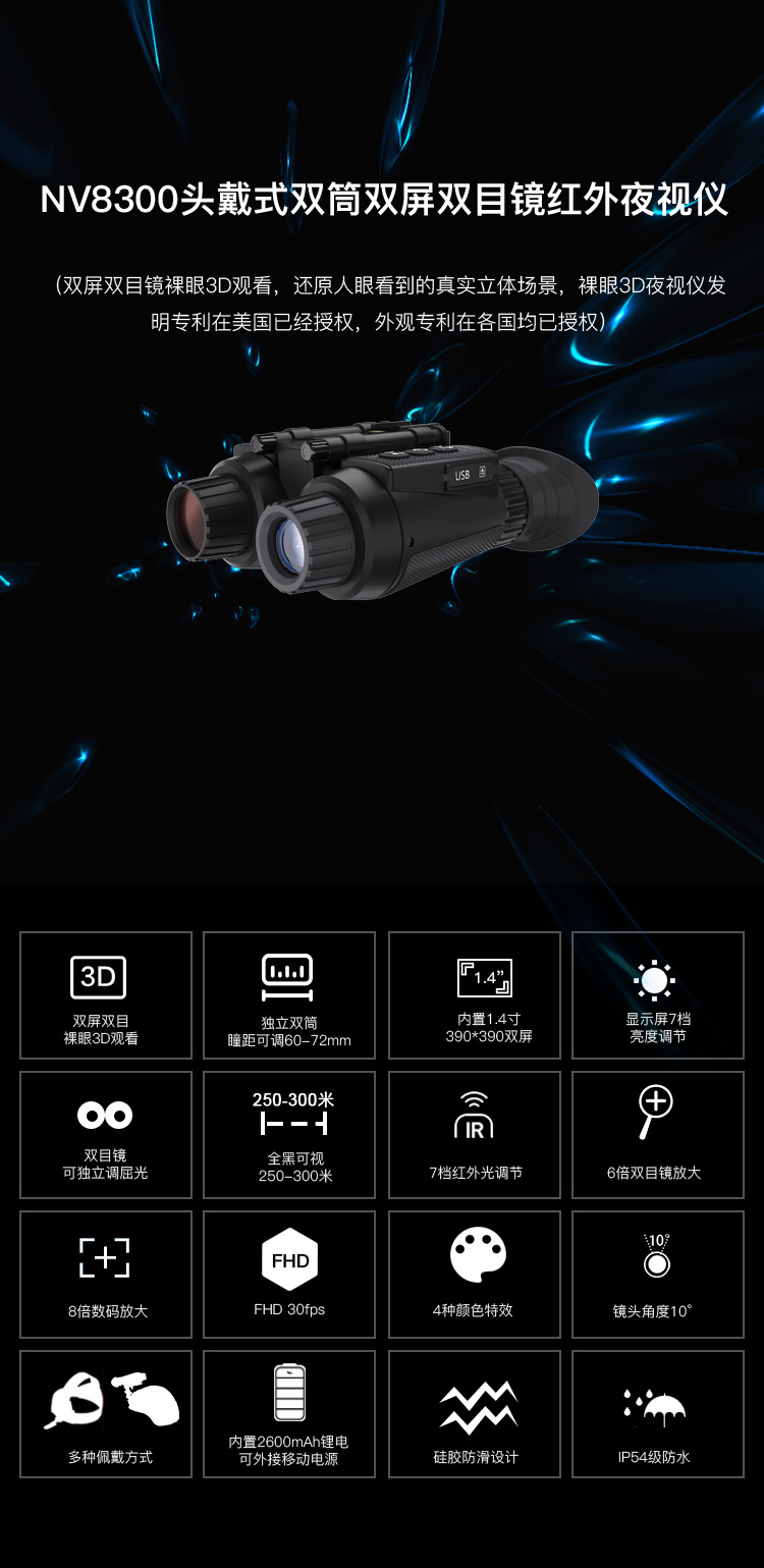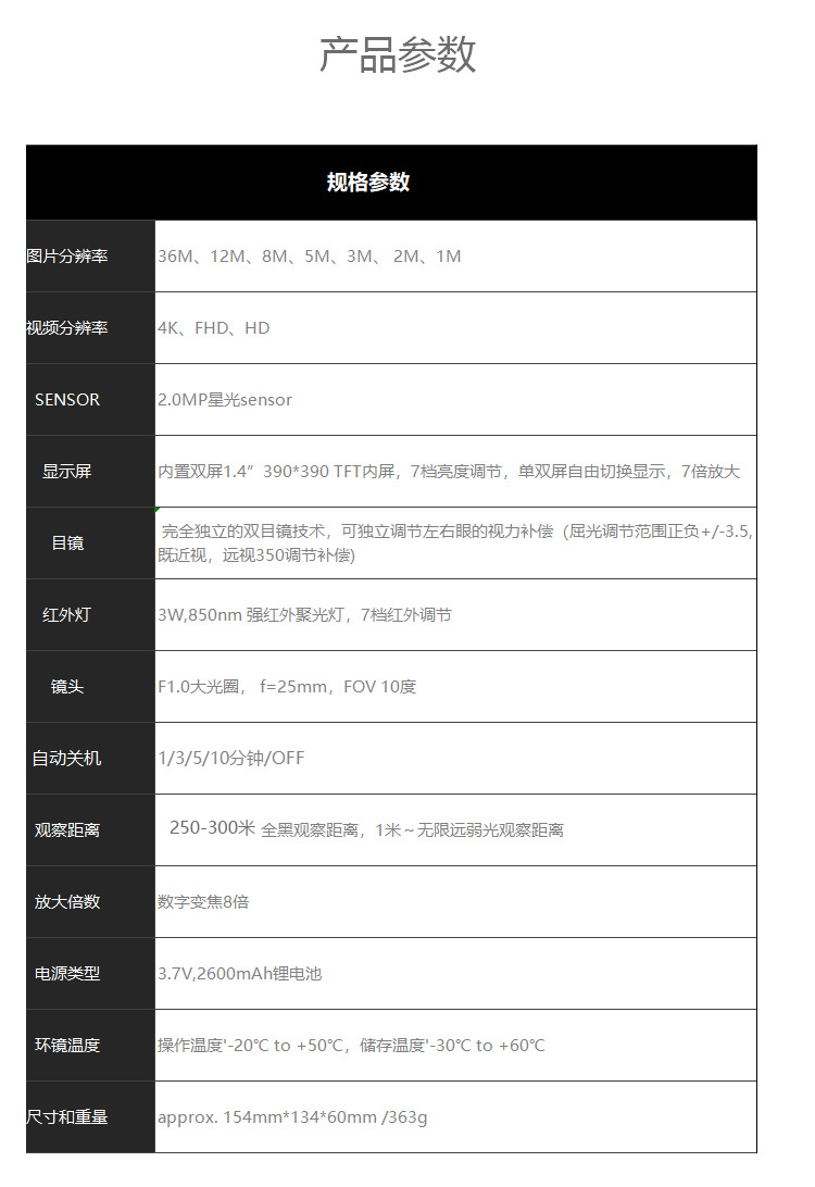 ♦ 250米~300米全黑观察距离,1米~无限远弱光观察距离