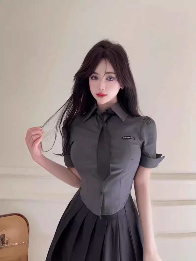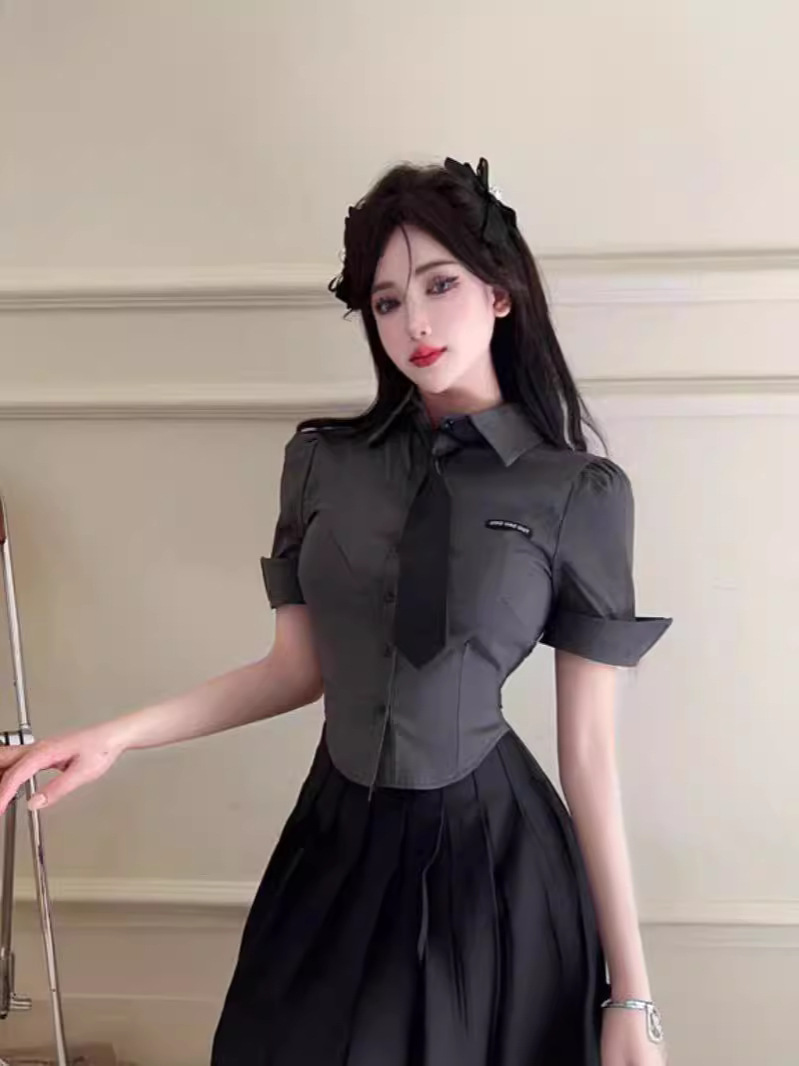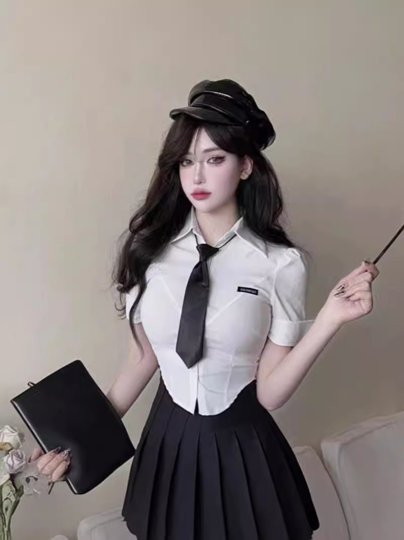серый верх; белый топ; Серый топ + черная плиссированная юбка; Белый топ + черная плиссированная юбка
