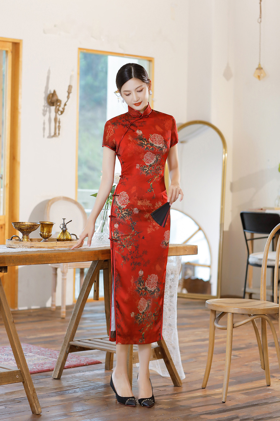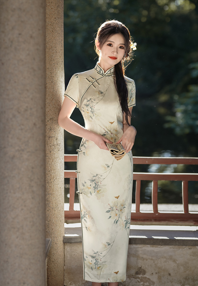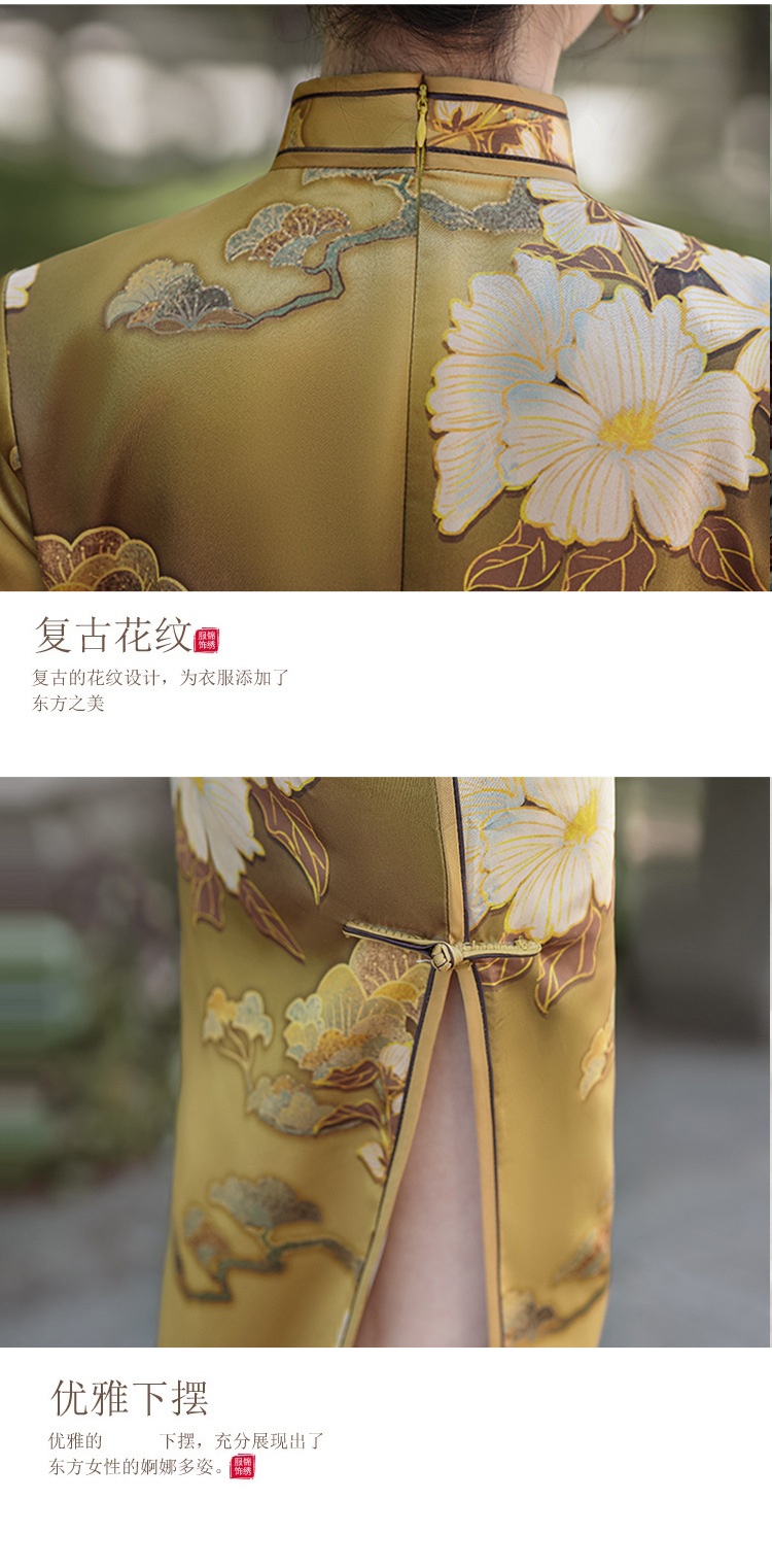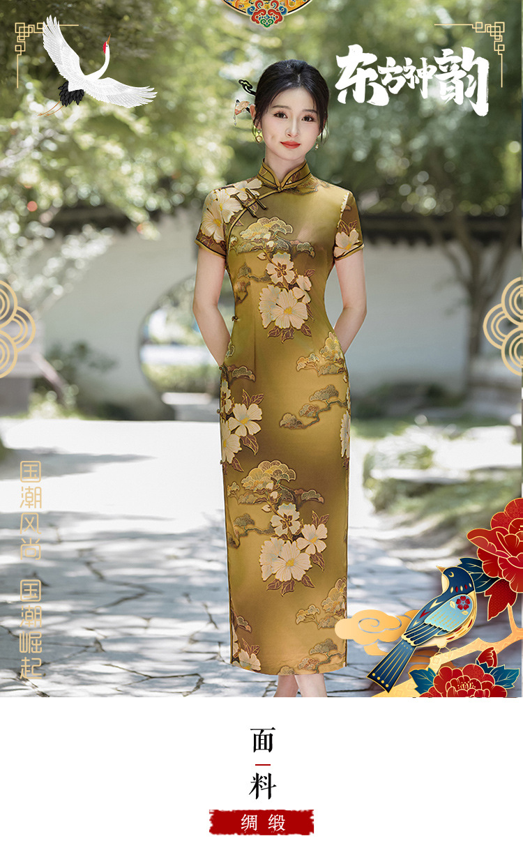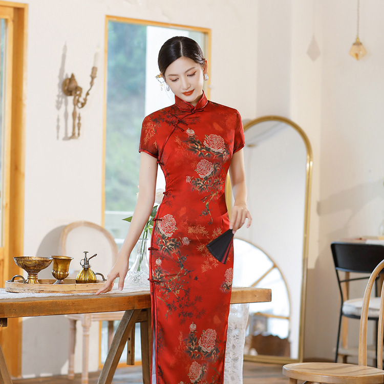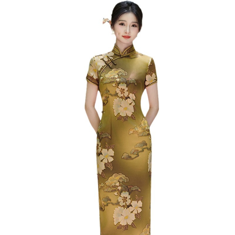 2025 Новый китайский стиль, лето и осень, новая длинная юбка Cheongsam, атласное платье в стиле ретро, тонкое банкетное двухслойное платье, оптовая продажа