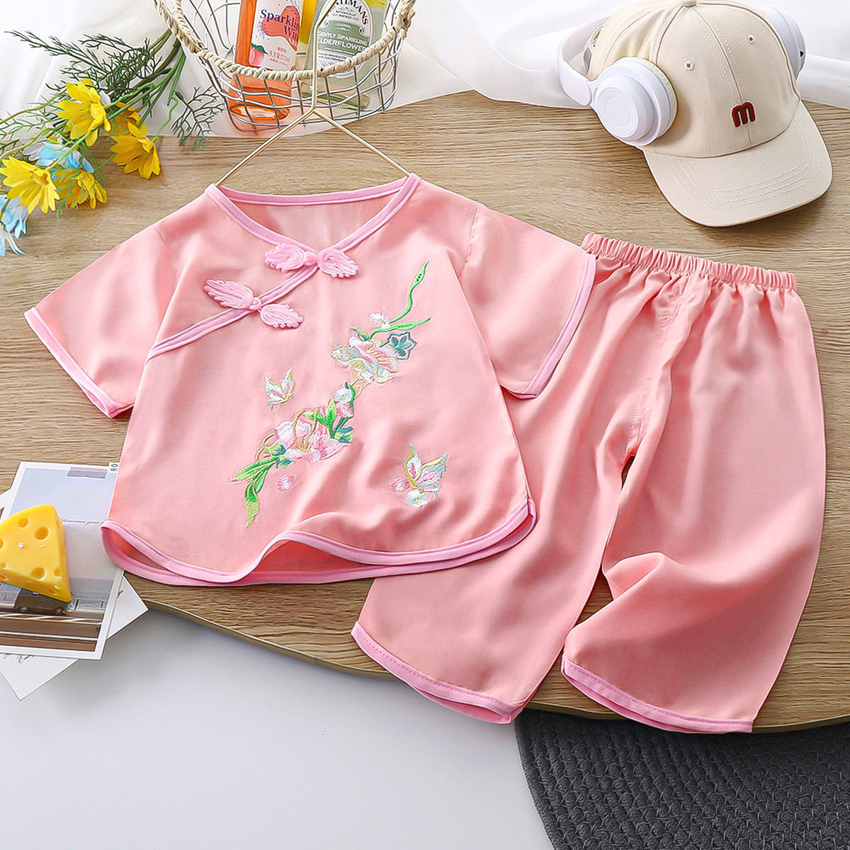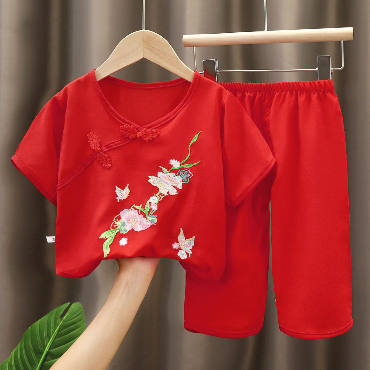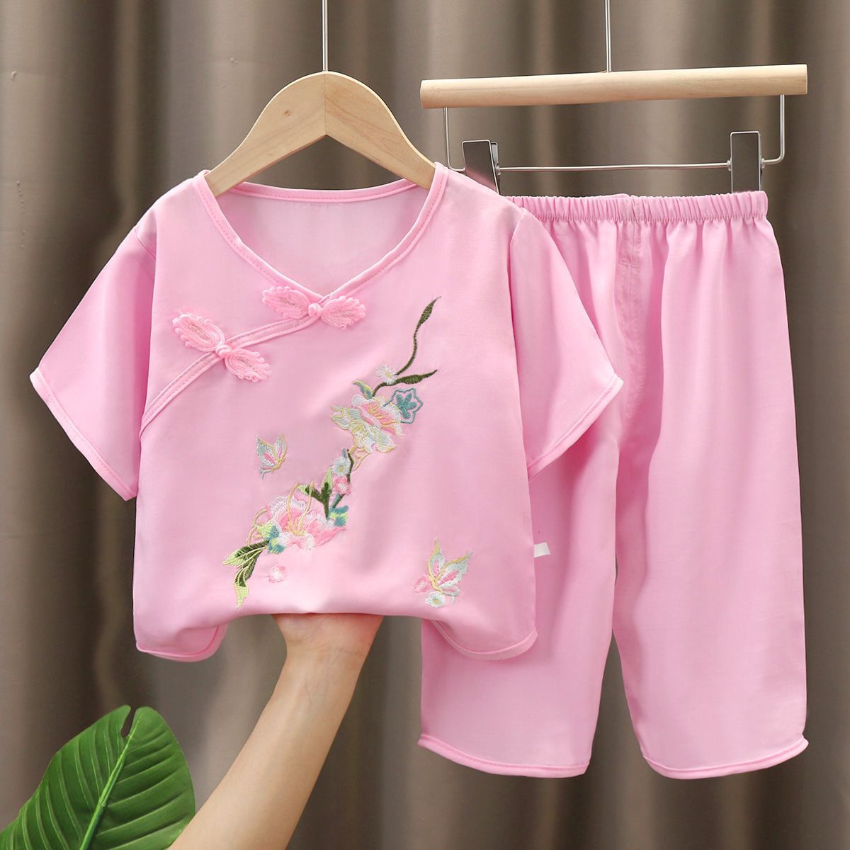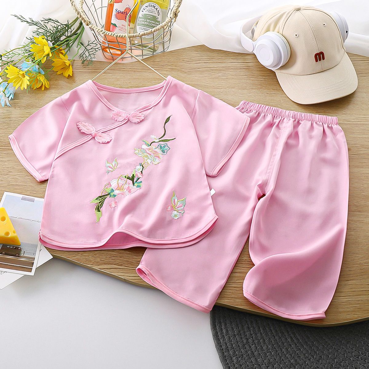 Летний костюм для девочек 2025 года в китайском стиле из хлопкового шелка, с короткими рукавами, вышивкой ханьфу и укороченными брюками для отдыха на улице.