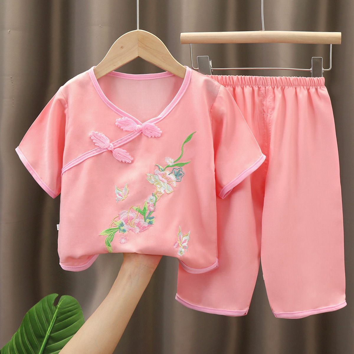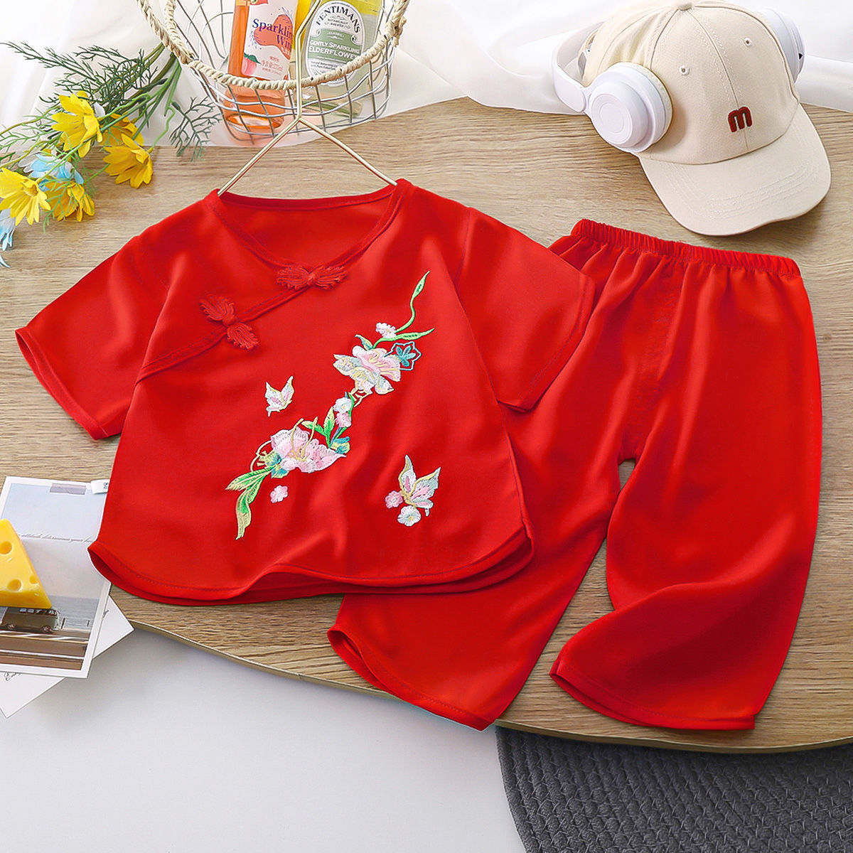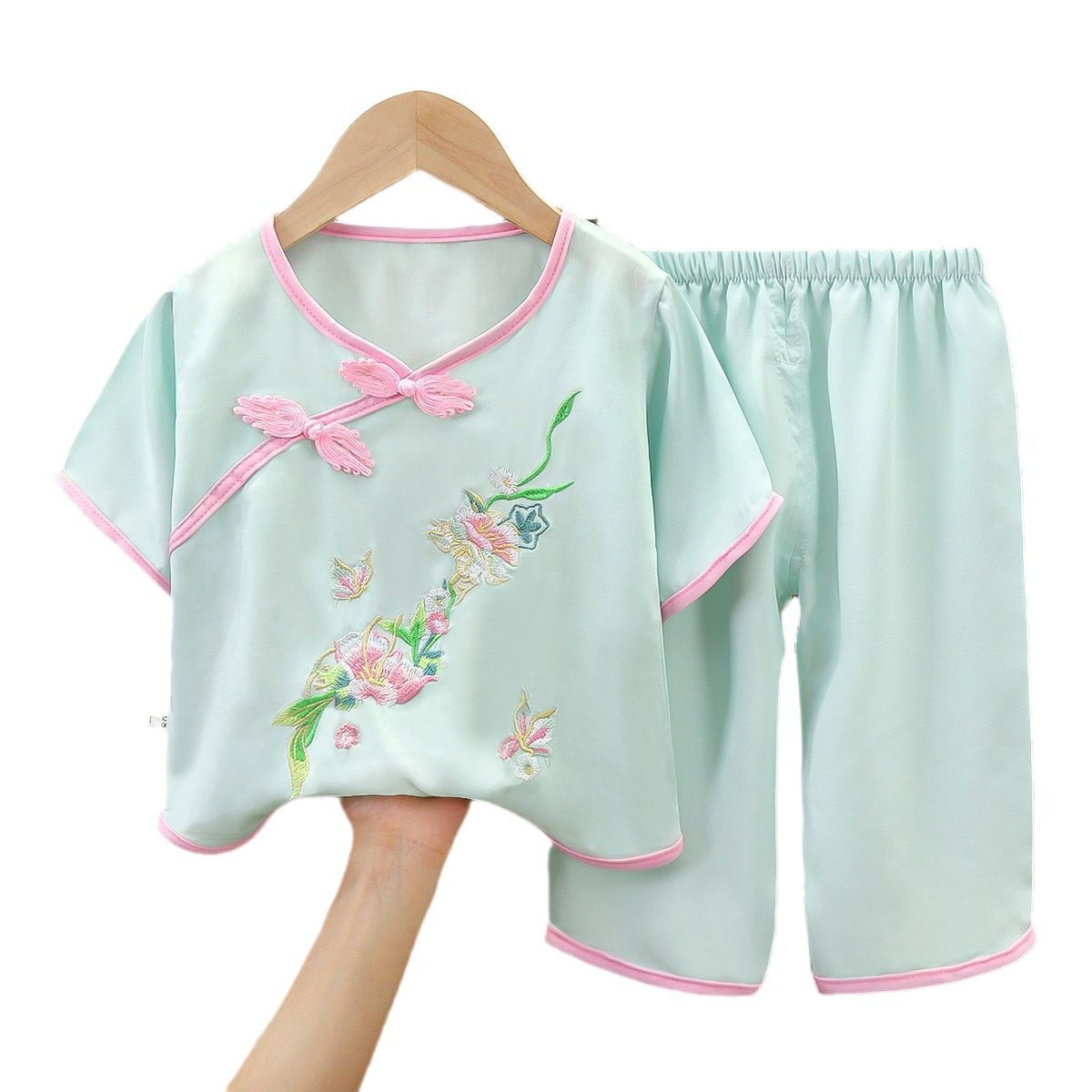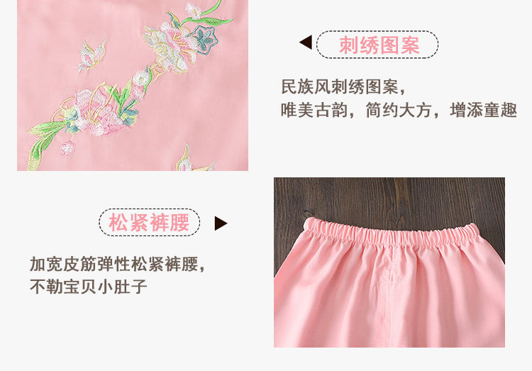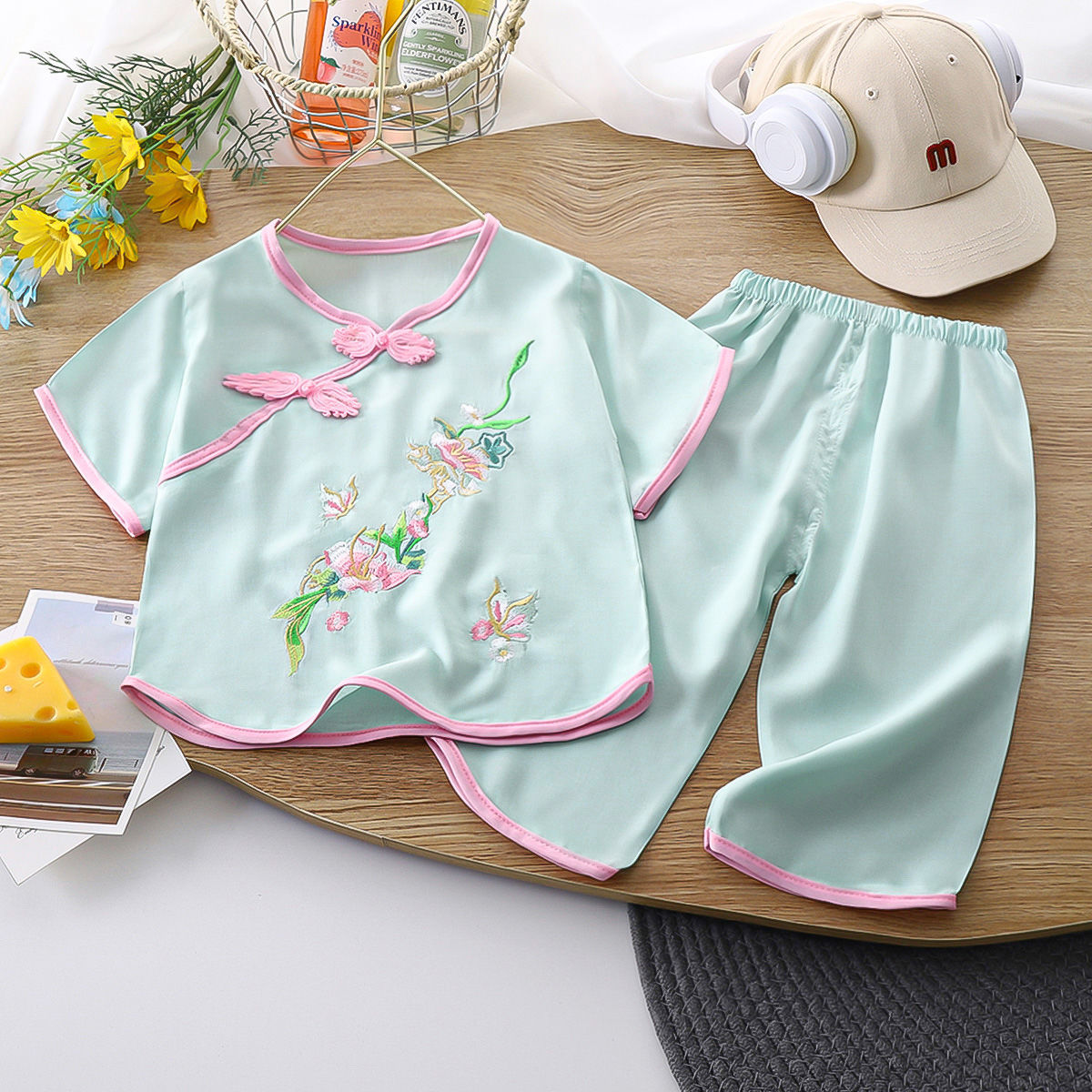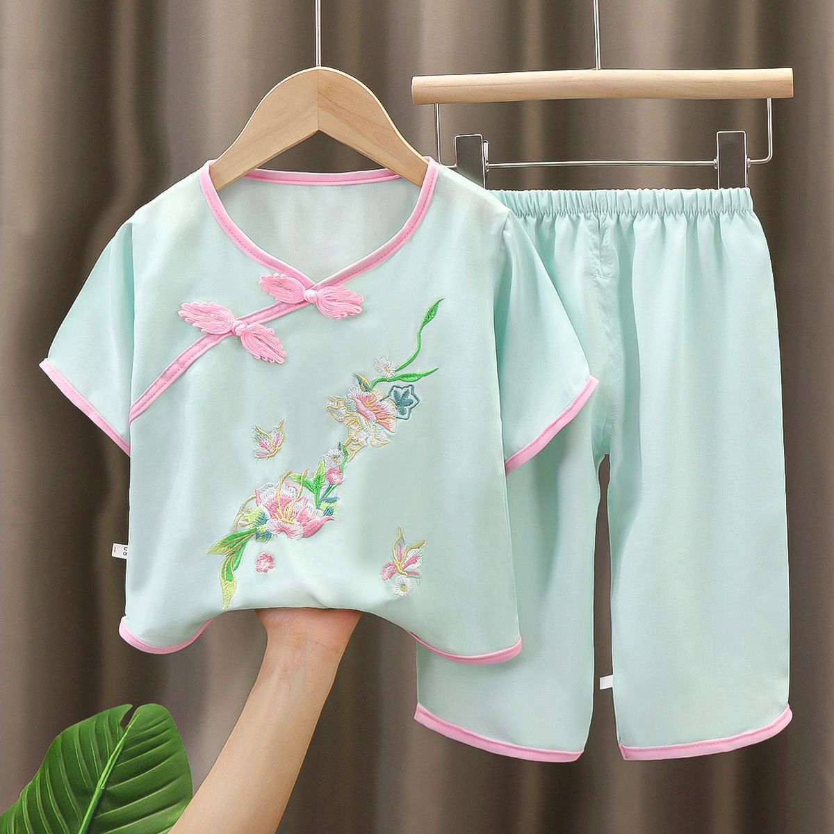 Летний костюм для девочек 2025 года в китайском стиле из хлопкового шелка, с короткими рукавами, вышивкой ханьфу и укороченными брюками для отдыха на улице.
