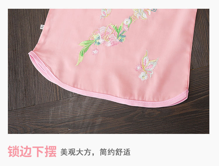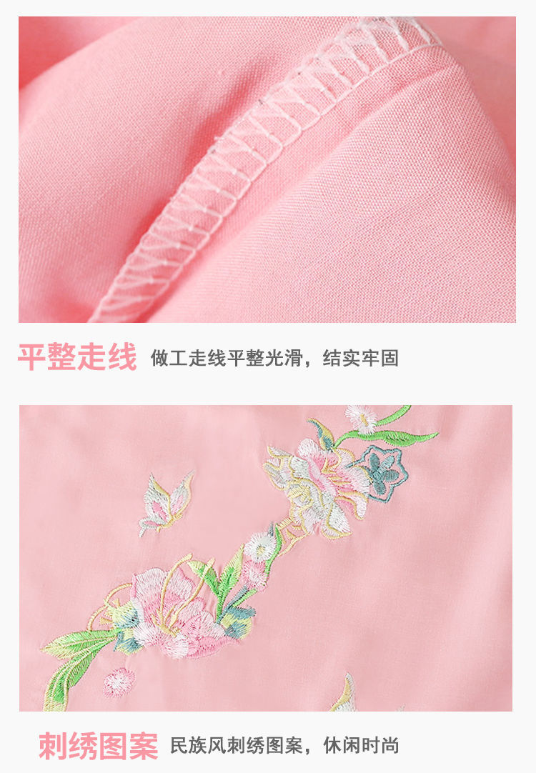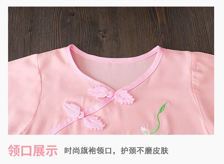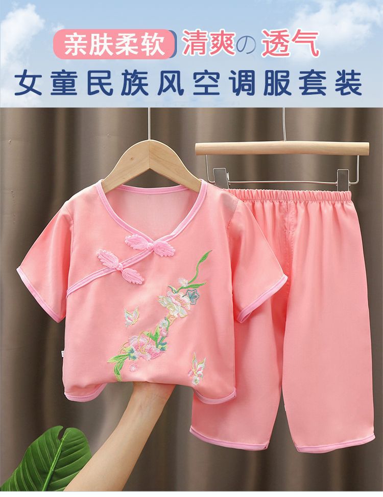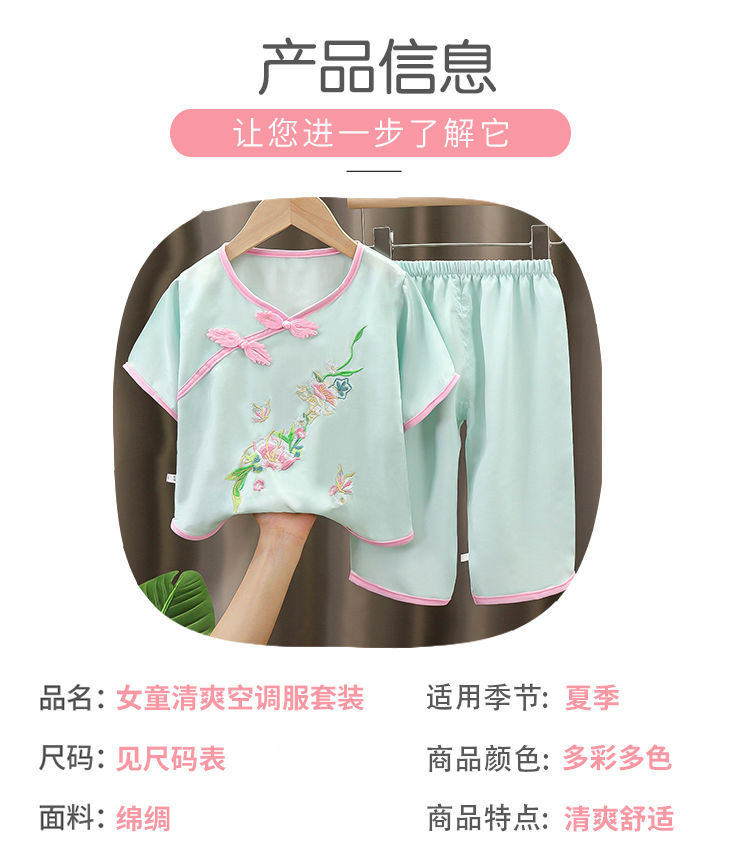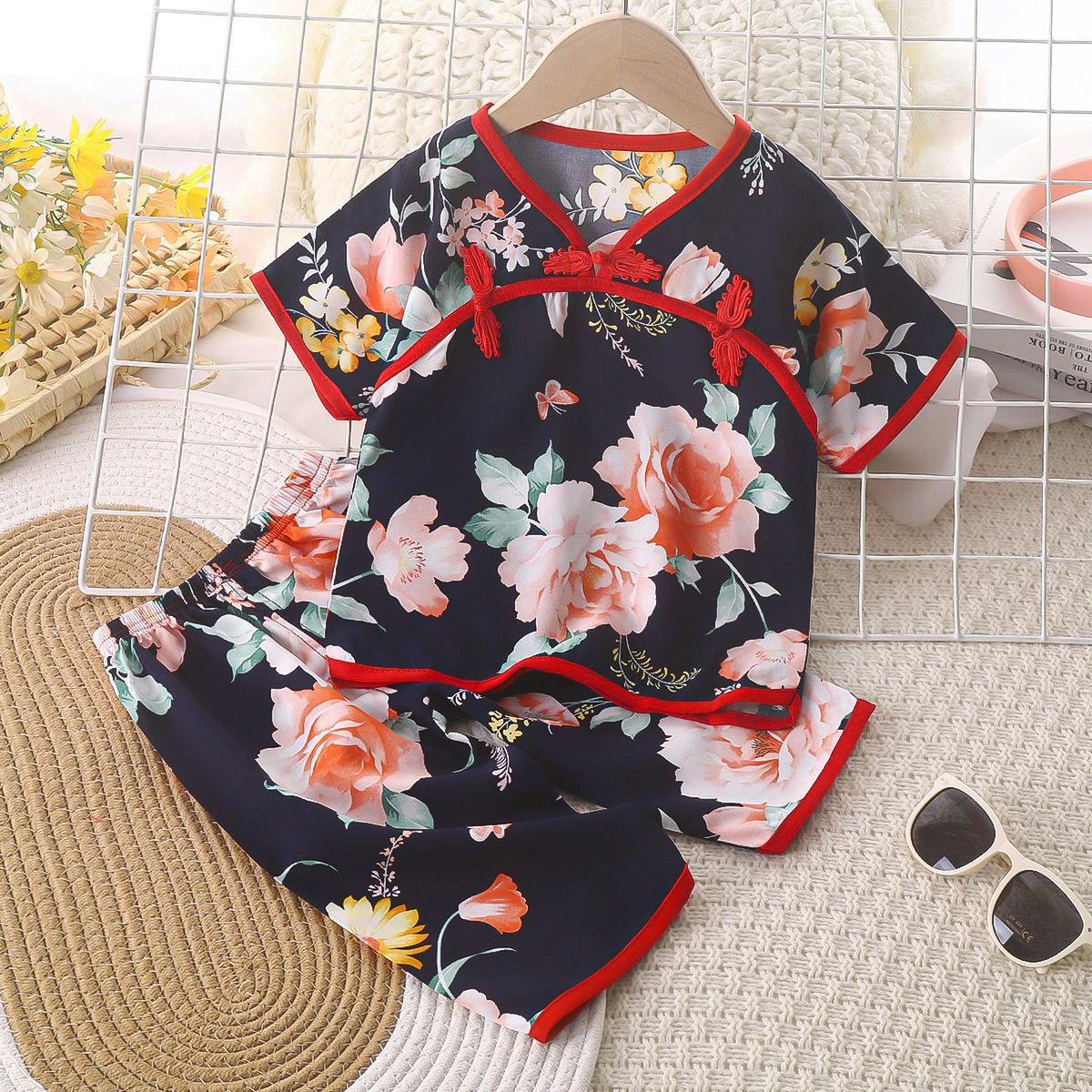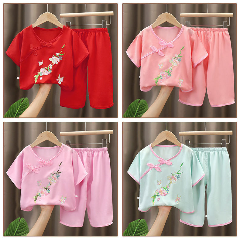 Летний костюм для девочек 2025 года в китайском стиле из хлопкового шелка, с короткими рукавами, вышивкой ханьфу и укороченными брюками для отдыха на улице.