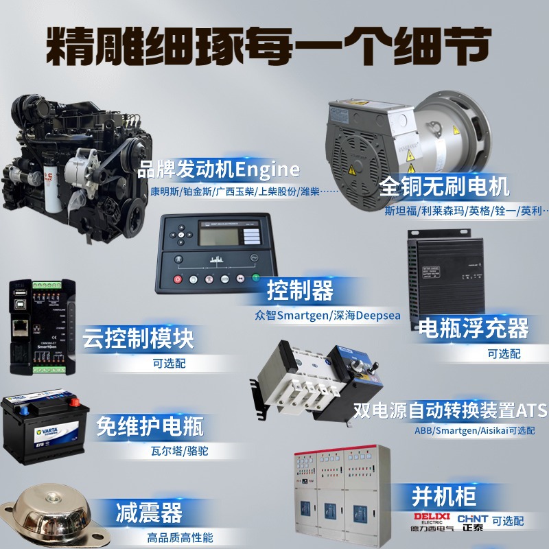 (24 кВт)4B3.9-G2; (30 кВт)4BT3.9-G2; (50 кВт)4BTA3.9-G2; (65 кВт)4BTA3.9-G11; (80 кВт)6BT5.9-G2; (100 кВт)6BTA5.9-G2; (120 кВт)6 Брус5.9-G2; (135 кВт)6Balung5.9-G12; (150 кВт)6CTA8.3-G2; (180 кВт)6C Μ8.3-G2; (200 кВт)6L Μ8.9-G2; (Запасной 400 кВт) QSZ13-G3; Контроллер самозапуска Cummins 6110; Дизельный фильтр
