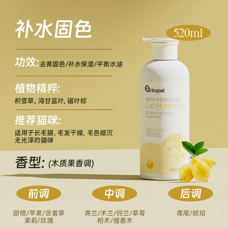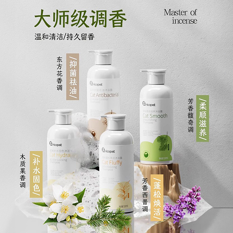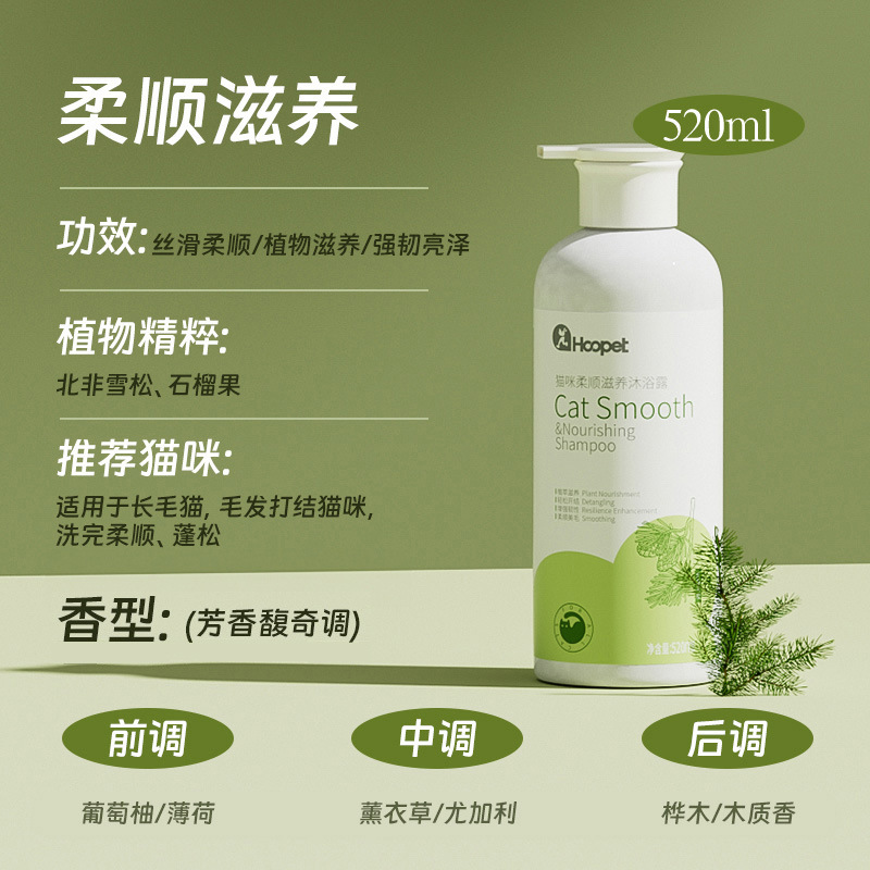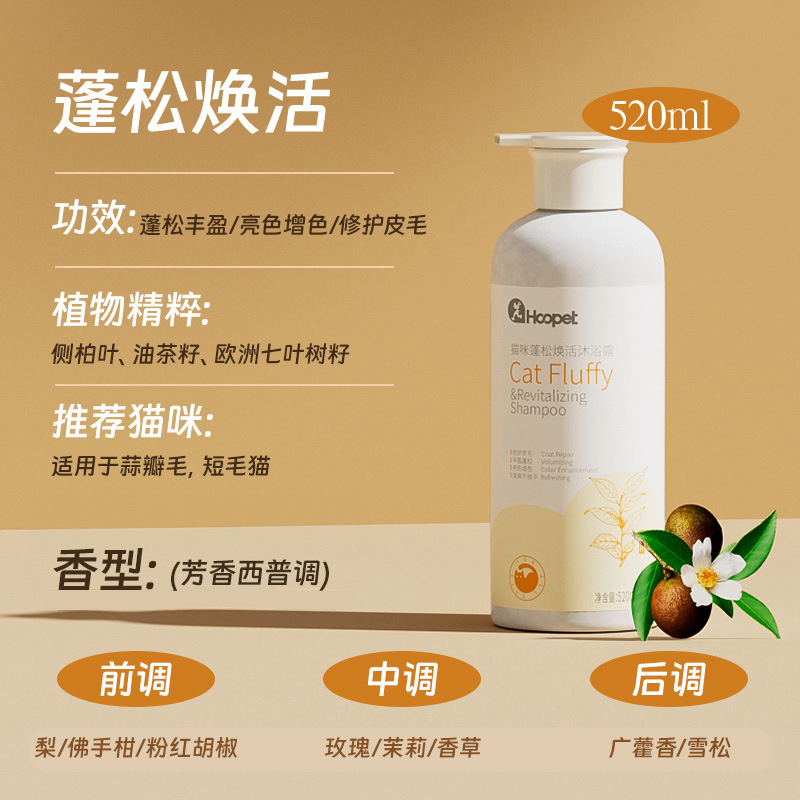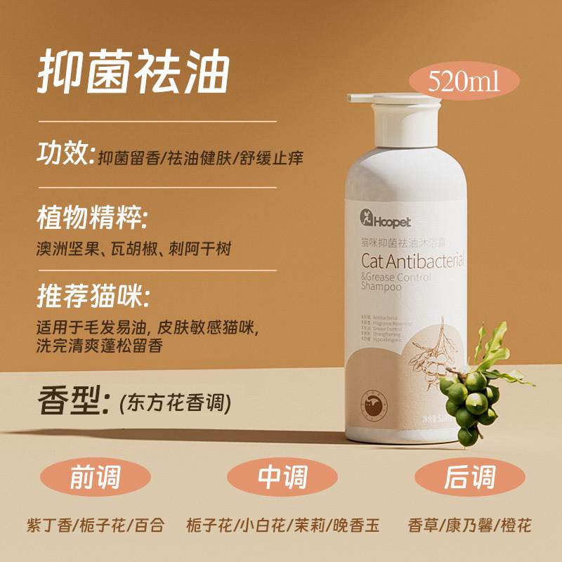 【品名】:HOOPET 猫咪(抑菌祛油/蓬松焕活/补水固色/柔顺滋养)沐浴露520ml