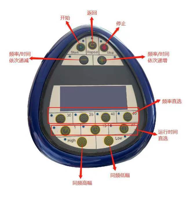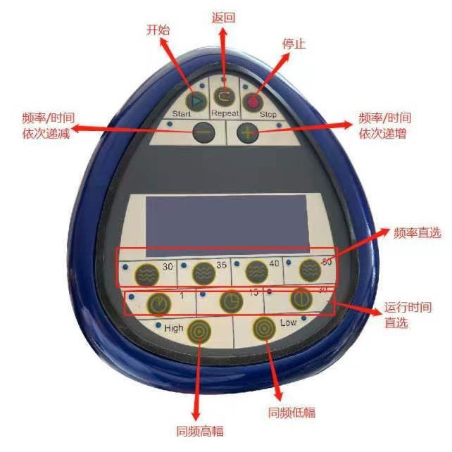 (4)显示屏要求:双显示屏显示,下方液晶面板可显示动作剩余时间、赫兹数,并附有8个控制键(开始/暂停、停止、程序、高/低、增加、减少、时间、赫兹),
