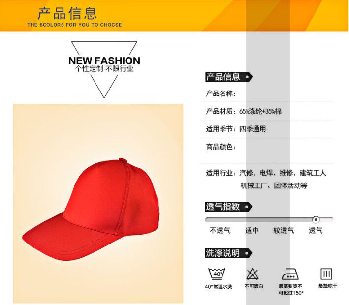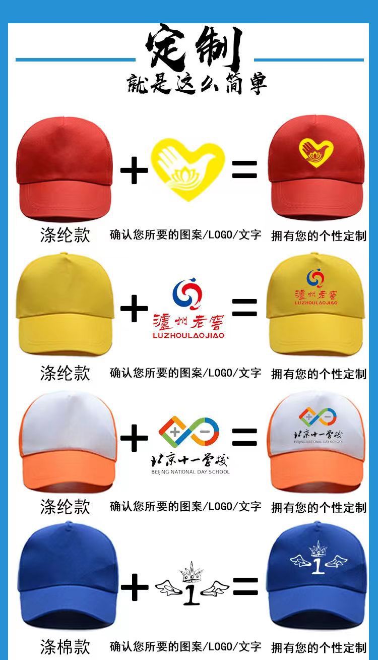 一、帽子面料:涤纶、涤棉,环保无纺布等,现货涤纶面料为主,其他面料定做请联系卖家。