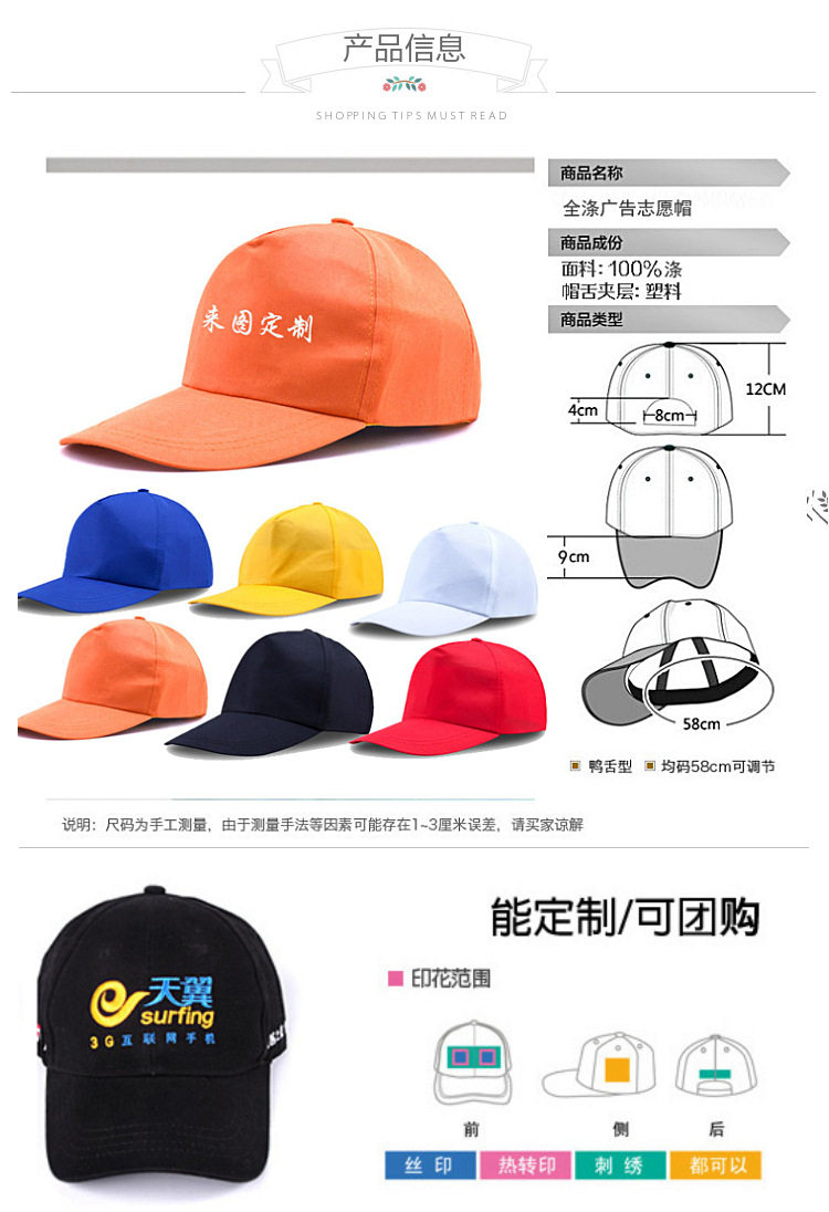 四、光板帽子50顶起售,印字帽子30顶起售。详情请联系卖家。