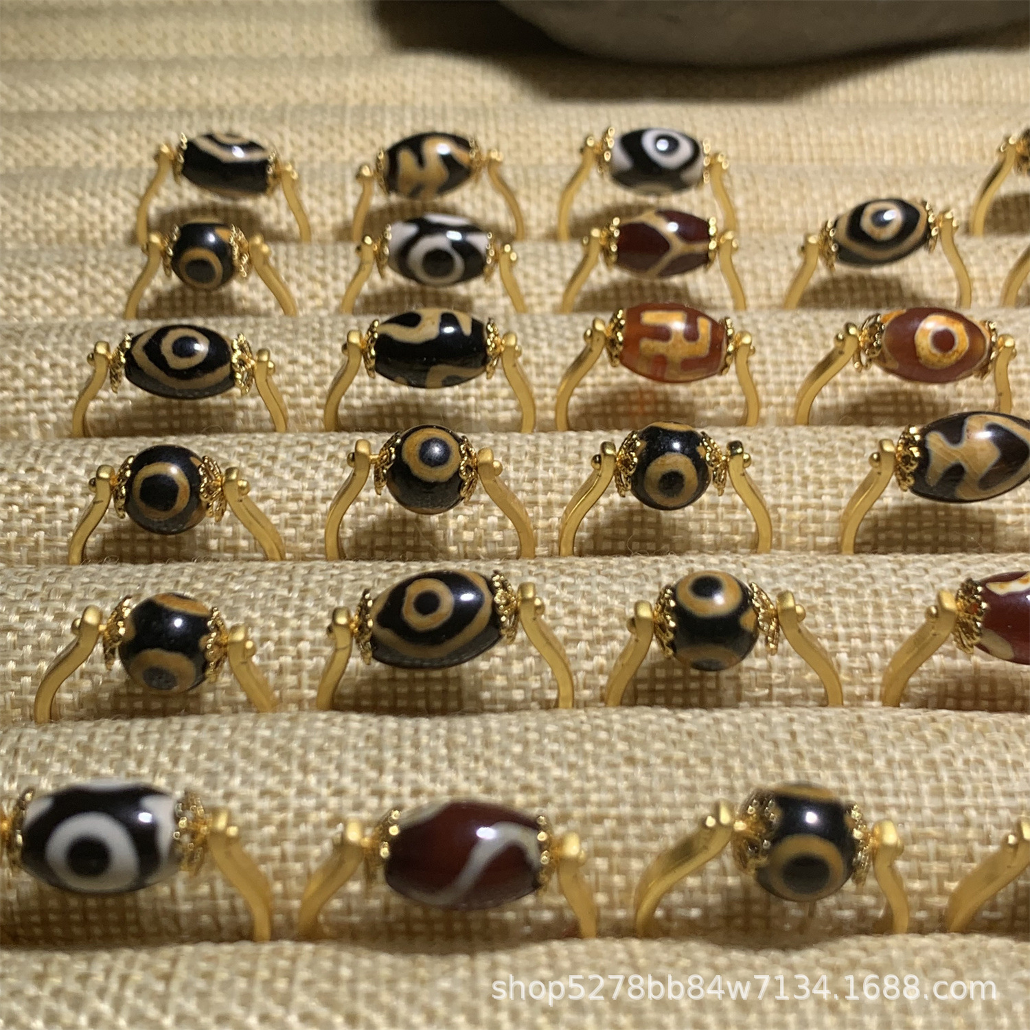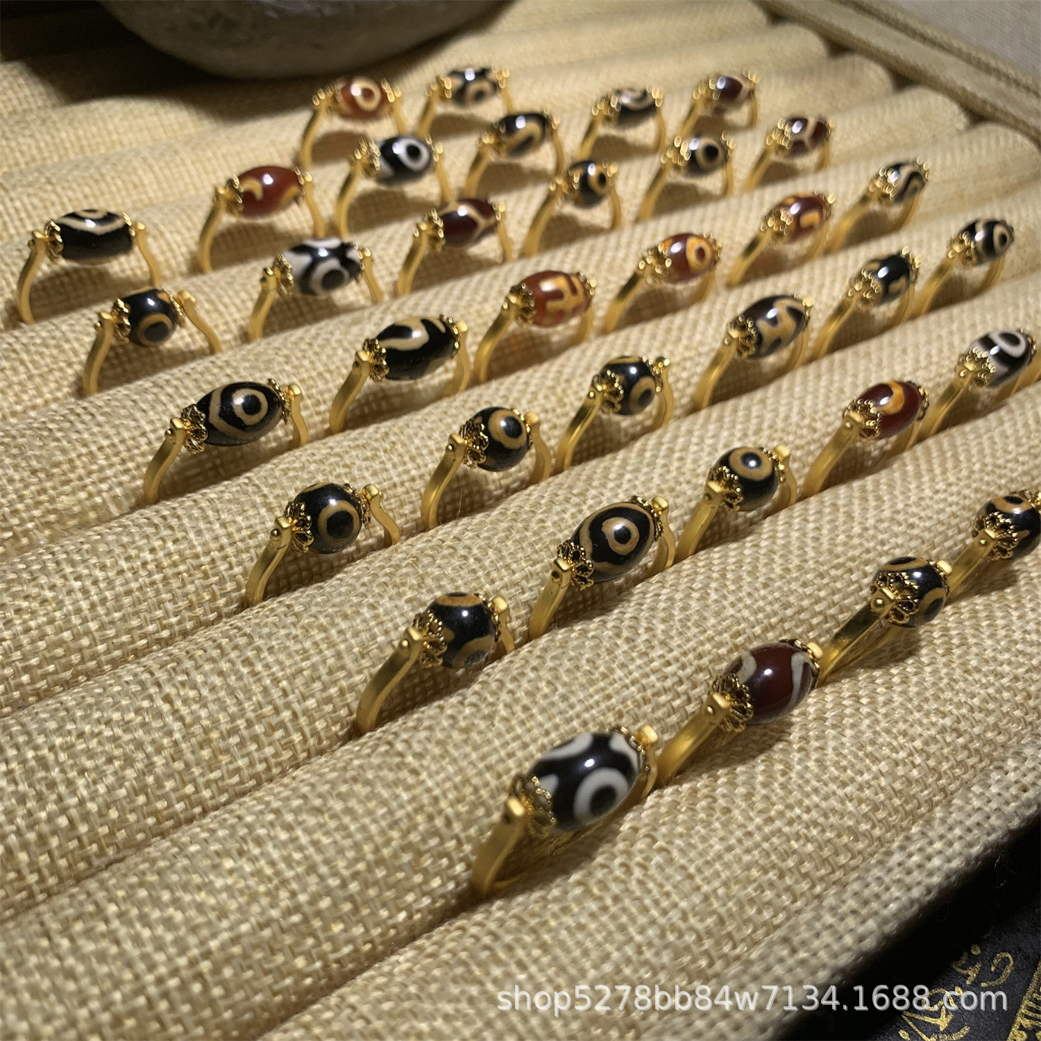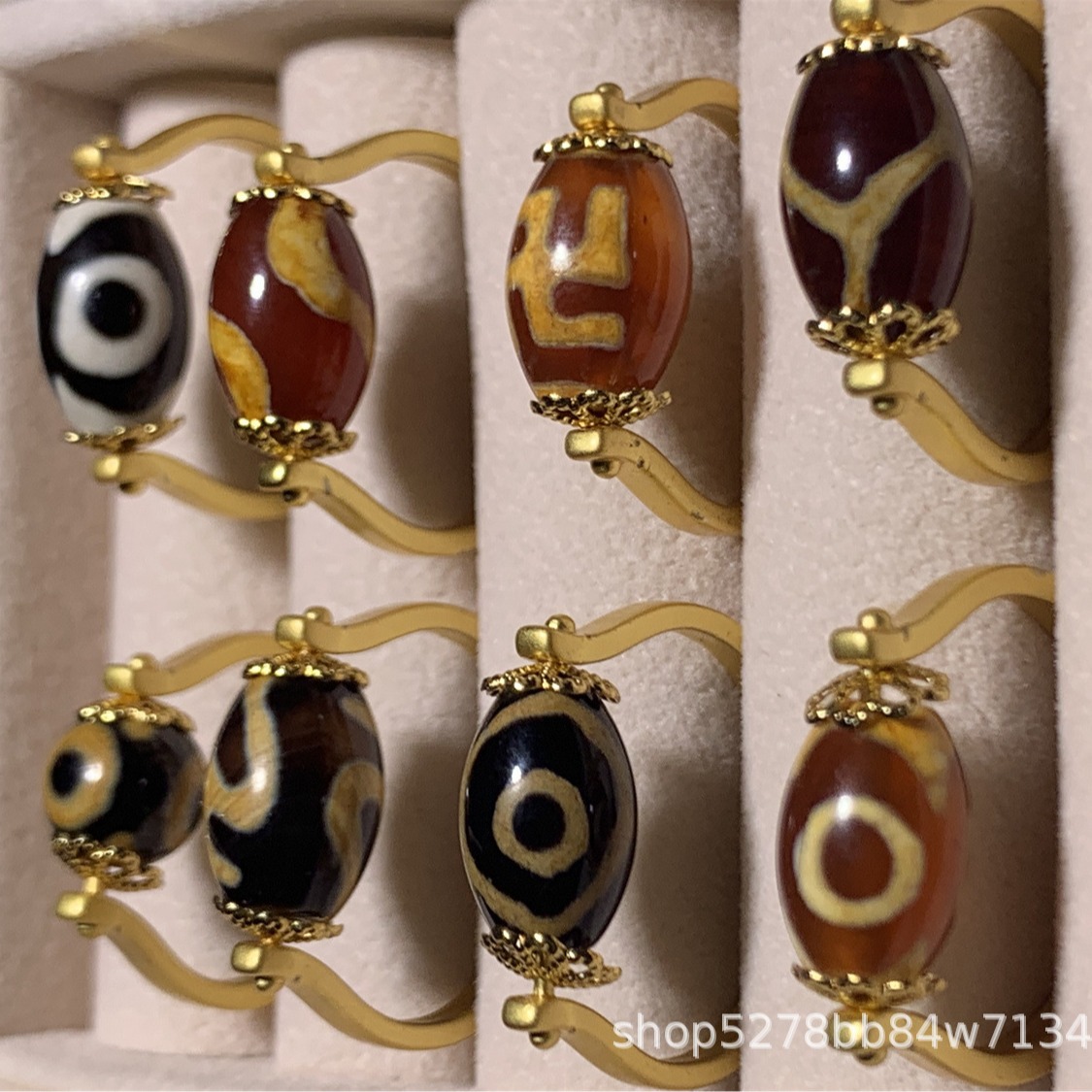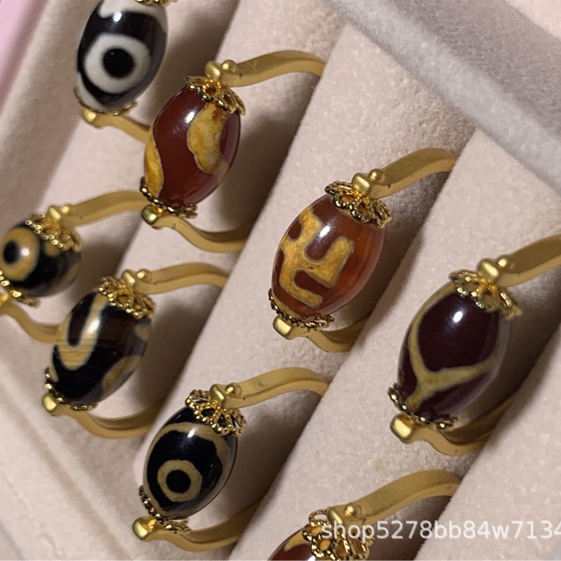 眼睛图案玛瑙天珠戒指,直播热推,有多种图案:wang字、三眼、宝瓶、龟甲等,越南沙金镶嵌,简约时尚,转运珠款式。