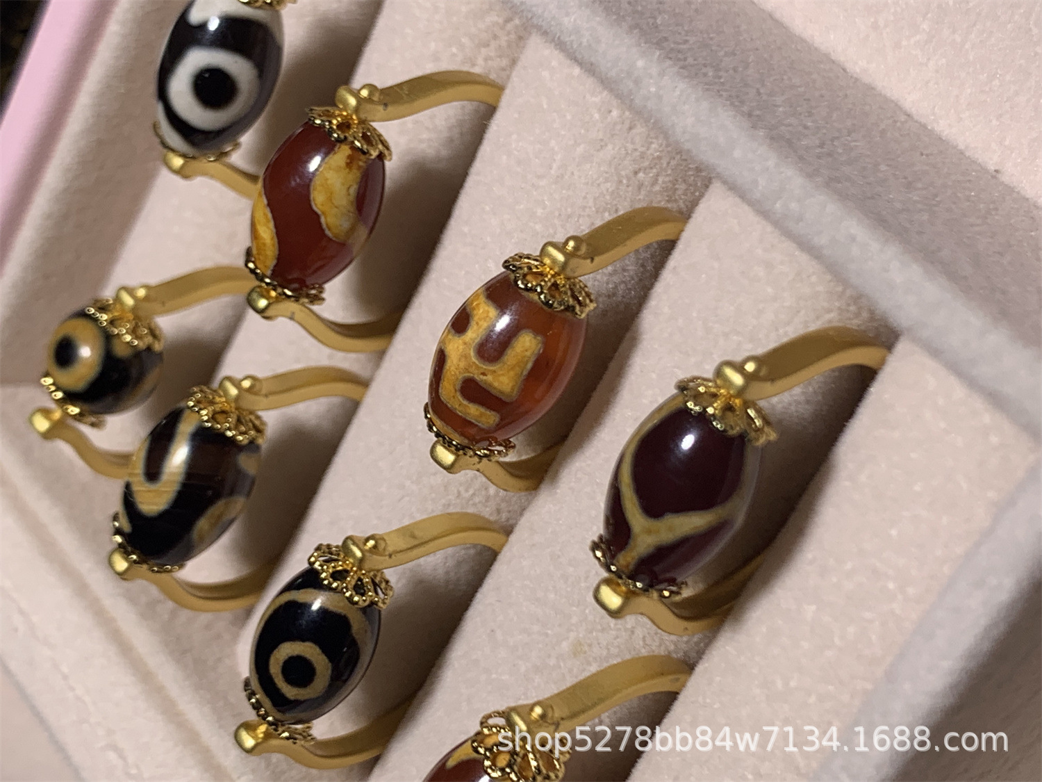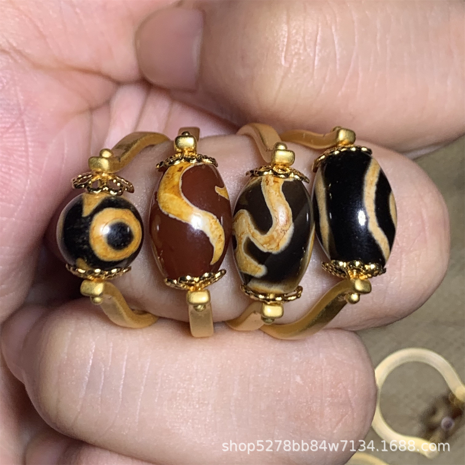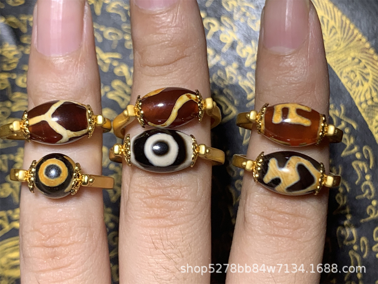 眼睛图案玛瑙天珠戒指,直播热推,有多种图案:wang字、三眼、宝瓶、龟甲等,越南沙金镶嵌,简约时尚,转运珠款式。