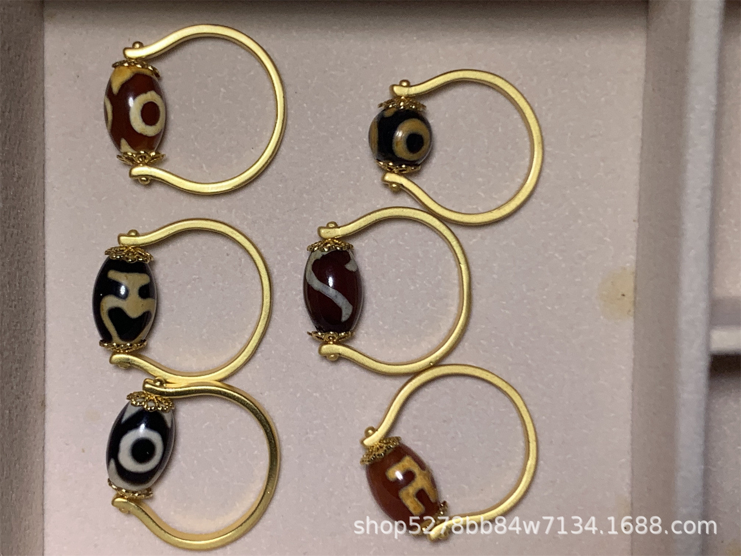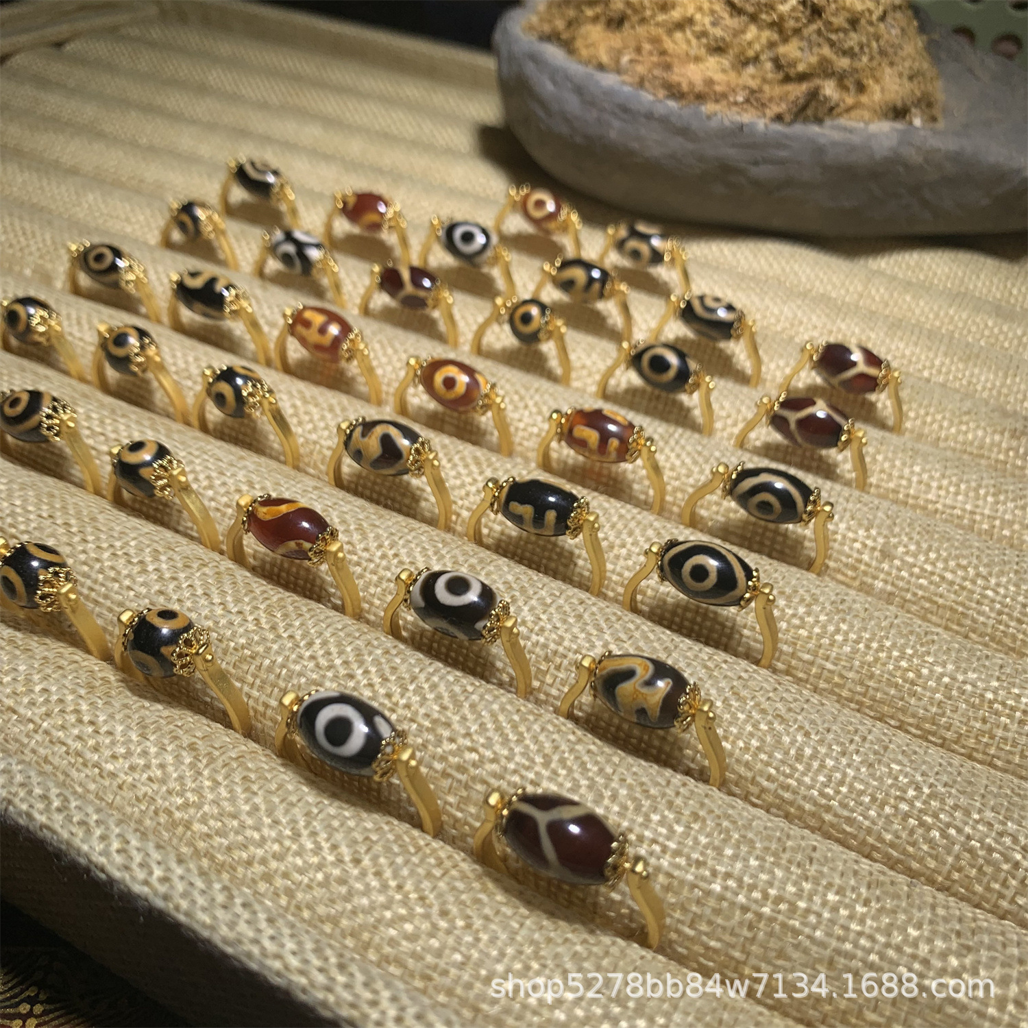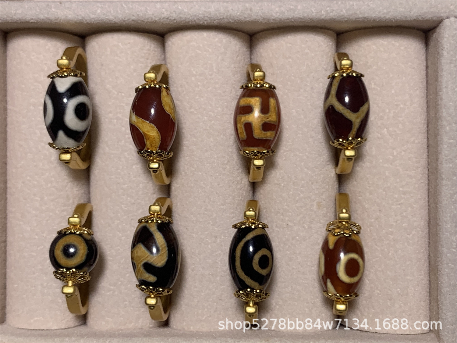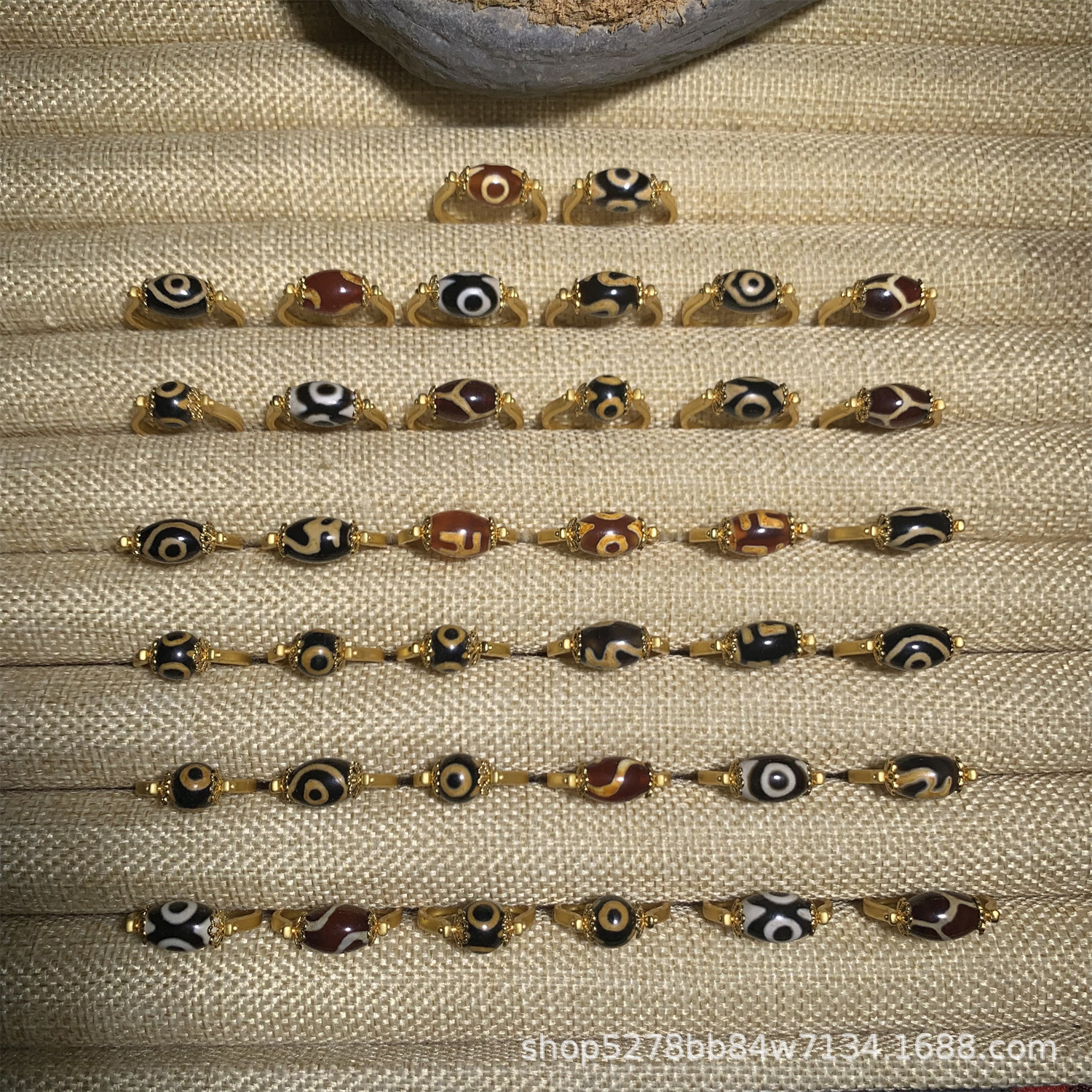眼睛图案玛瑙天珠戒指,直播热推,有多种图案:wang字、三眼、宝瓶、龟甲等,越南沙金镶嵌,简约时尚,转运珠款式。