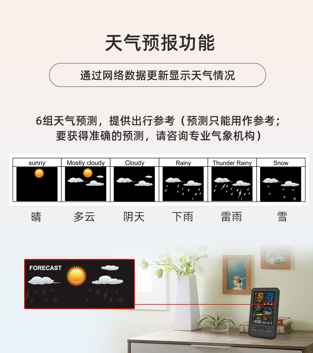 (6)常规包装清单:1*气象钟,1*USB电源线,1*户外传感器,1*多国语言说明书,1*安装配件包。