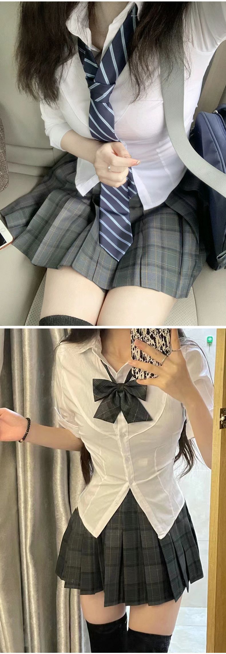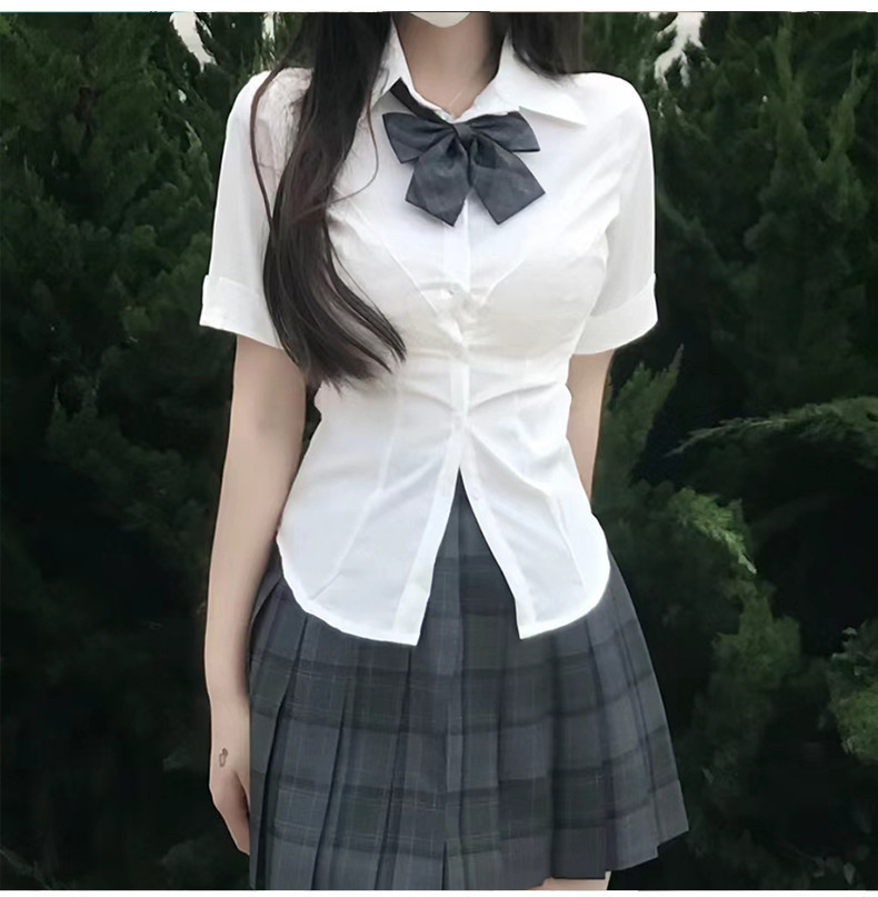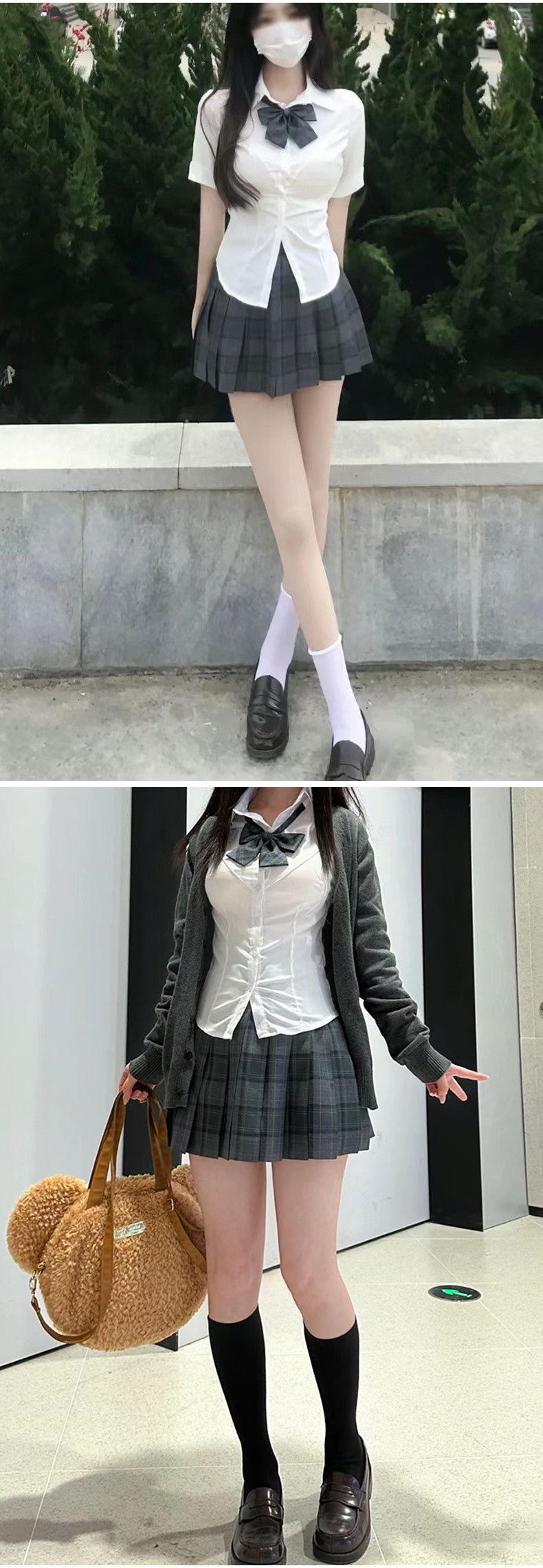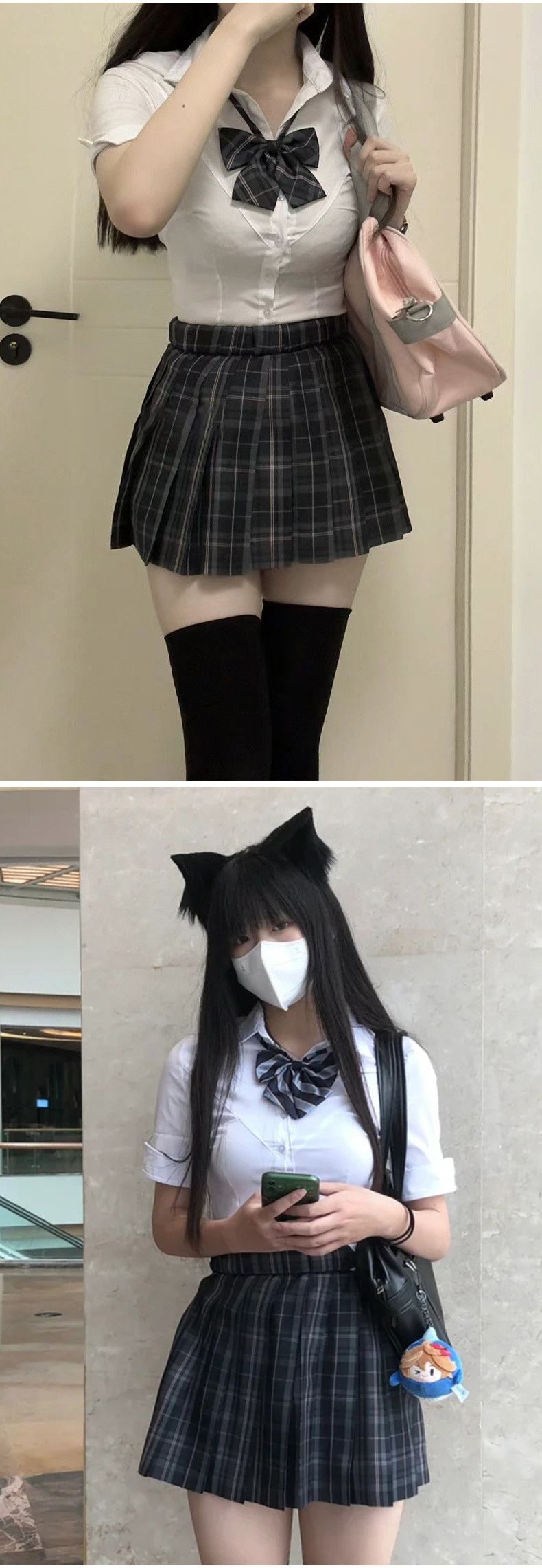 Короткие рукава с талией + галстук-бабочка темно-серого цвета.; Длинные рукава с талией + галстук-бабочка темно-серого цвета.; Короткие рукава, облегающие талию + темно-серый галстук-бабочка + темно-серая юбка; Длинные рукава с талией + галстук-бабочка темно-серого цвета + юбка темно-серого цвета.; Темно-серая юбка; Короткие рукава с талией + красный галстук-бабочка.; Длинные рукава с талией + красный галстук-бабочка.; Короткие рукава, облегающие талию + красный галстук-бабочка + черная юбка; Длинные рукава с талией + красный галстук-бабочка + черная юбка; черная юбка; Короткие рукава с талией; Длинные рукава с талией; Маленькая V-образная рубашка с короткими рукавами, облегающая талию + галстук-бабочка серого цвета + юбка в клетку серого цвета; Маленькая V-образная рубашка с длинными рукавами, облегающая талию + галстук-бабочка серого цвета + юбка в клетку серого цвета