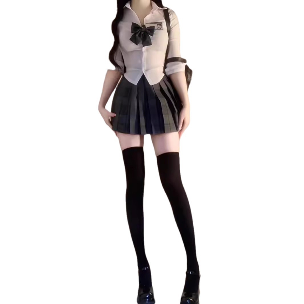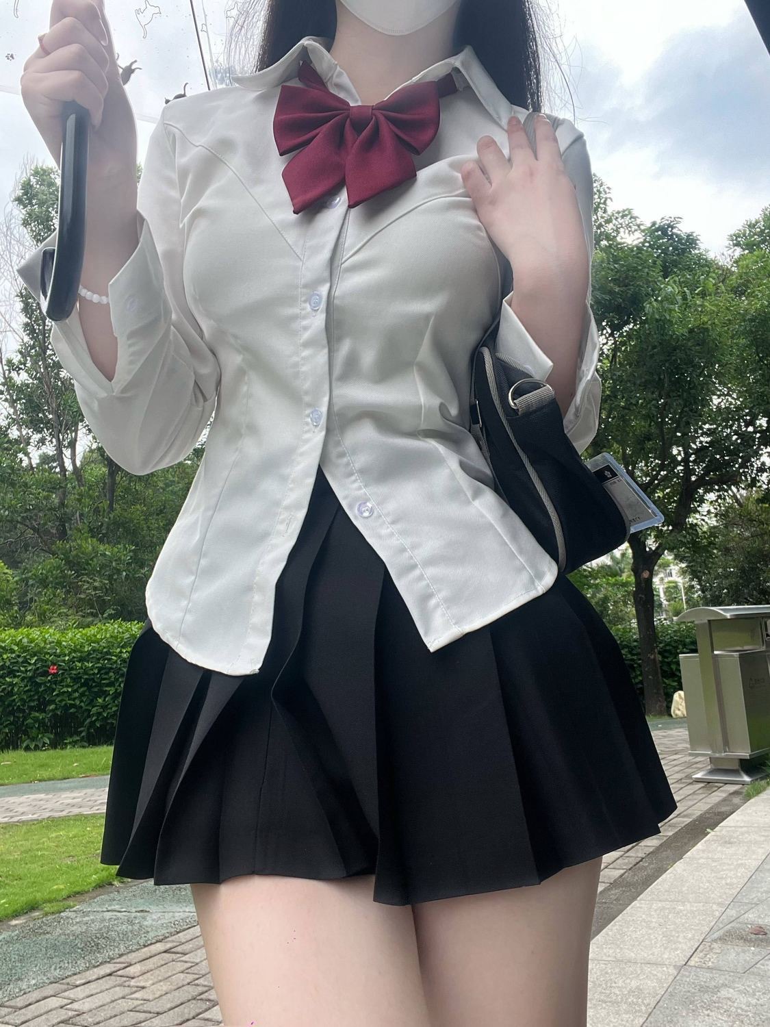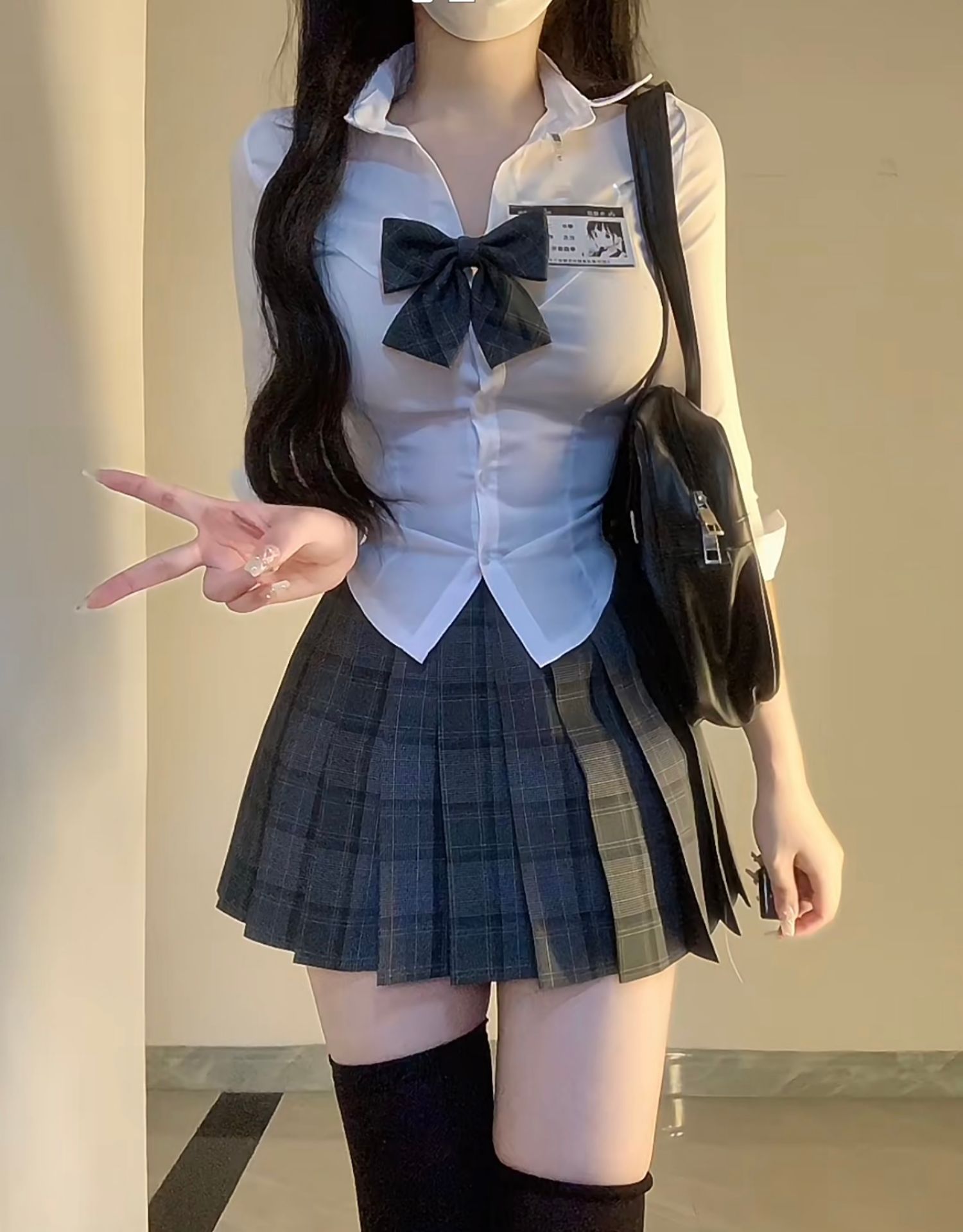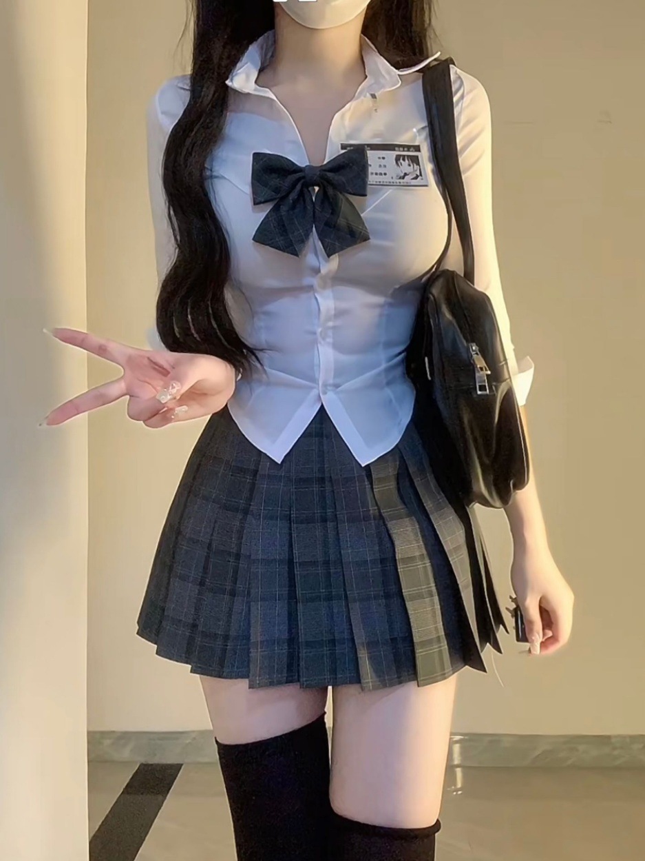 Короткие рукава с талией + галстук-бабочка темно-серого цвета.; Длинные рукава с талией + галстук-бабочка темно-серого цвета.; Короткие рукава, облегающие талию + темно-серый галстук-бабочка + темно-серая юбка; Длинные рукава с талией + галстук-бабочка темно-серого цвета + юбка темно-серого цвета.; Темно-серая юбка; Короткие рукава с талией + красный галстук-бабочка.; Длинные рукава с талией + красный галстук-бабочка.; Короткие рукава, облегающие талию + красный галстук-бабочка + черная юбка; Длинные рукава с талией + красный галстук-бабочка + черная юбка; черная юбка; Короткие рукава с талией; Длинные рукава с талией; Маленькая V-образная рубашка с короткими рукавами, облегающая талию + галстук-бабочка серого цвета + юбка в клетку серого цвета; Маленькая V-образная рубашка с длинными рукавами, облегающая талию + галстук-бабочка серого цвета + юбка в клетку серого цвета