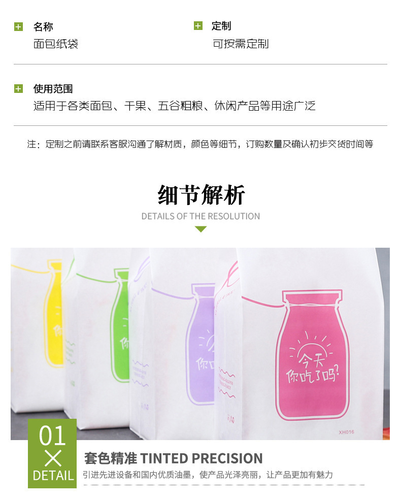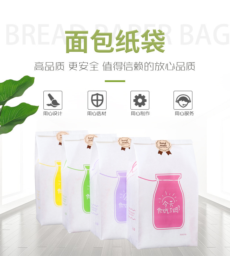Оконный мешок для хлеба небольшого размера (23*12*5 см); Оконный мешок для хлеба среднего размера (30*12*9 см); Оконный мешок для хлеба большого размера (35*21*9см); Полуоткрытый пакет для хлеба с окном; Безоконная сумка с заостренным дном; Индивидуальные окна и вентиляционные отверстия