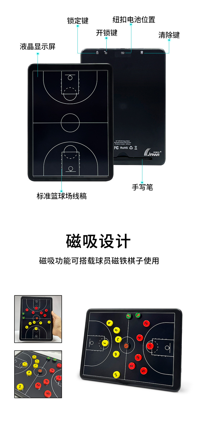 Баскетбольный футбол магнитное всасывание Тактическая доска Электронный ЖК-экран Ручной планшет Профессиональный тренер