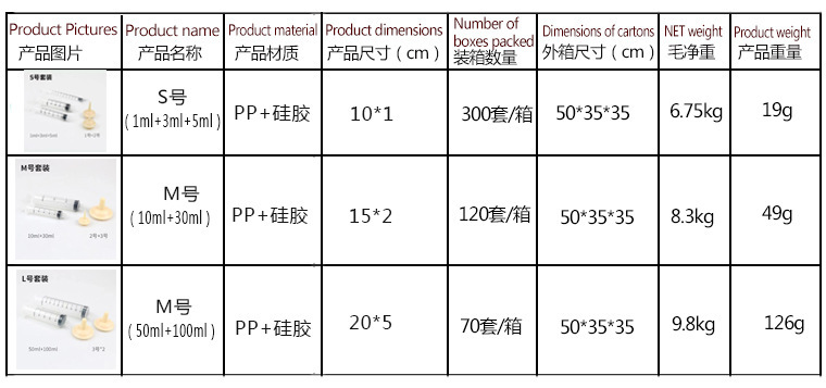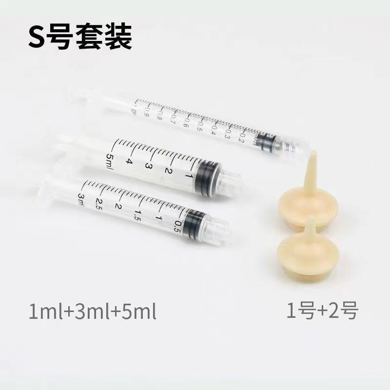 Одинарный (короткий сосок); Одинарный (длинный сосок); Одинарная (большая соска); Одинарный (1 мл) шприц; Одинарный (3 мл) шприц; Одинарный (5 мл) шприц; Одинарный (10 мл) шприц; Одиночный шприц (30 мл).; Одинарный шприц (50/60 мл).; Одинарный (100 мл) шприц; Комплект из 5 предметов размера S (короткая соска + длинная соска + 1 мл + 3 мл + 5 мл); Набор из 4 предметов размера М (длинная соска + большая соска + 10 мл + 30 мл); Набор из 4 предметов размера L (большая соска*2+50 мл+100 мл)