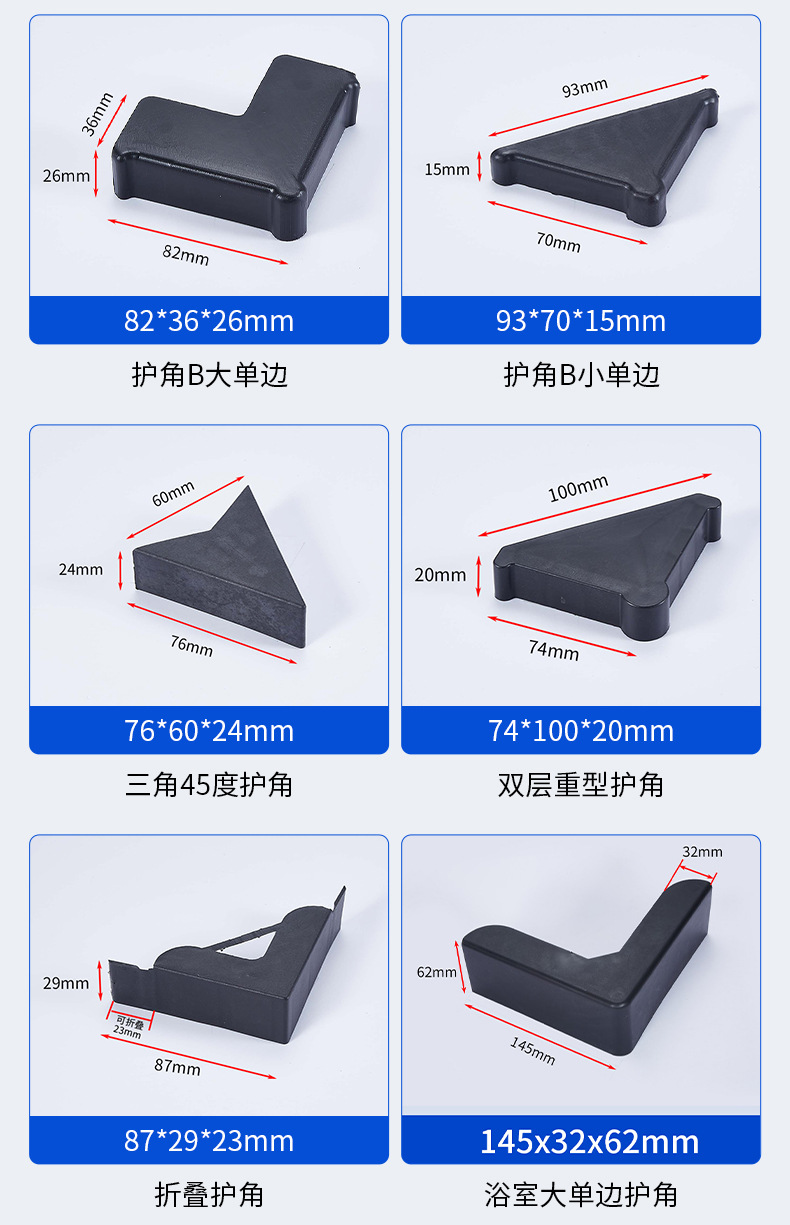 Складная угловая защита; Угловая защита Большая односторонняя; Угловая защита B, большая, односторонняя; Угловой протектор B маленький, односторонний; Треугольный угловой протектор 45 градусов.; Двухслойная сверхпрочная угловая защита; Угловой протектор AC28; Большой односторонний угловой протектор для ванной комнаты.