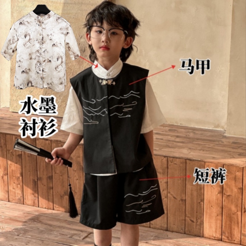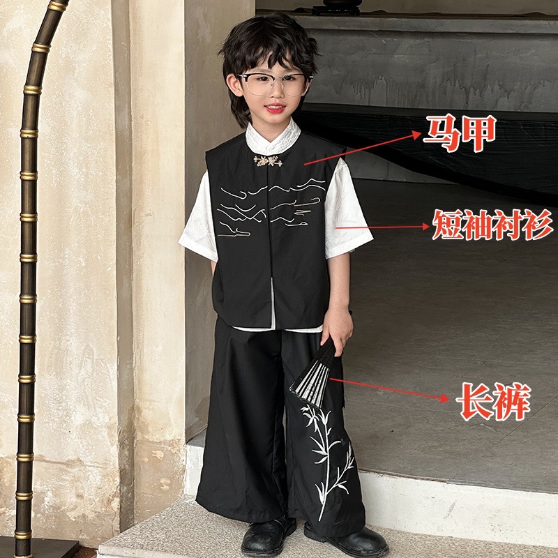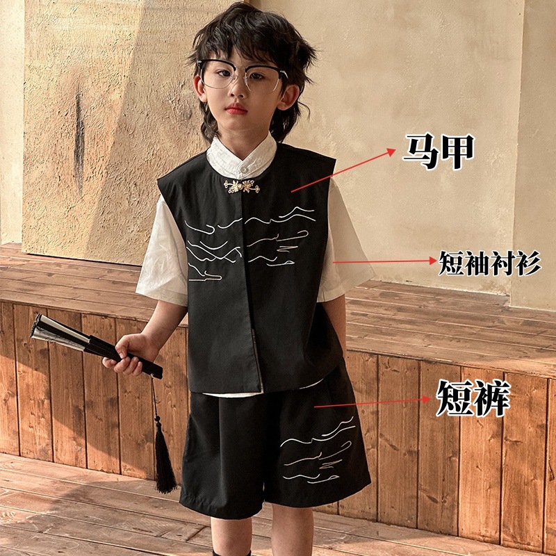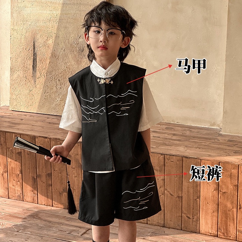 Костюм для мальчиков Hanfu 2024 летний новый китайский стиль жилет ретро повседневный красивый костюм для мальчиков