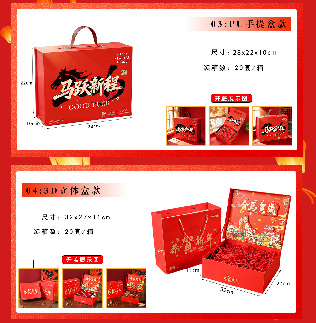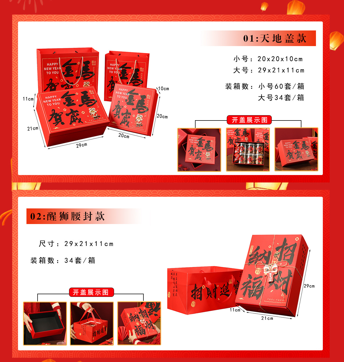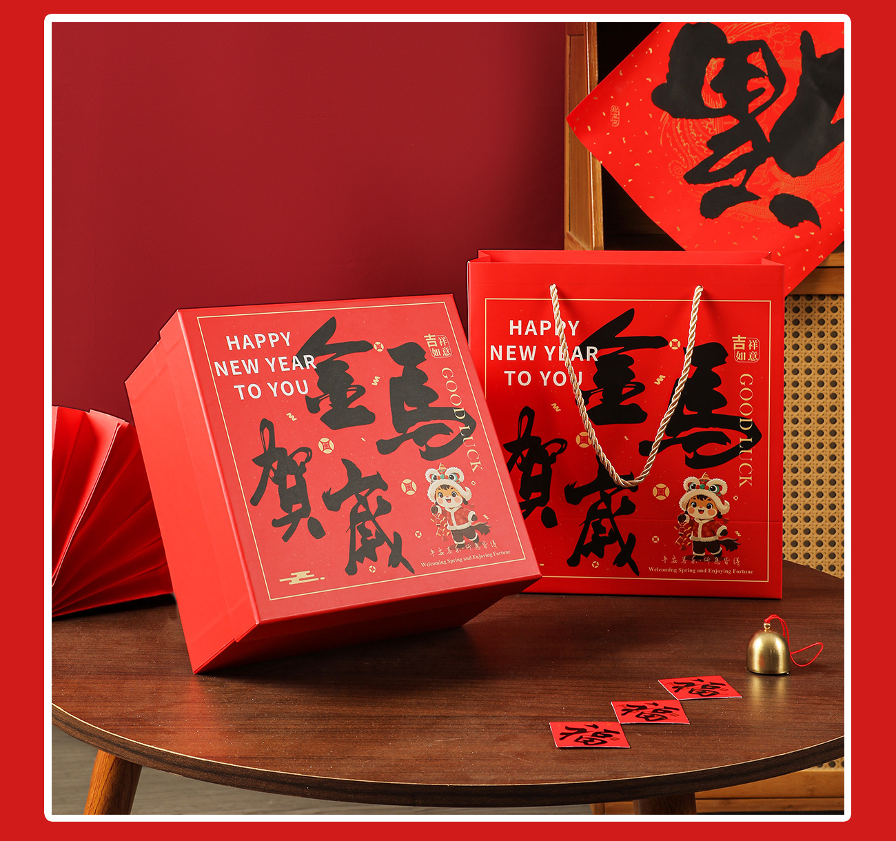 Небо и Земля. Маленькая коробка (20x20x10 см); Новый год; Небо и Земля, большая крышка (29x21x11 см); Новый год; Подходящая коробка большого размера (28x22x10 см); Новый год; Трёхмерная коробка большого размера (32x27x11 см); Новый год; Поясная печать «Танец льва» - большая (29x21x11 см); Новый год; Интерьерный набор из 2 предметов (рафия + поздравительная открытка); Новый год; Открытки с пожеланиями (2 штуки); Новый год
