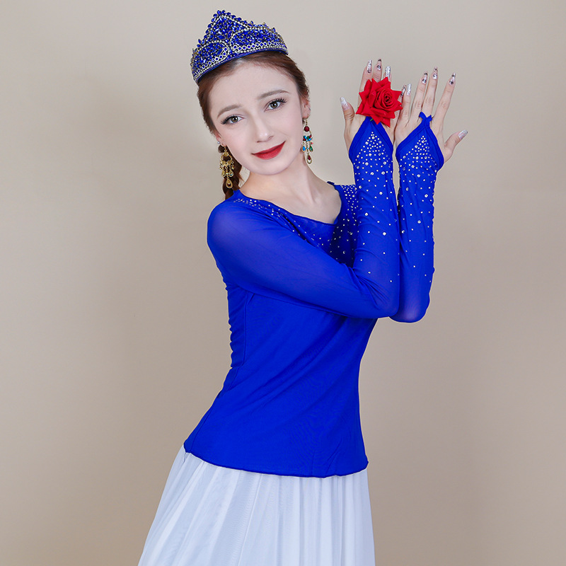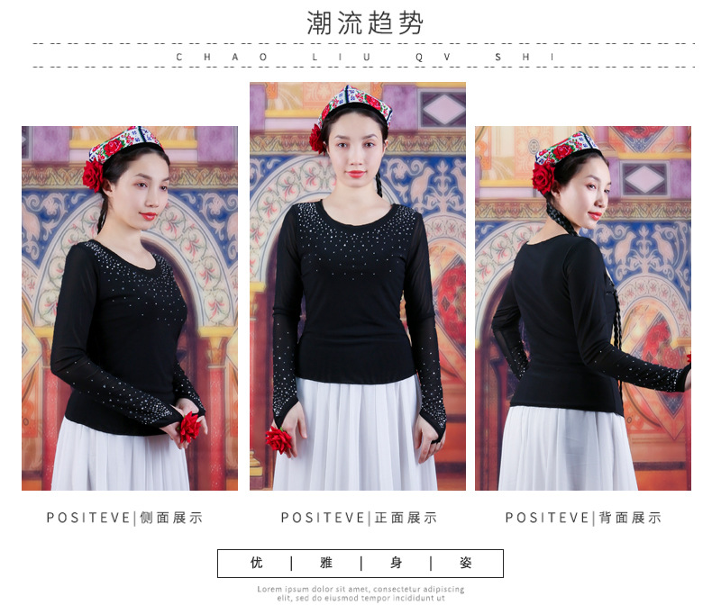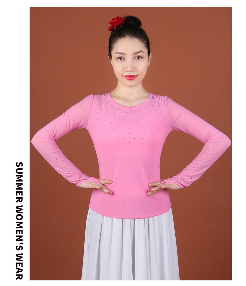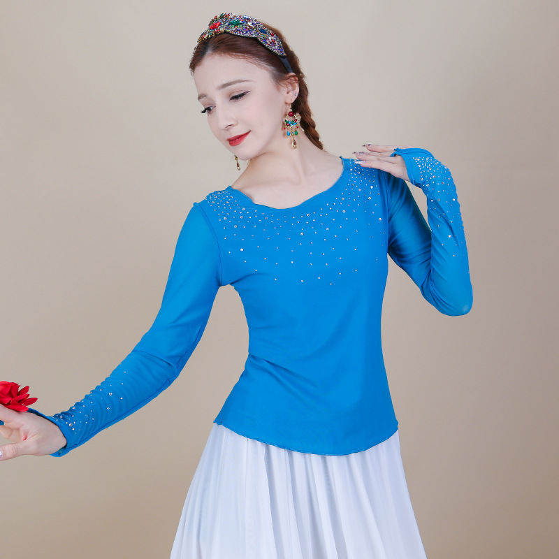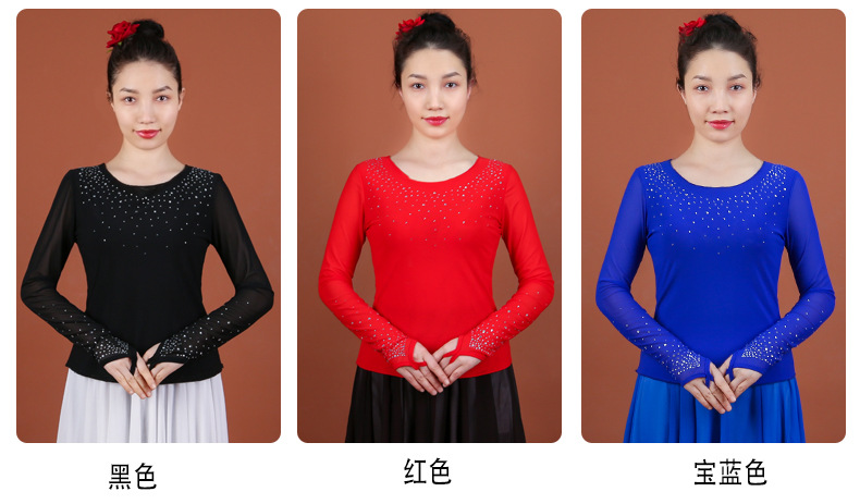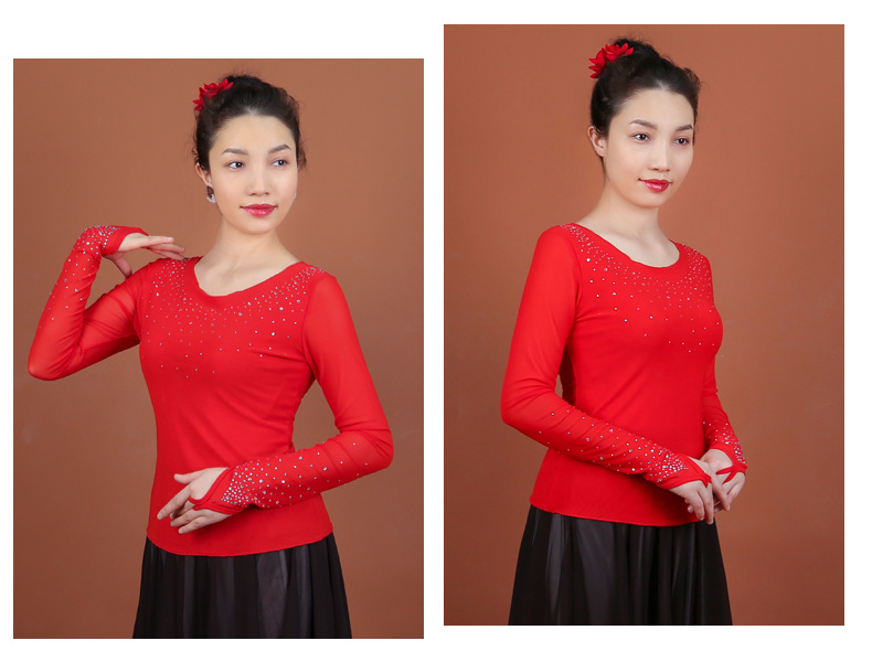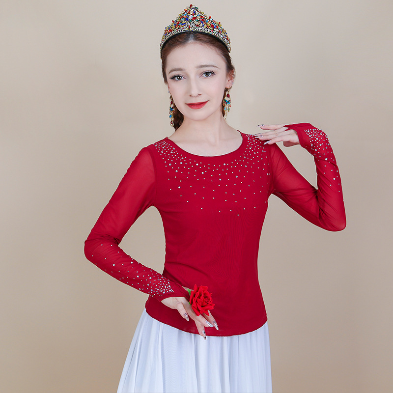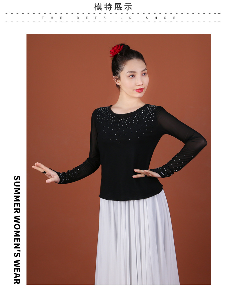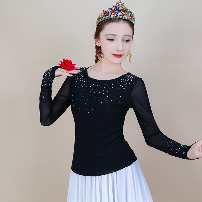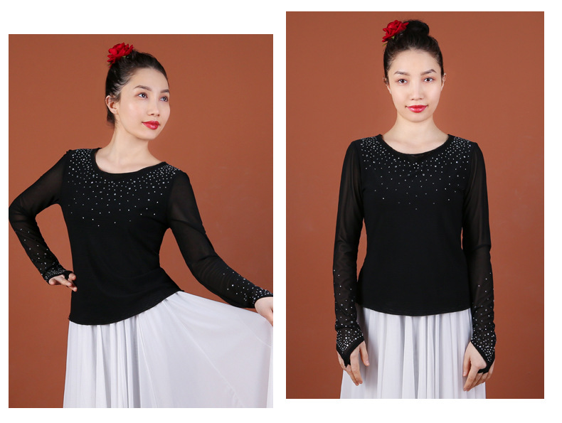 Танцевальный костюм в этническом стиле из Синьцзяна, для базовых тренировок, из сетчатой ткани, черная блузка с отверстиями для пальцев, сетчатый топ с камнями, в китайском стиле