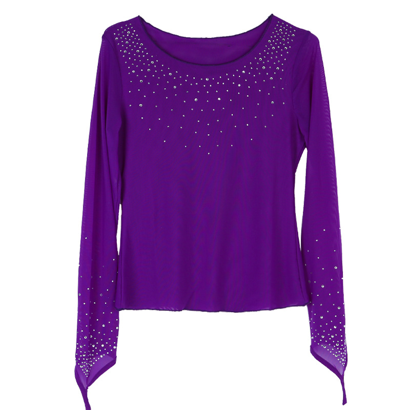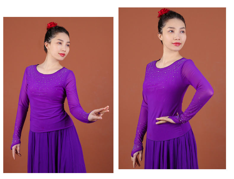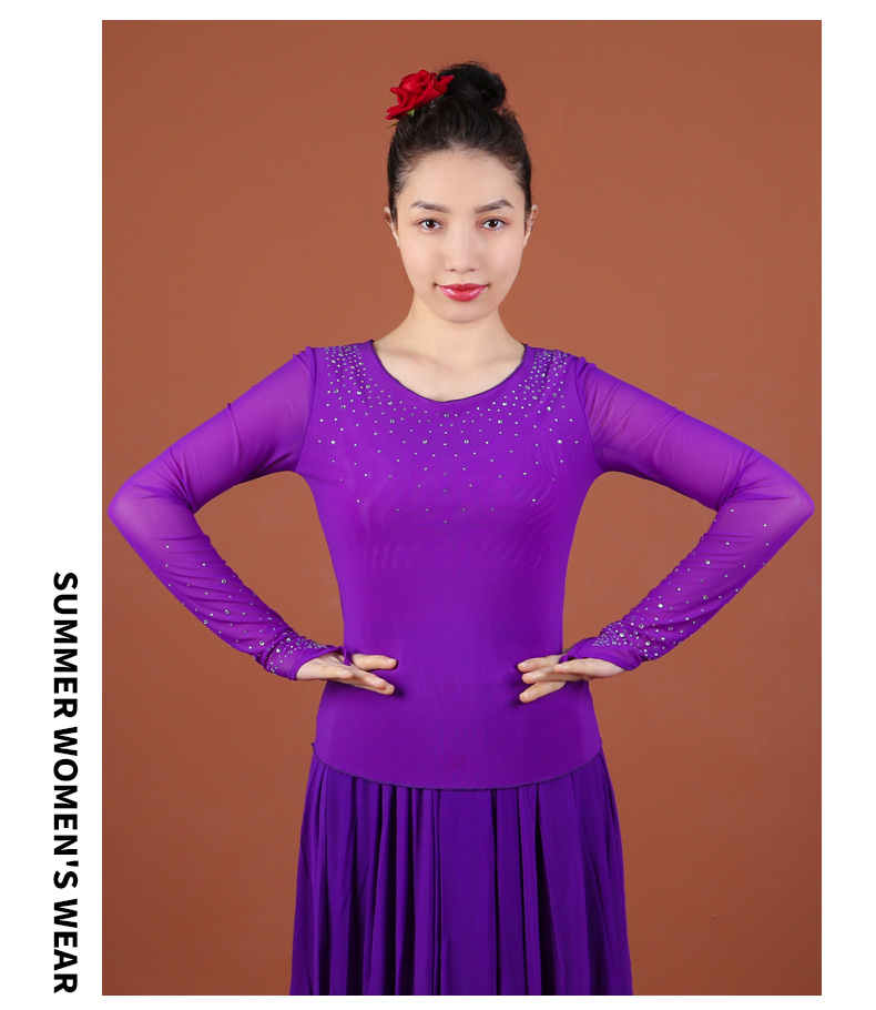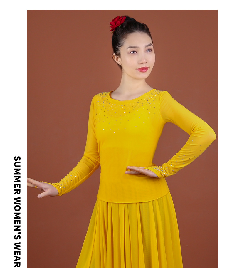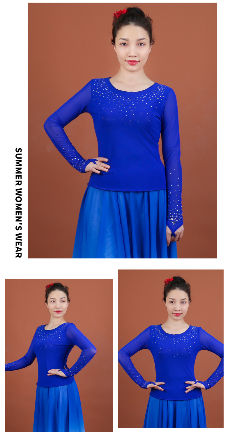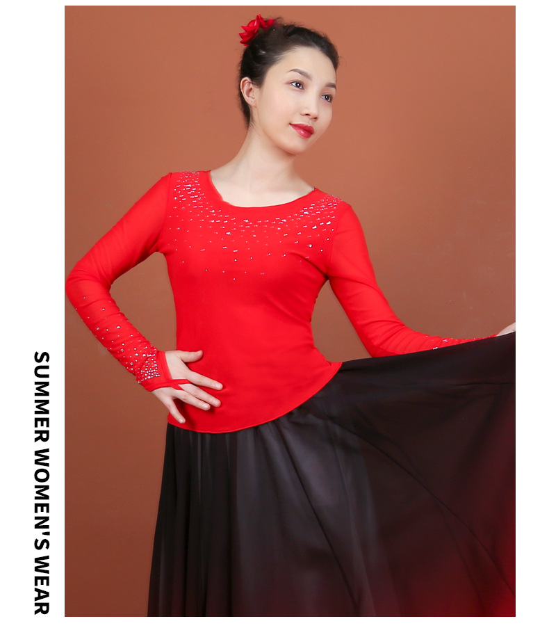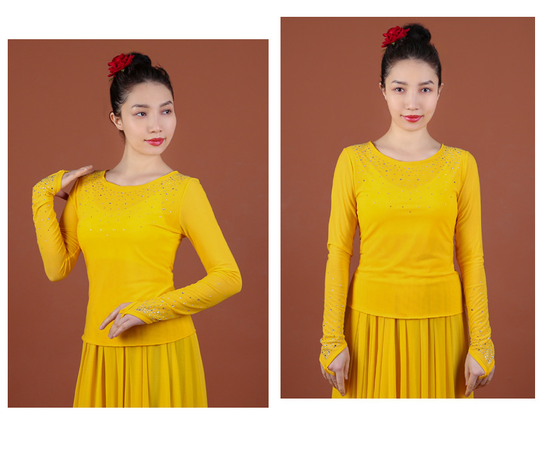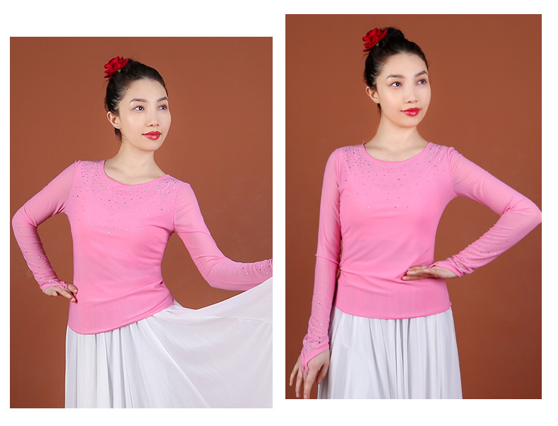 Танцевальный костюм в этническом стиле из Синьцзяна, для базовых тренировок, из сетчатой ткани, черная блузка с отверстиями для пальцев, сетчатый топ с камнями, в китайском стиле