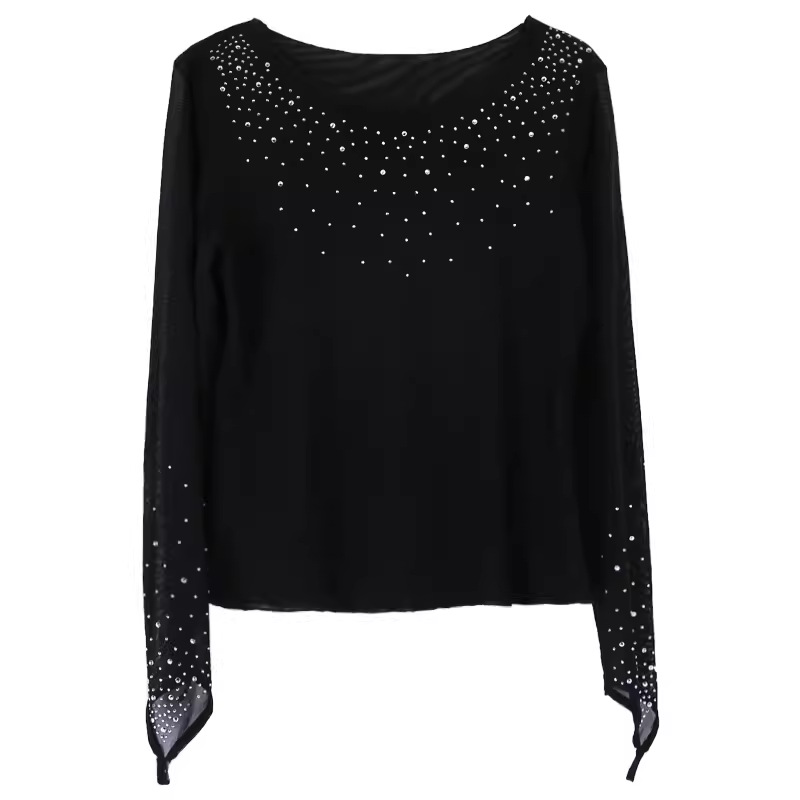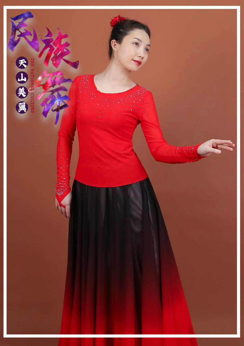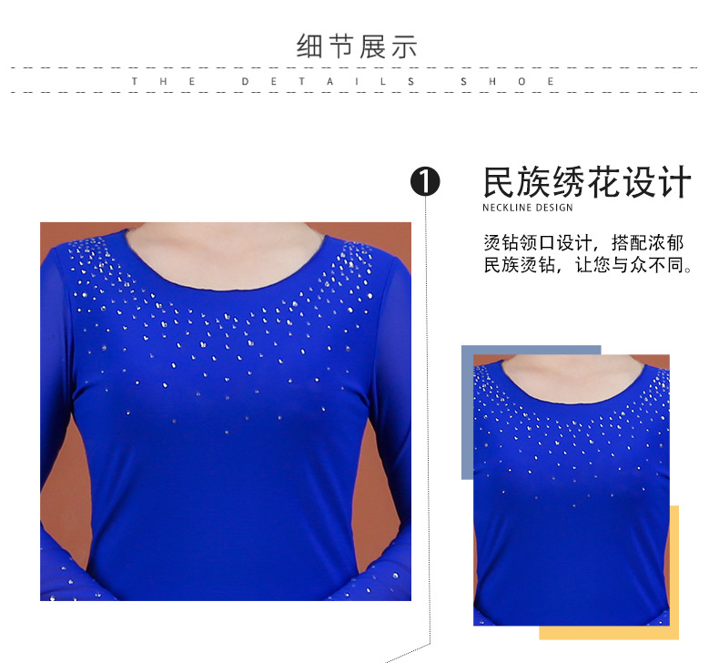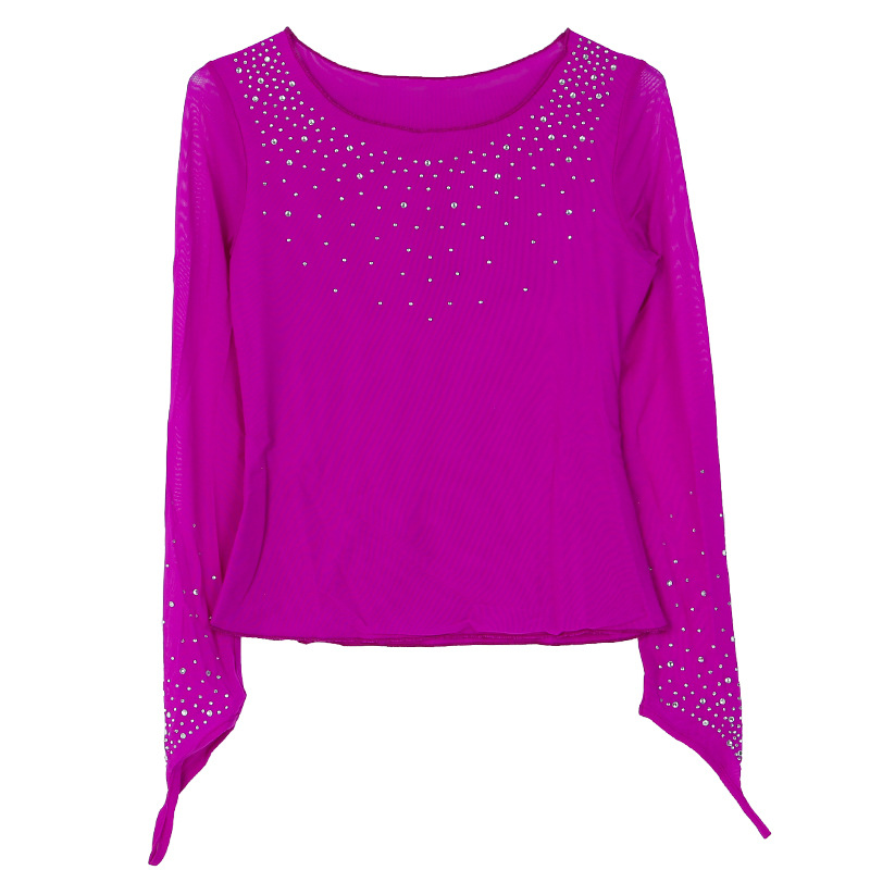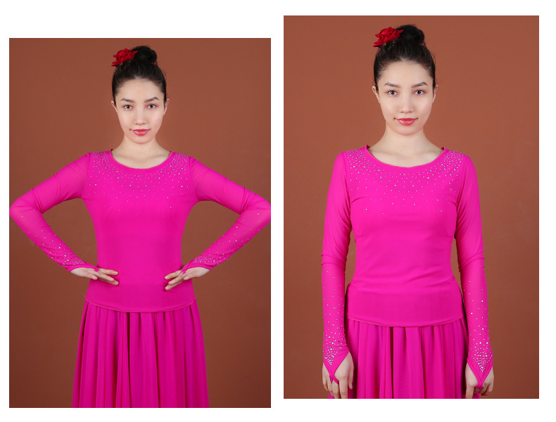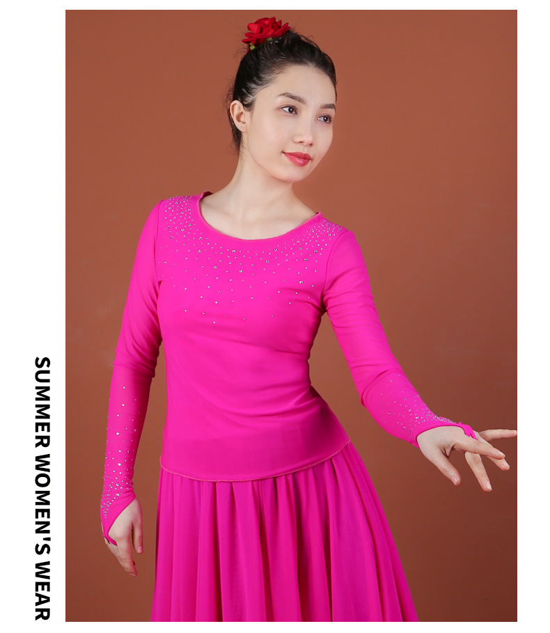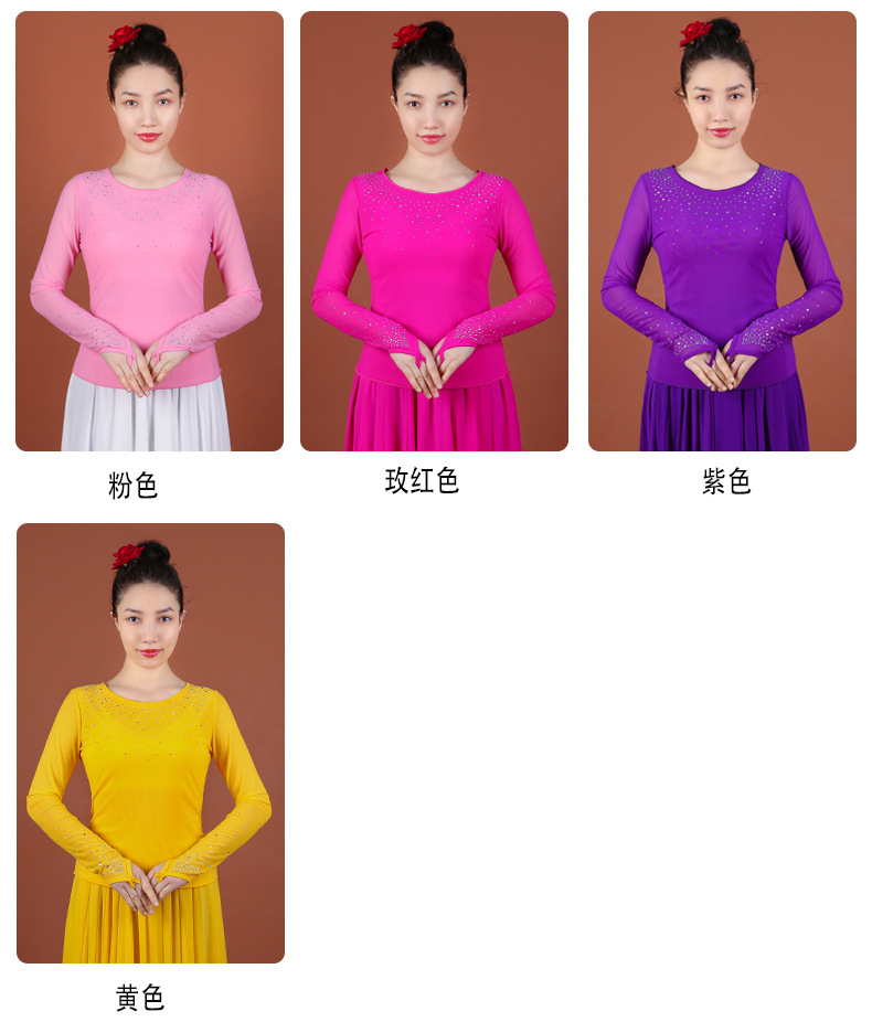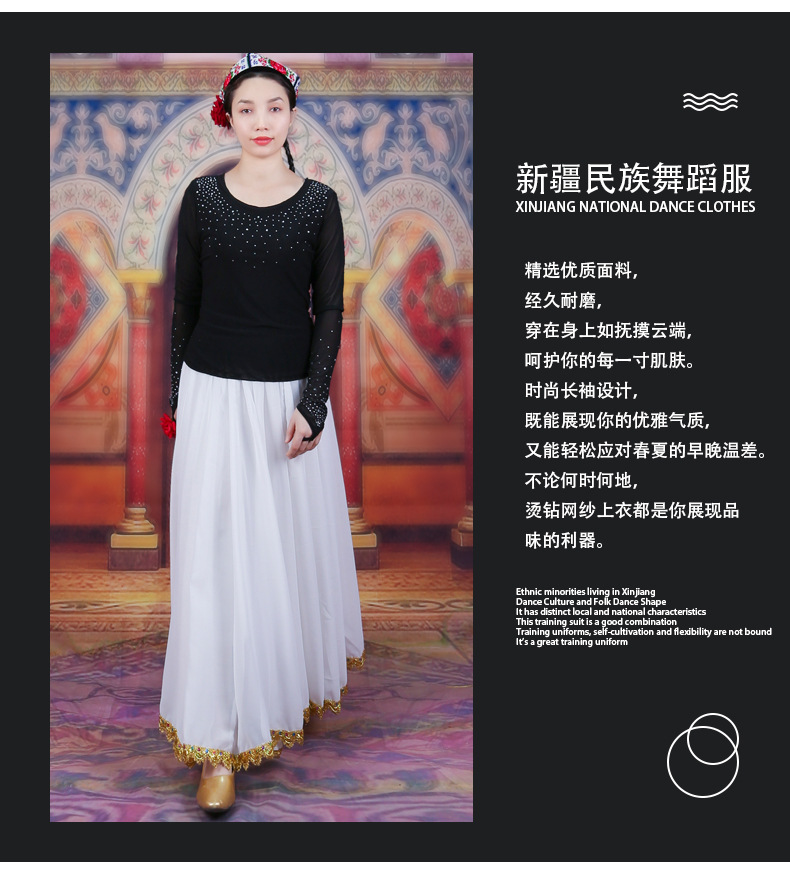 Танцевальный костюм в этническом стиле из Синьцзяна, для базовых тренировок, из сетчатой ткани, черная блузка с отверстиями для пальцев, сетчатый топ с камнями, в китайском стиле