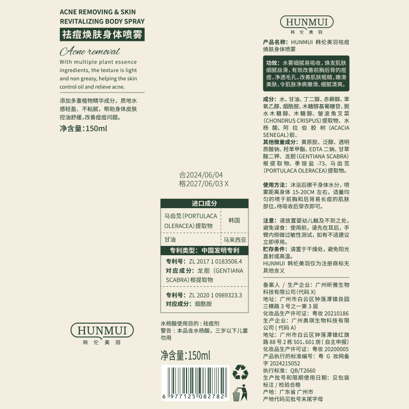 HUNMUI Han Lun Meiyu Спрей для тела против акне и омоложения
