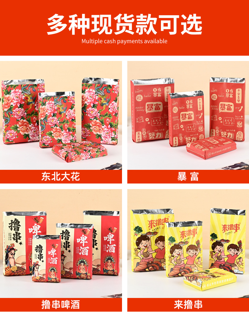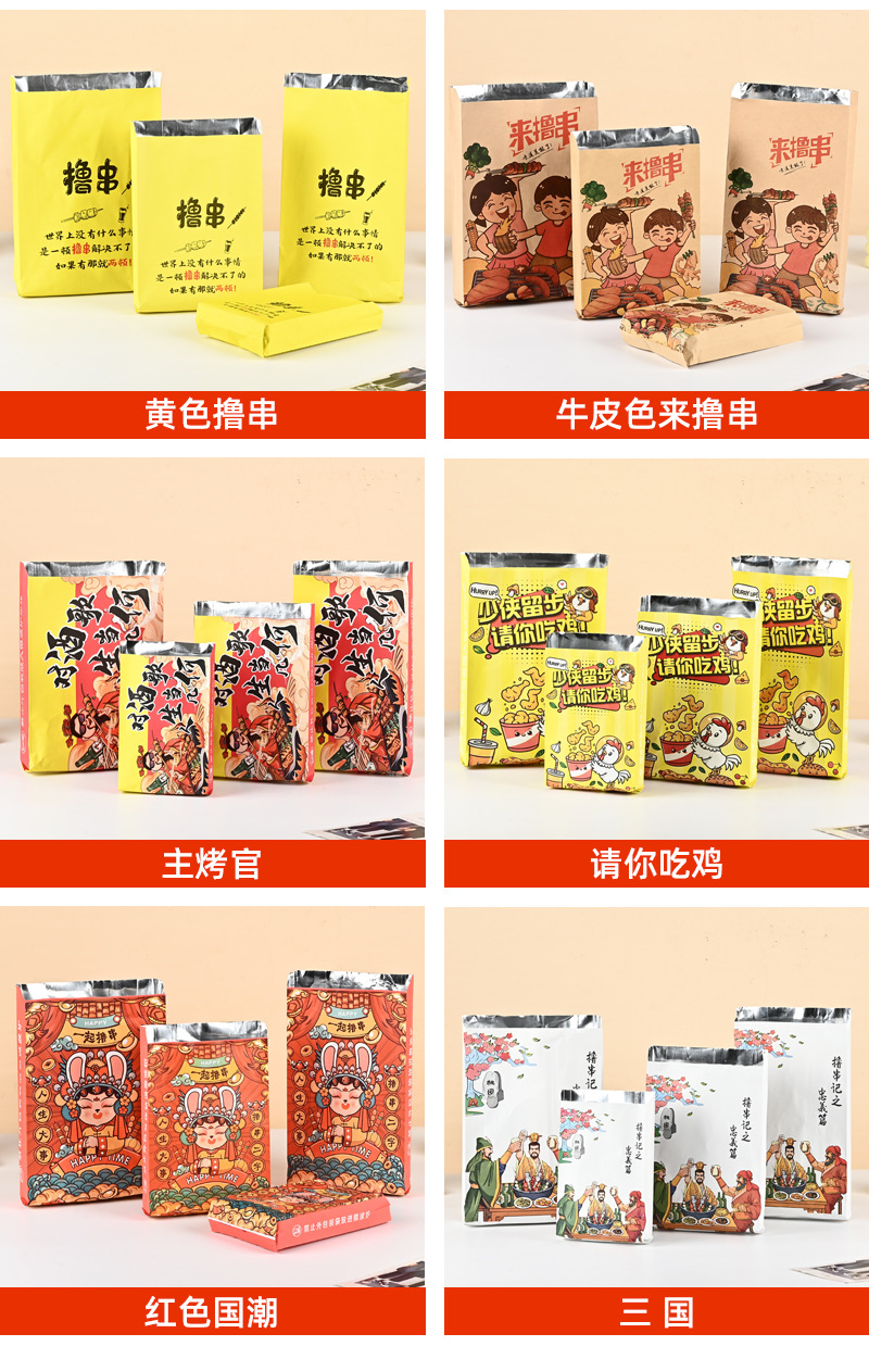 белый; желтый; красный; зеленый; три страны; Удачи; Вкус Синьцзян; солнечный пляж; Жадиный; Северо-восточный большой цветок; струна; желтая коровья кожа; Станьте богато на ночь; Будьте богаты; Офицер мастера выпечки; Приходите и учитесь; Пожалуйста, оставьтеся на гурманов; красная национальная тенденция; черная национальная тенденция; Пожалуйста, ешь курицу; Люлу'ер; синяя национальная тенденция; Пивные шампуры; Емкость денег; Желтые шампуры; Шампуры из воловьей кожи; Коровья кожа выводит веревку; герой коровьей кожи; белый фейерверк; Коровья кожа-феєрверк