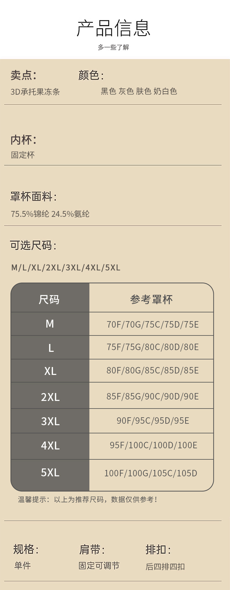 M(70F/70G/75C/75D/75E); L(75F/75G/80C/80D/80E); XL(80F/80G/85C/85D/85E); 2XL(85F/85G/90C/90D/90E); 3XL(90F/95C/95D/95E); 4XL(95F/100C/100D/100E); 5XL(100F/100G/105C/105D)