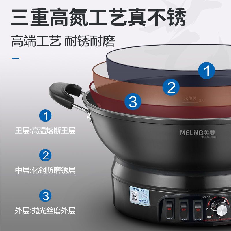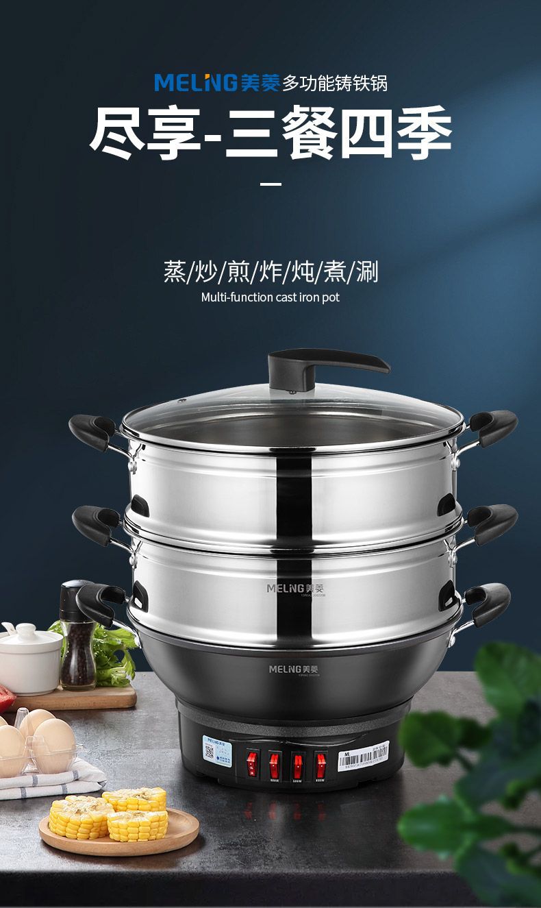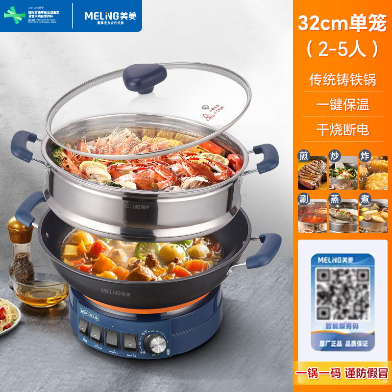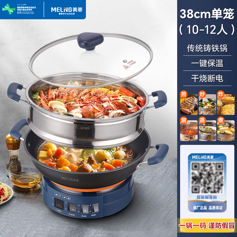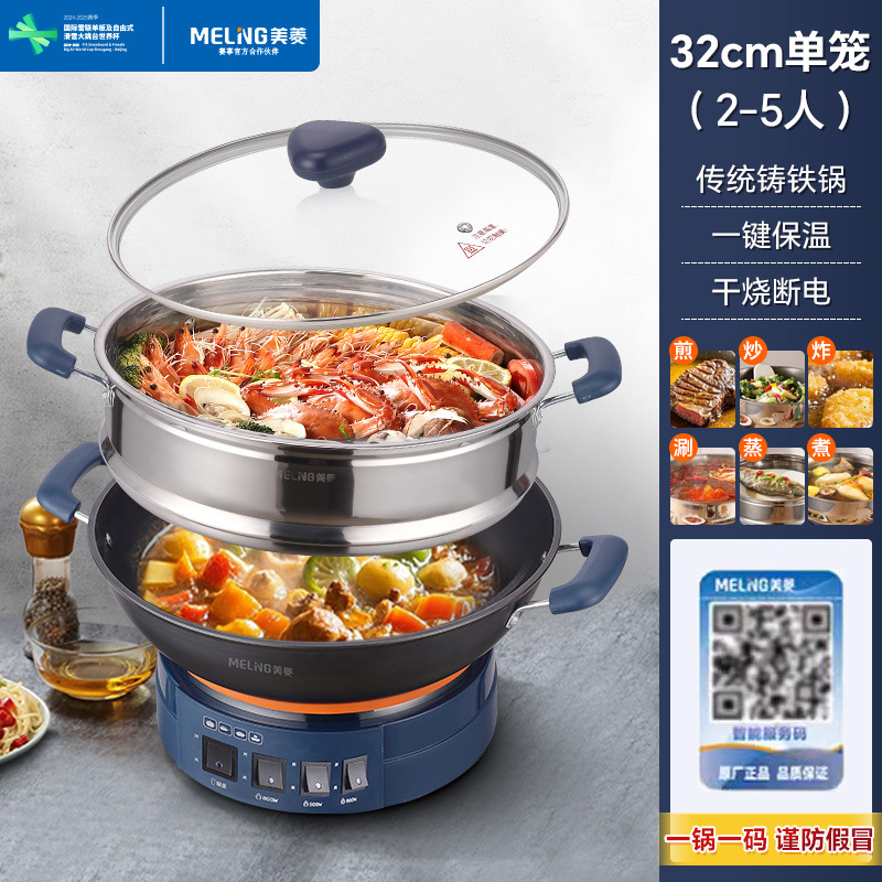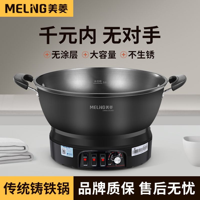 Чугунный электрический вок MeiLing, многофункциональный электрический горячий горшок для пропаривания, перемешивания, тушения и жарки с антипригарным покрытием, утолщенный электрический горячий горшок с клеткой