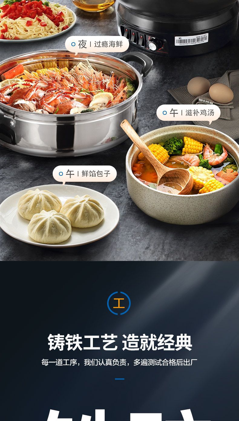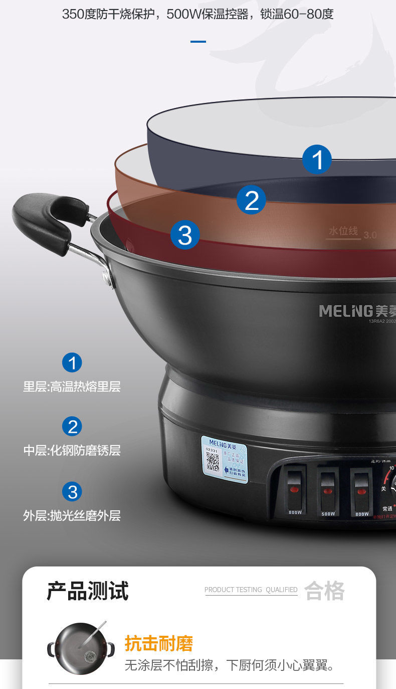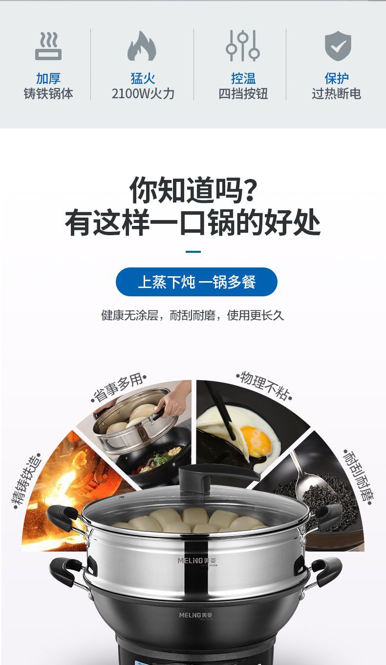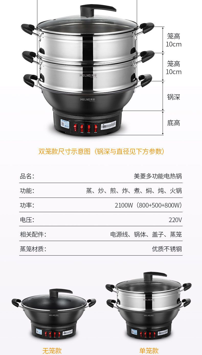 Чугунный электрический вок MeiLing, многофункциональный электрический горячий горшок для пропаривания, перемешивания, тушения и жарки с антипригарным покрытием, утолщенный электрический горячий горшок с клеткой