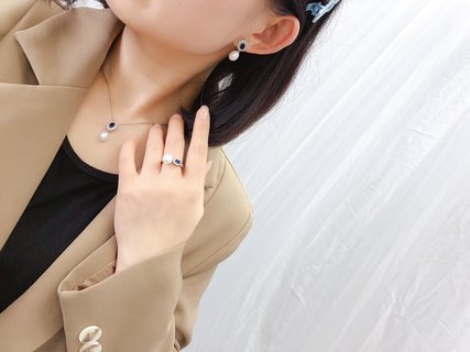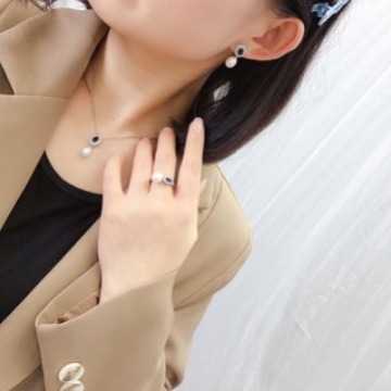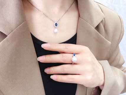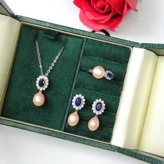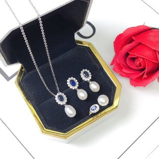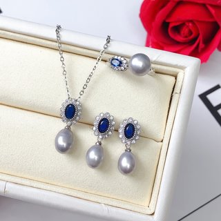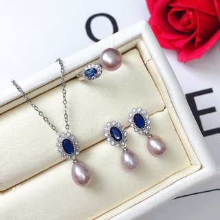 Синий бриллиант принцесса кружевной набор кулон серьги кольцо 7-9MM слева и справа пресноводный жемчуг изысканный простота