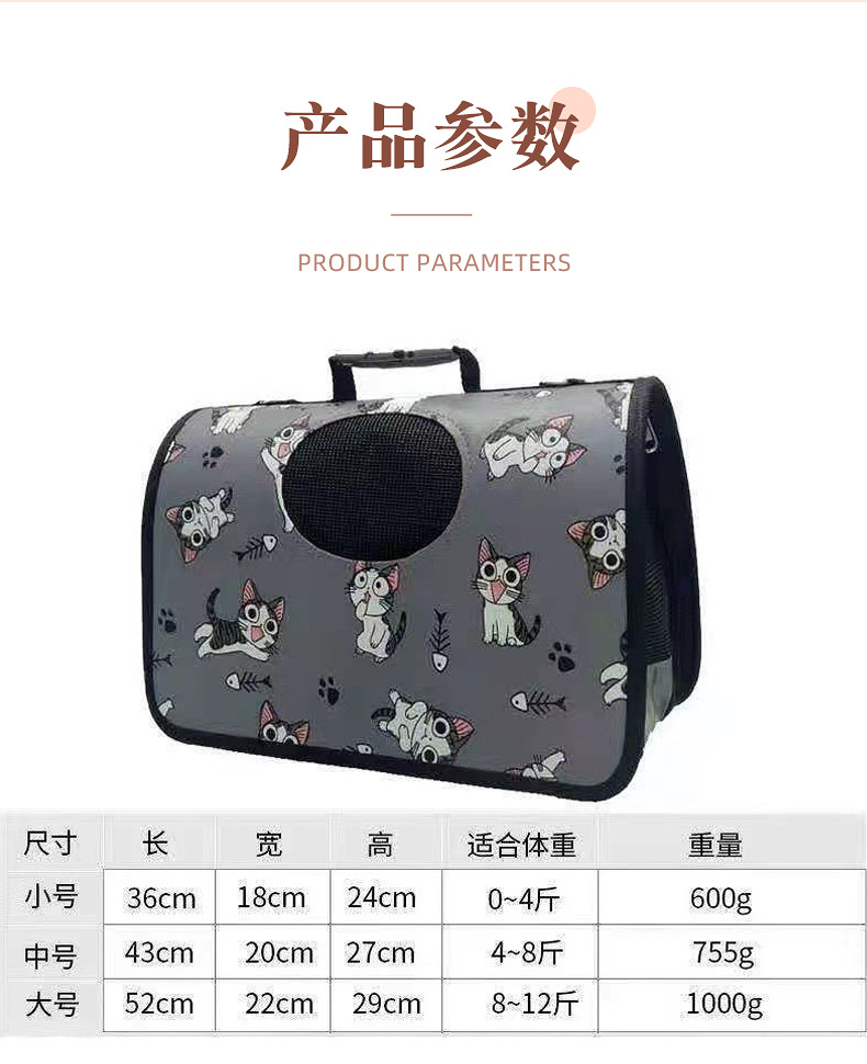 S(36*18*24) подходит для 0.5-2kg; М (43*20*27) подходит для 2-4kg; L(52*22*29) подходит для 4-6kg