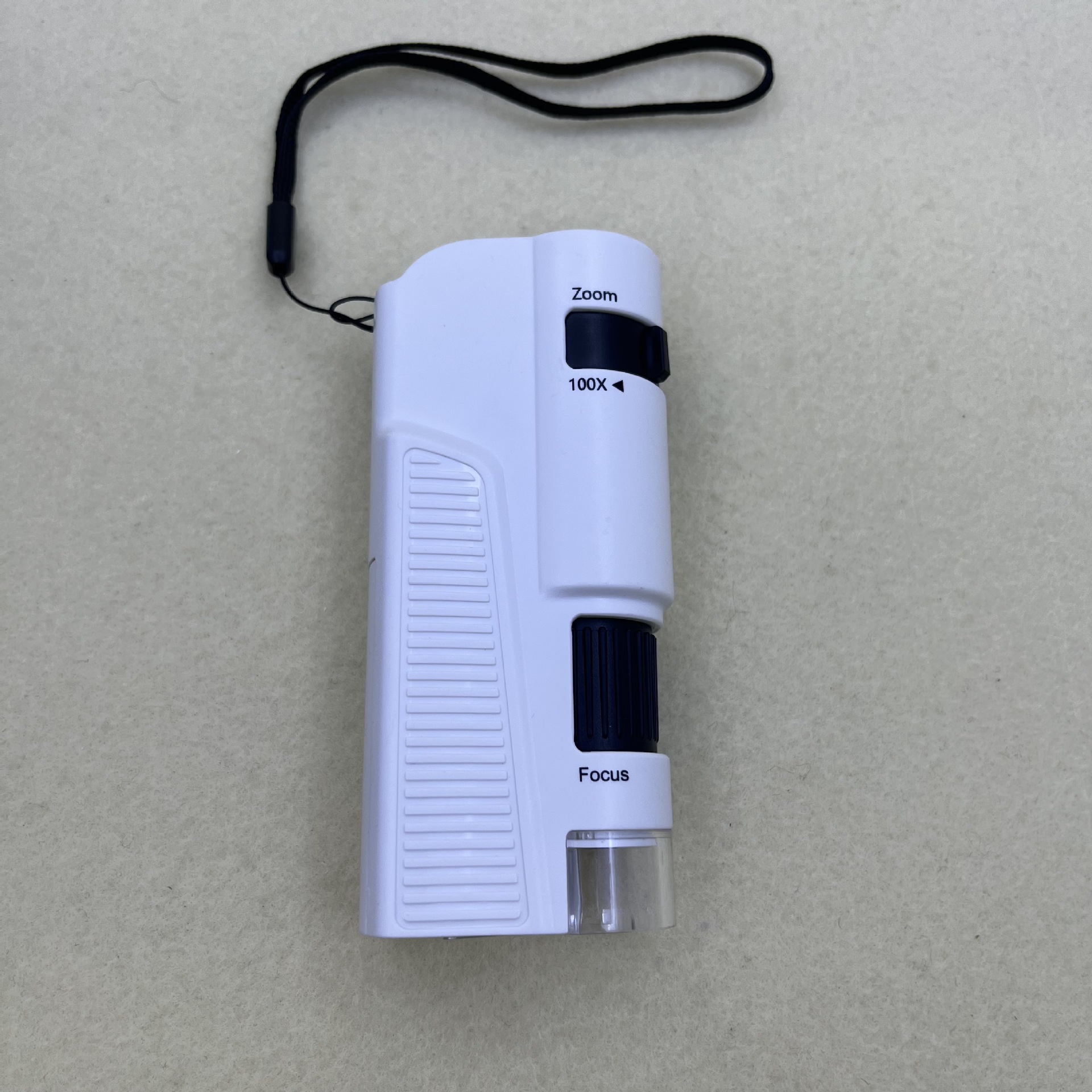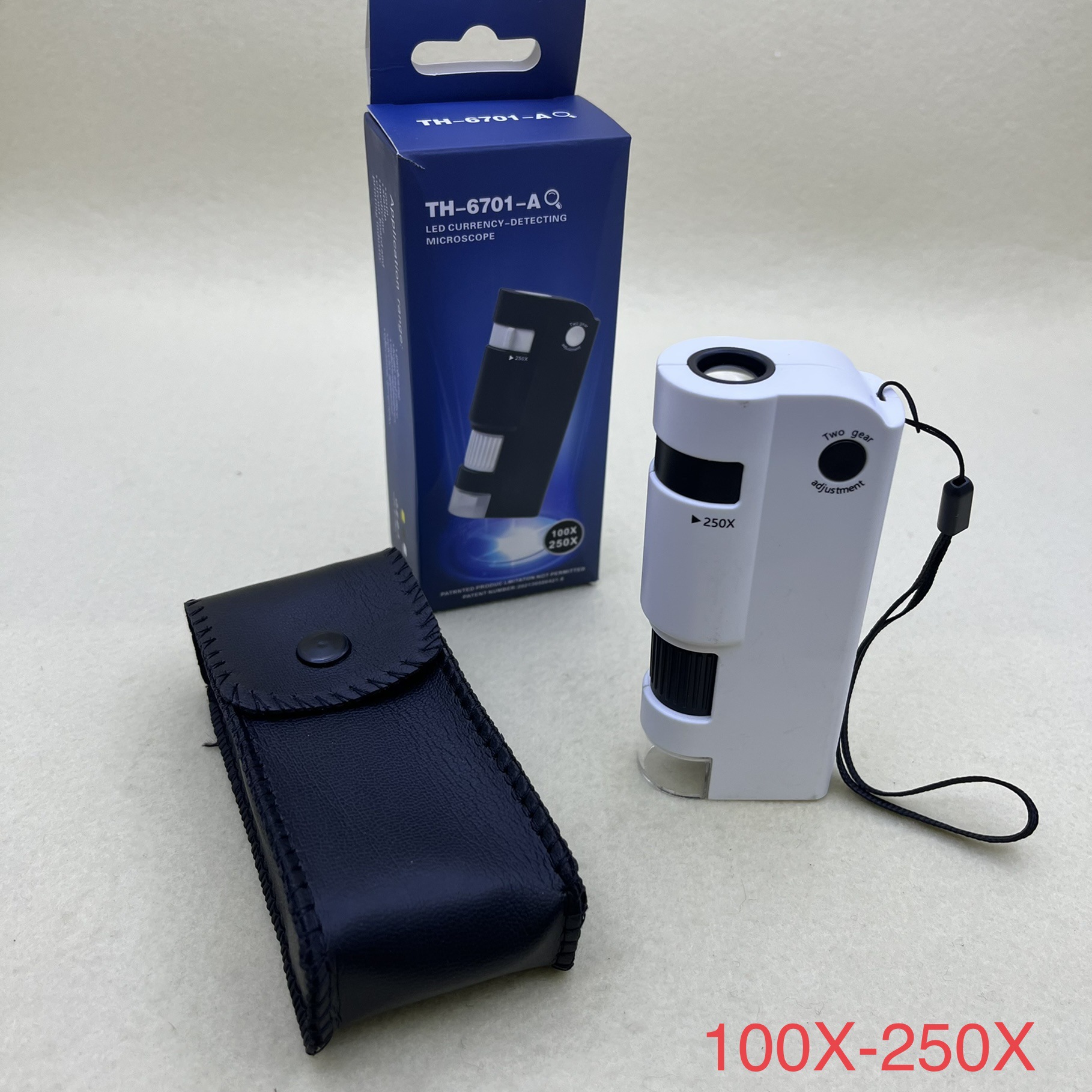 产品描述:ABS材质,亚克力镜片,100~250倍,观察时眼睛贴近目镜,倍率旋旋钮,调焦螺旋,观察时旋转调焦螺旋可调整清晰度,透明罩,观察时可获取光线,保护物镜,便携式挂绳,1个LED灯,1个UV验钞灯,电源开关控制LED灯照明和UV灯,使用3节7号电池(出厂不含)。