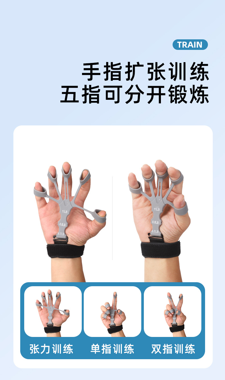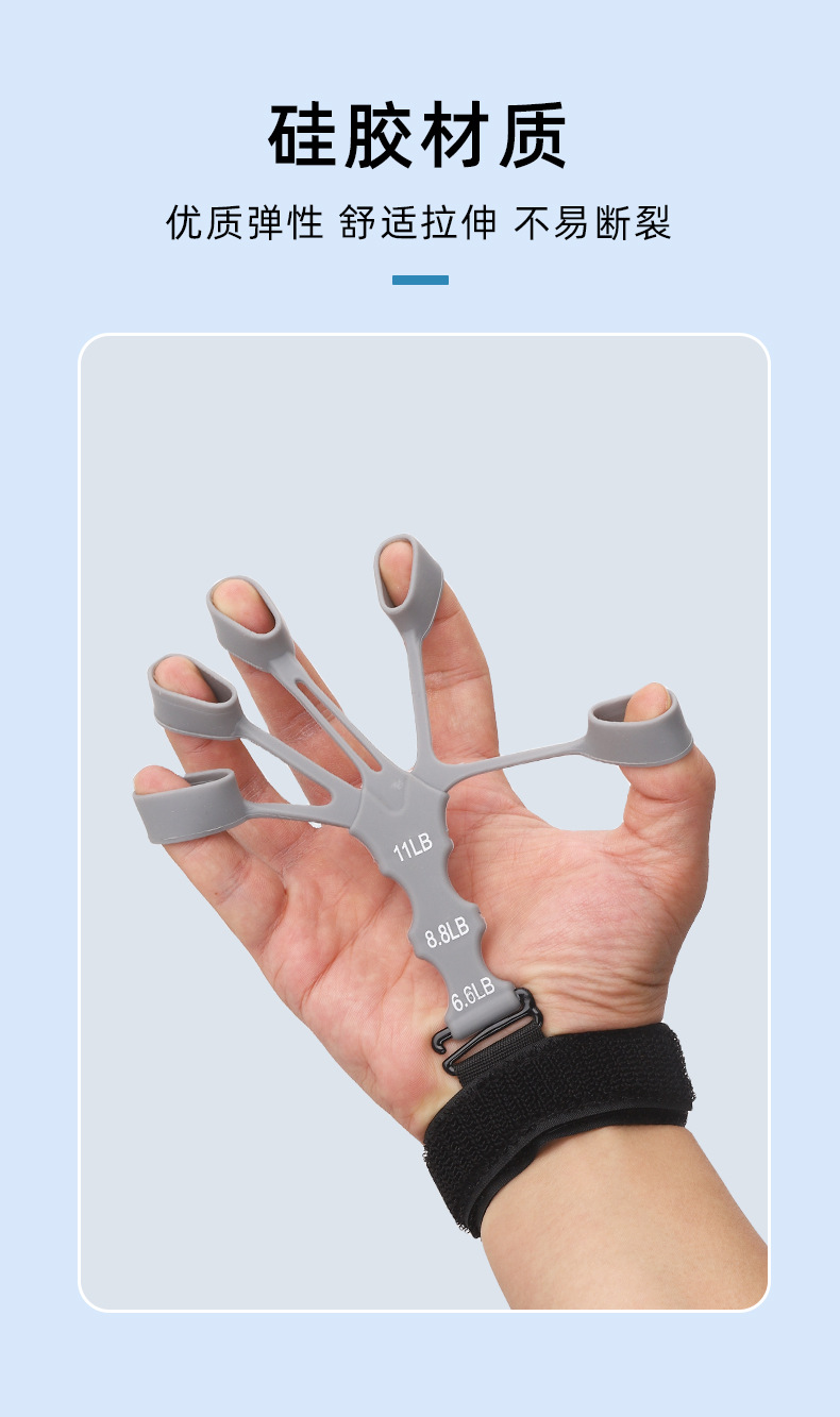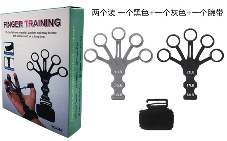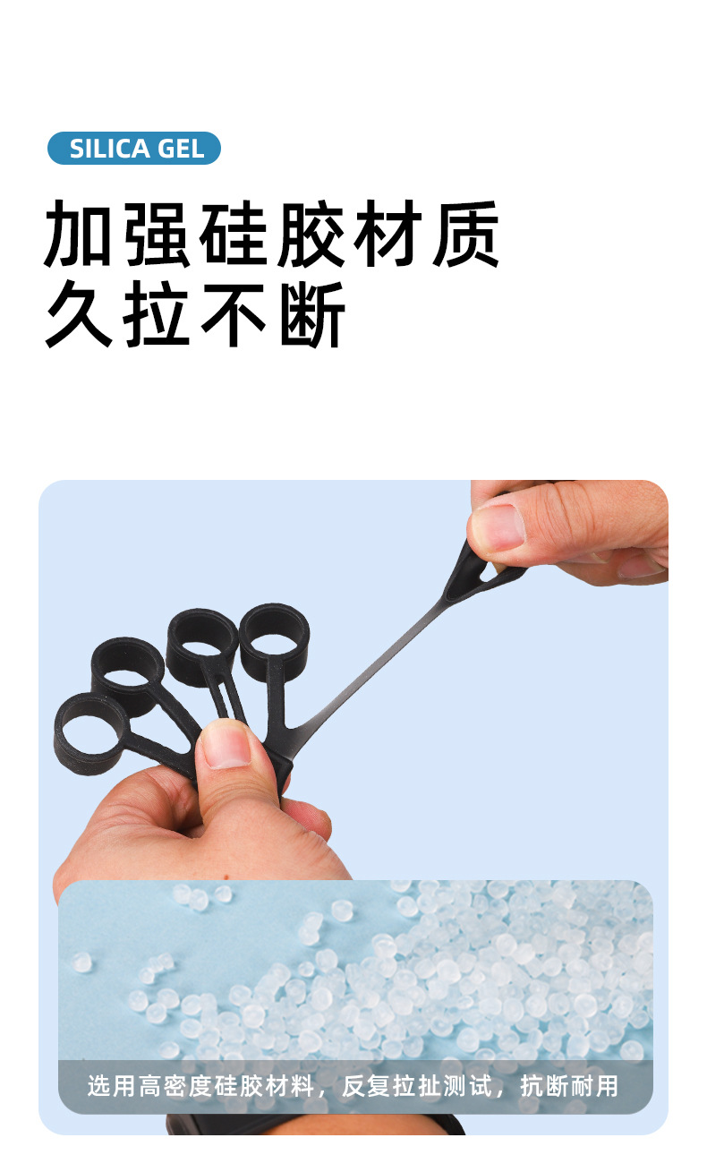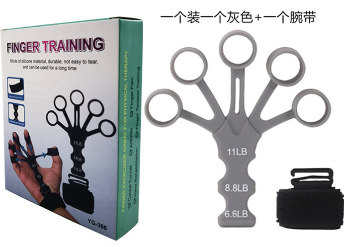 手指训练器,材质:硅胶+尼龙织带涤纶, 产品重重30克,产品尺寸15*10*1.5cm,外箱规格50*40*42cm ,装箱数量500装,一箱重量15.5KG