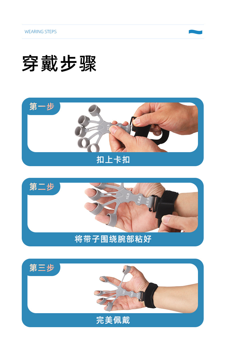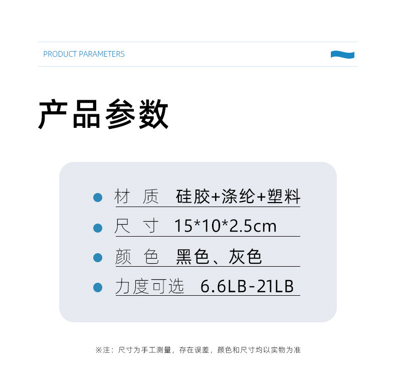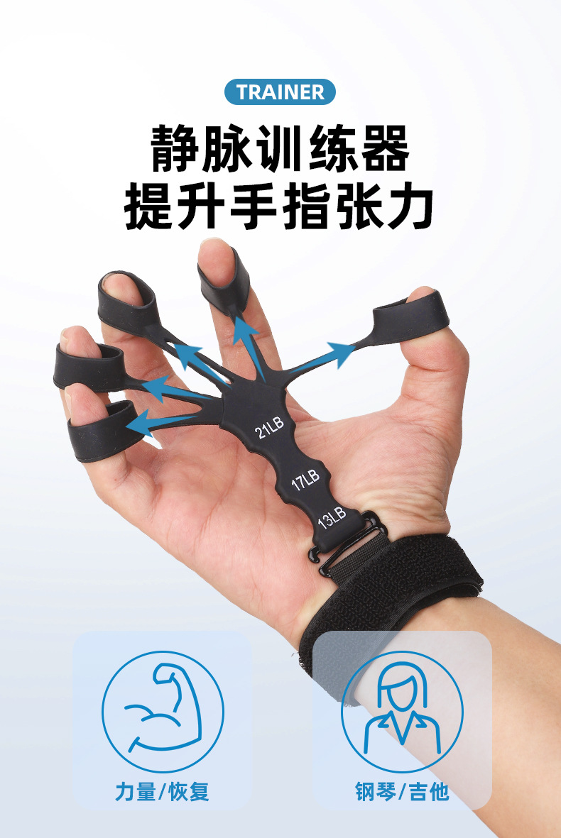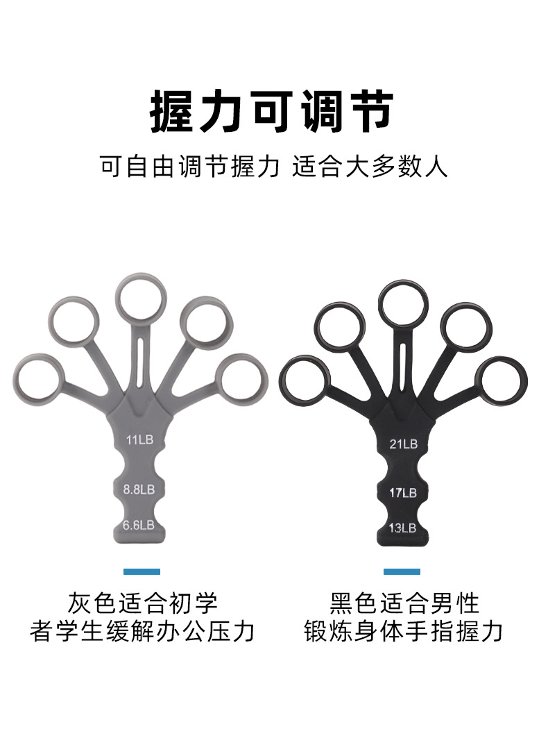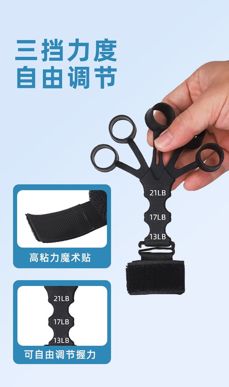 手指训练器,材质:硅胶+尼龙织带涤纶, 产品重重30克,产品尺寸15*10*1.5cm,外箱规格50*40*42cm ,装箱数量500装,一箱重量15.5KG