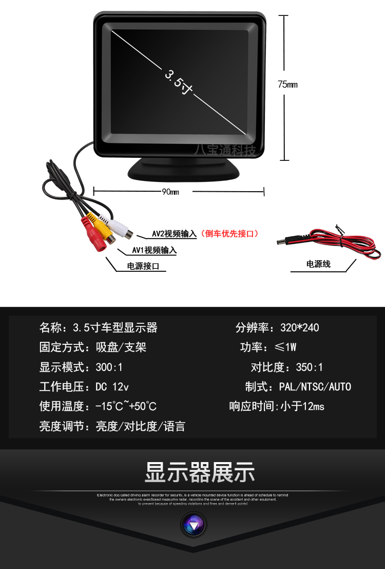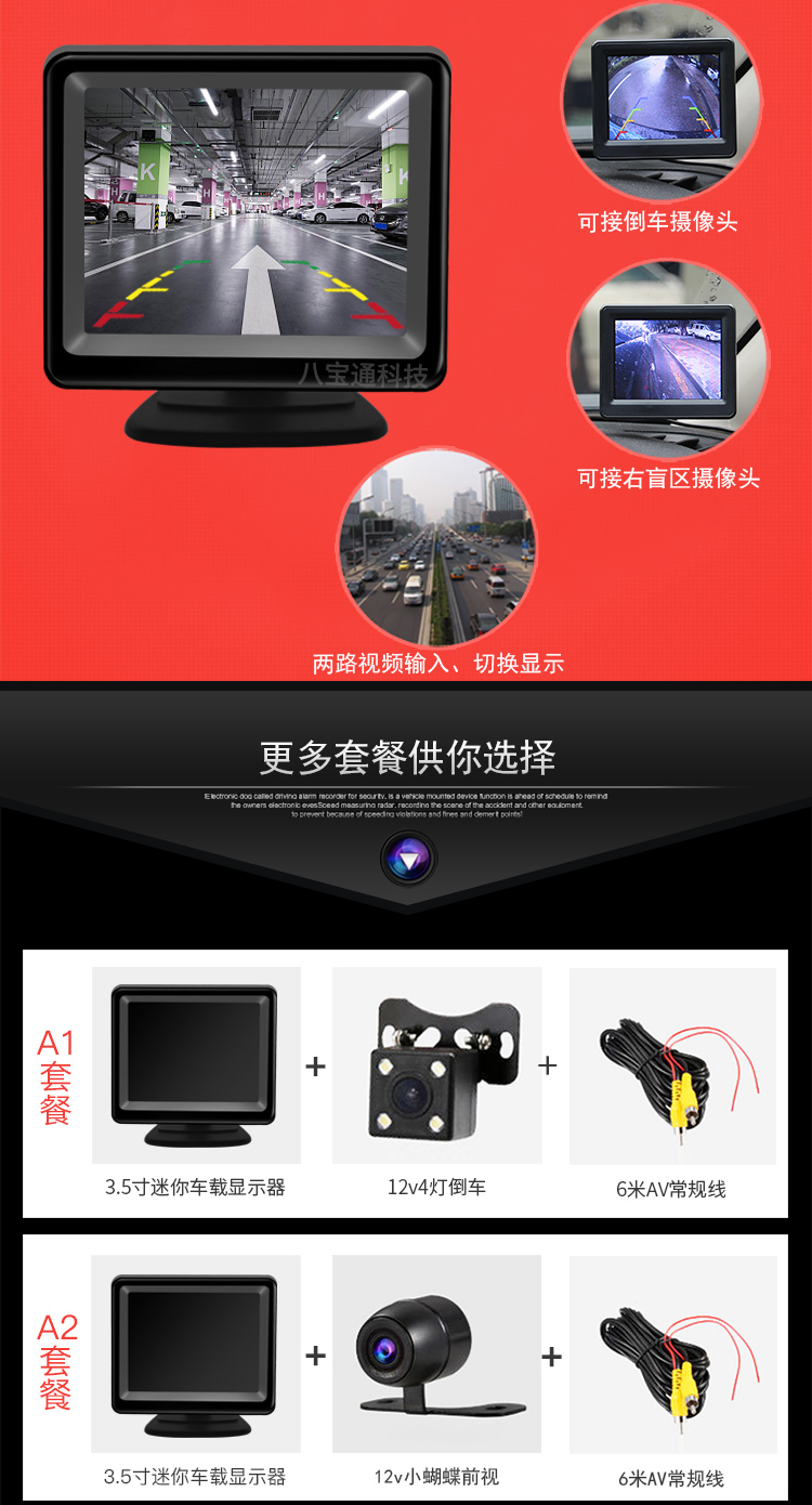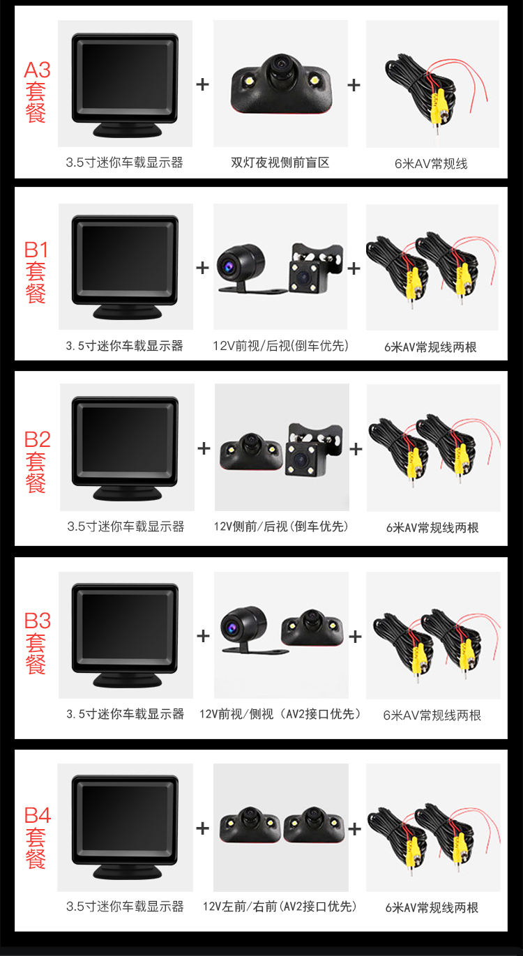 3.5inch Настольный монитор; 3.5inch Монитор на присоске; 3.5inch Монитор на присоске (экран импорта); A1 (ображение заднего вида 12 В); A2 (переднее изображение 12 вольт); A3 (12 В изображения в правой слепой зоне); B1 (вид спереди + изображение заднего вида 12 В); B2 (правая слепая зона + изображение заднего вида 12 В)