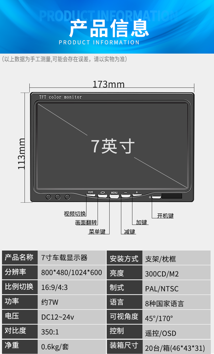 7-дюймовый автомобильный монитор HD грузовик задним ходом видео ЖК-экран 12V24V автомобиль универсальный комбайн ТВ