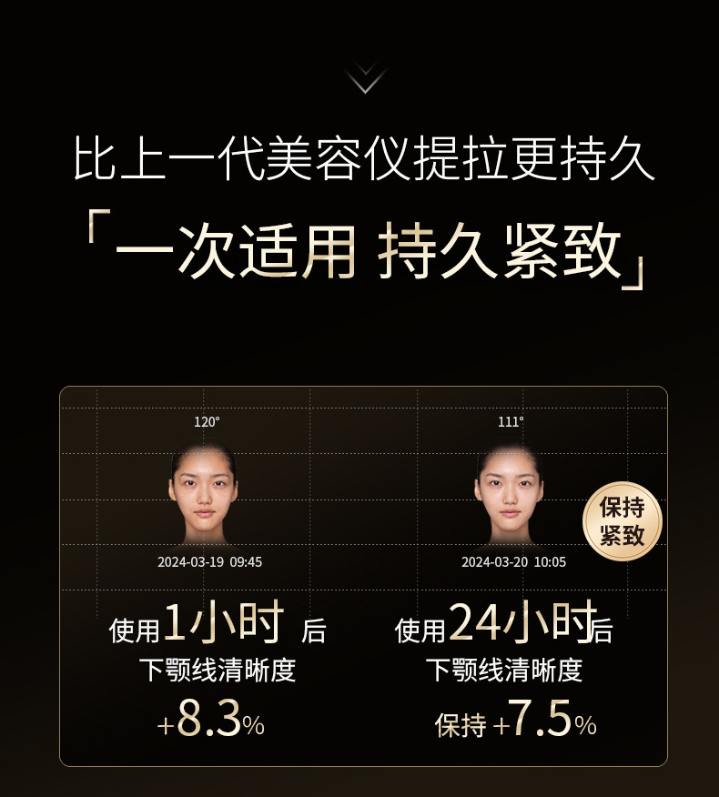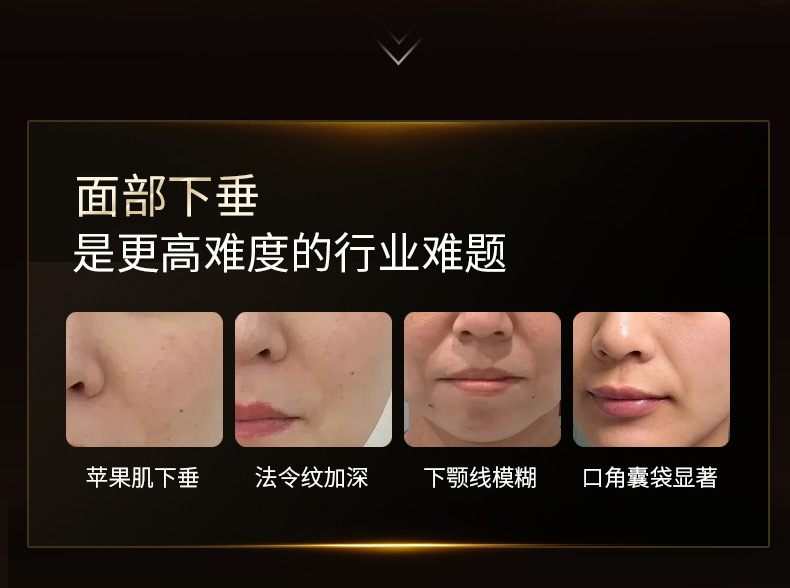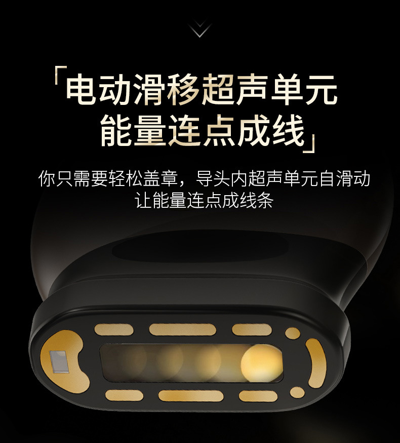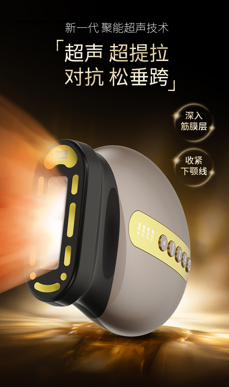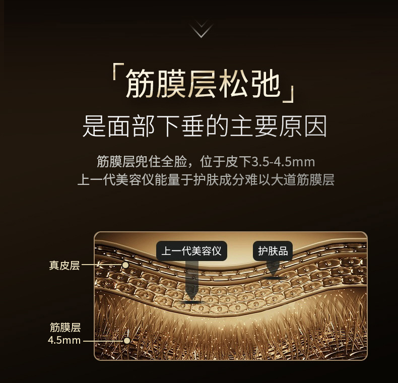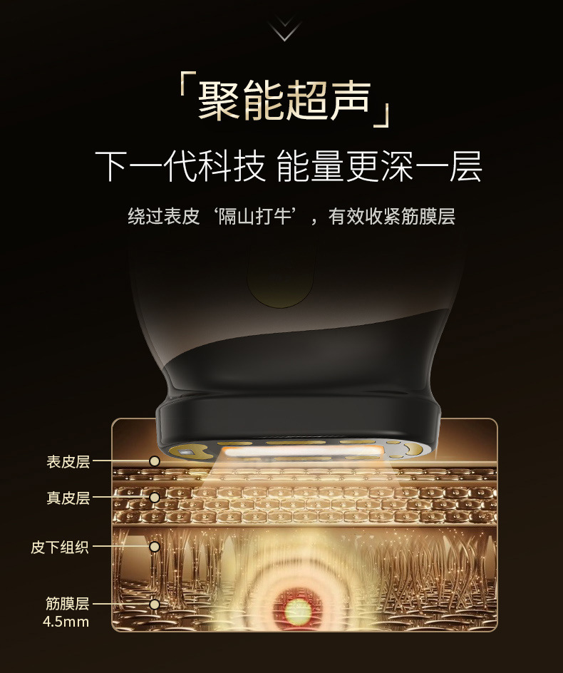 1:采用最新聚能超声波技术,精准加热筋膜层(3.5-4.5mm),自滑动超声单元,大面积作用能量连点成线,使筋膜层胶原再生,筋膜收紧,实现面部长效提拉。