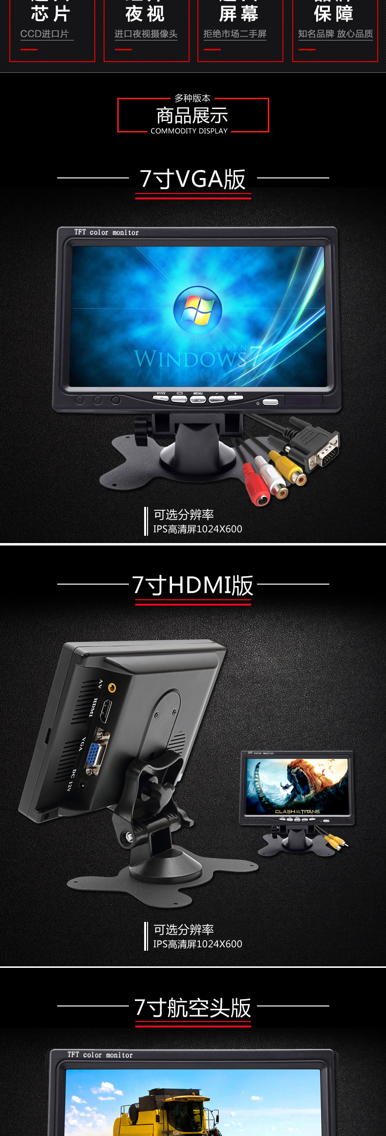 7inch Мониторинг (без источника питания); 7inch Автомобильный AV (800*480); 7inch Автомобиль AV IPS (1024*600); 7inch автомобильная авиационная головка (800*480); 7inch автомобильная авиационная головка IPS (1024*600); 7inch Мониторинг (800*480); 7inch Мониторинг + Электричество; 7inch мониторинг + звук (блок питания в комплекте); 7inch Монитор + Звук/IPS (блок питания в комплекте); 7inch VGA (источник питания 800*480); 7inch VGA (источник питания 1024*600); 7inch VGA IPS (источник питания 1024*600); 7inch HDMI три в одном/HD (блок питания в комплекте); 7inch HDMI три в одном/сверхчеткий (блок питания в комплекте); 7-дюймовый HDMI «три в одном»/IPS (блок питания в комплекте); 7inch Сенсорный конденсатор HDMI; 8inch HDMI; 10.1HDMI+MP5(1280*800); 9inch AV (1024*600 поставляется с блоком питания); 9inch VGA (1024*600 поставляется с источником питания); 10inch HDMI (1024-600); 10inch VGA+Авиация; 4.3inch голова лотоса