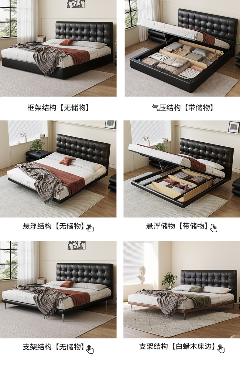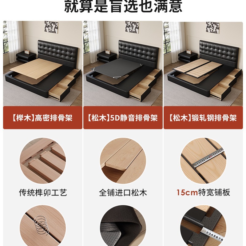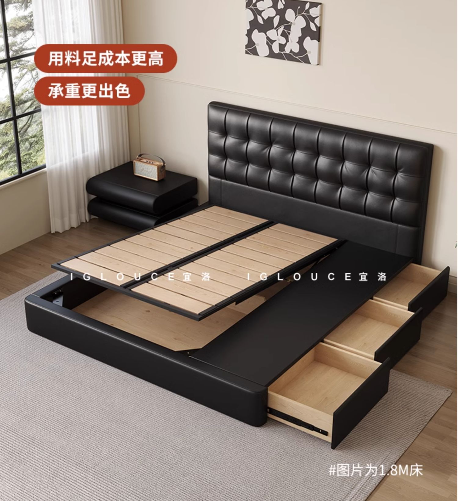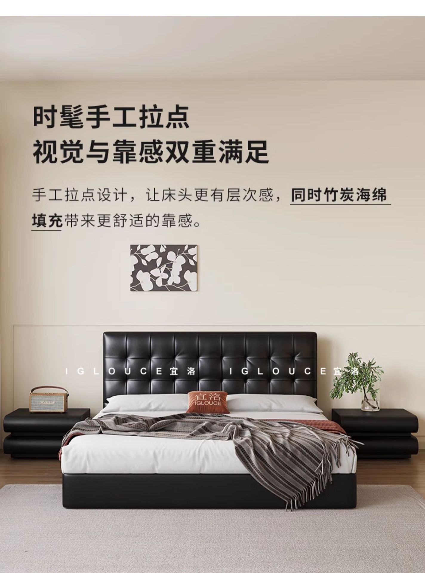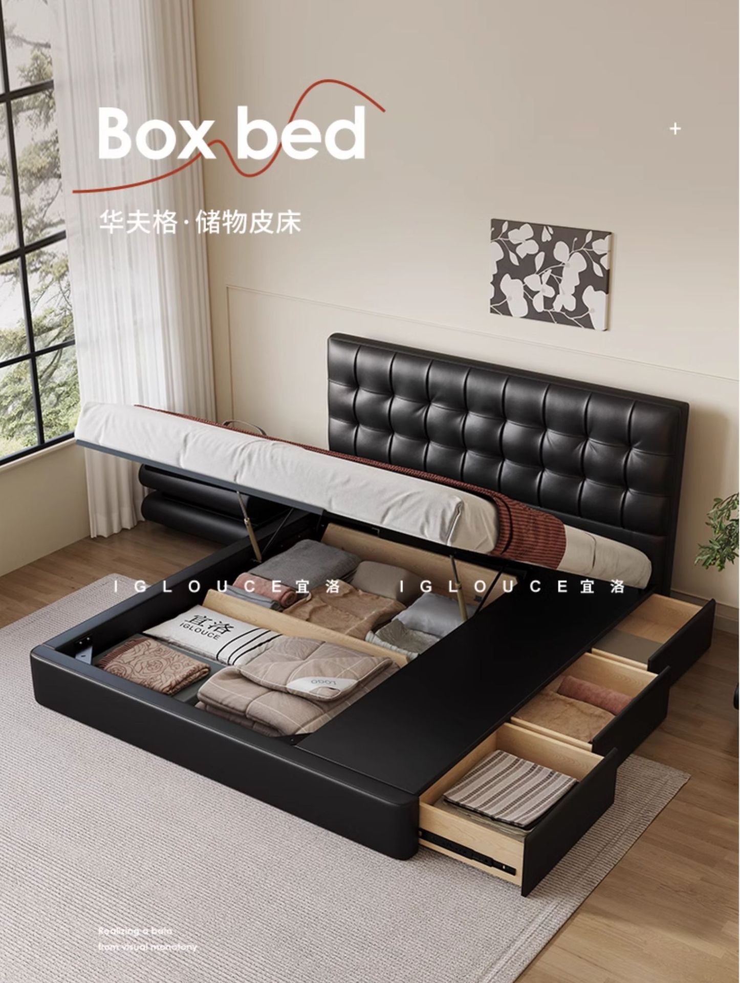 Илуо итальянская минималистская кожаная кровать Черная вафельная кровать Тонкая кровать с боковой кроватью Современная минималистская кровать с высокой коробкой для хранения